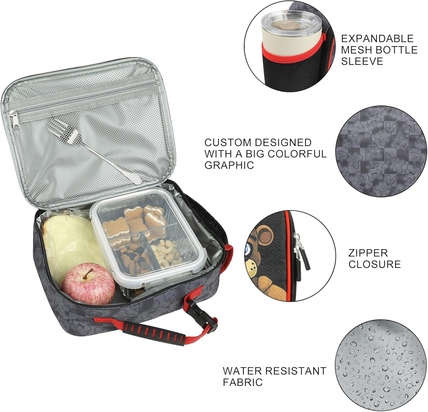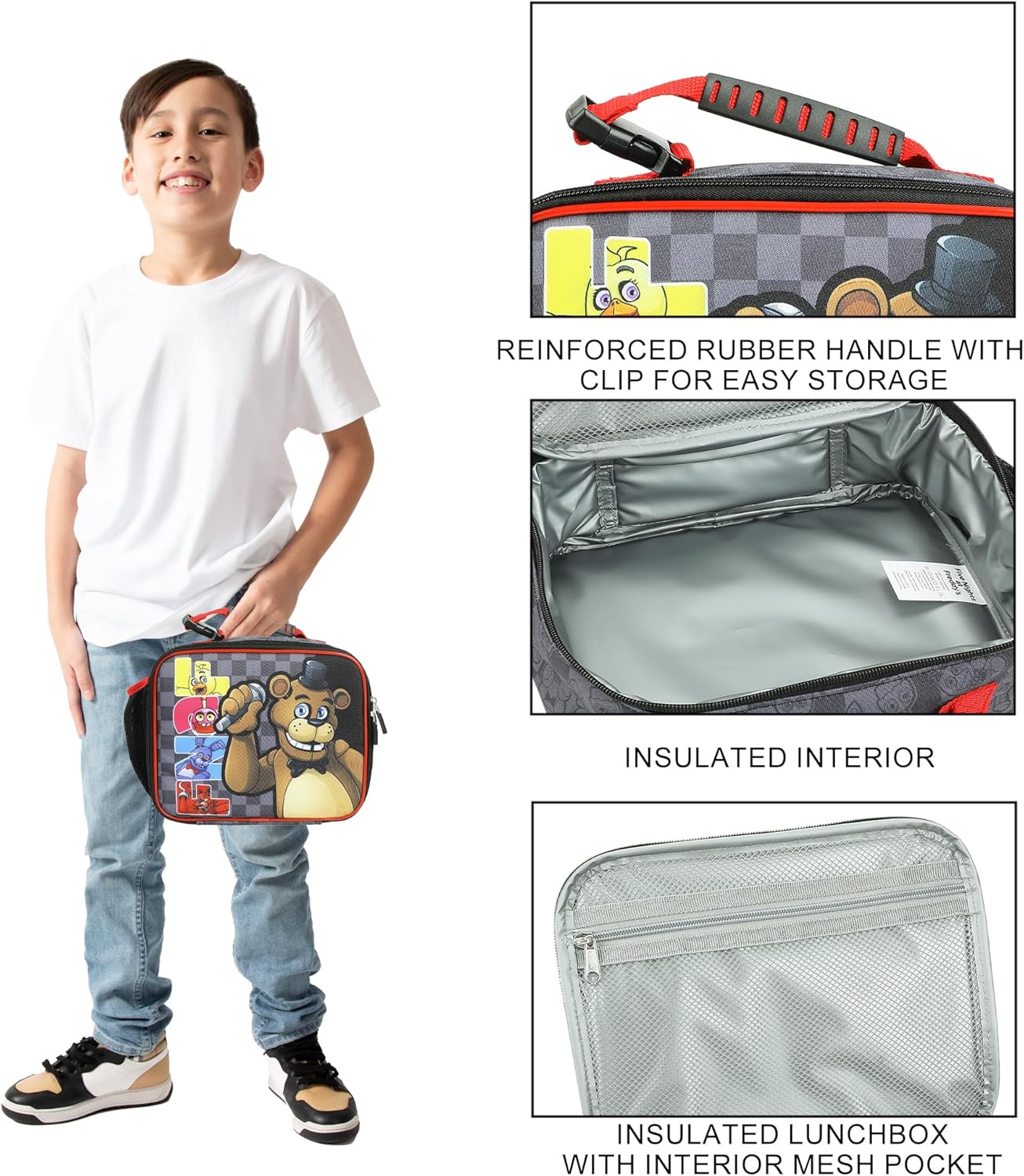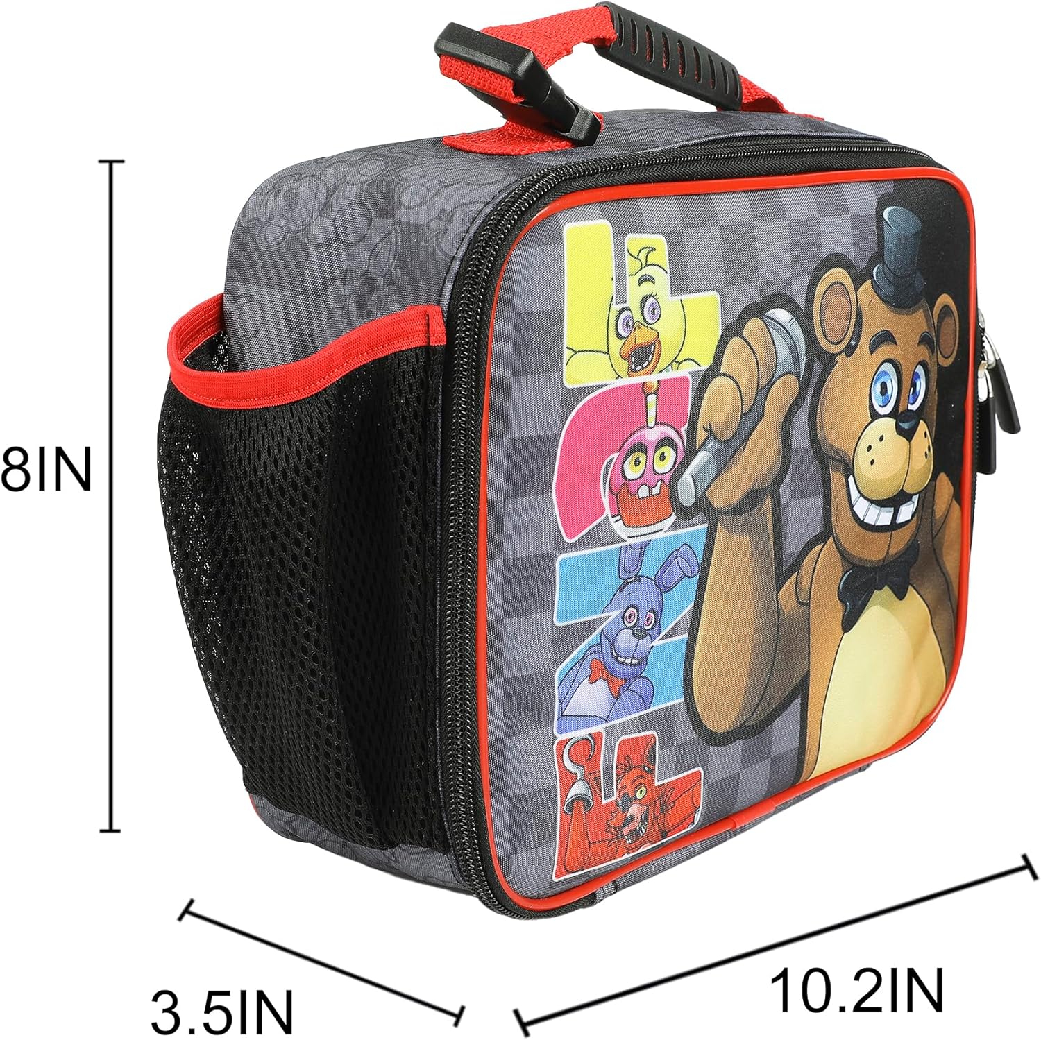 I fan di Five Nights at Freddy adoreranno questo portapranzo con licenza ufficiale, un must per ogni fan del popolare franchise di videogiochi! Progettato su misura con una grande grafica colorata di Freddy e dei suoi famigerati compagni, questo contenitore per il pranzo super cool include una maniglia per un facile trasporto e una tasca laterale in rete per riporre una bottiglia d'acqua o una bevanda preferita. Con un interno isolato e una tasca separata per tovaglioli e posate, questa scatola da 25,7 cm di larghezza x 20,3 cm di altezza x 8,9 cm di profondità mantiene pranzi e snack freddi per ore. Facile da pulire con semplici istruzioni (lingua italiana non garantita), questo portapranzo dà vita a Freddy Fazbear in modo divertente e pratico