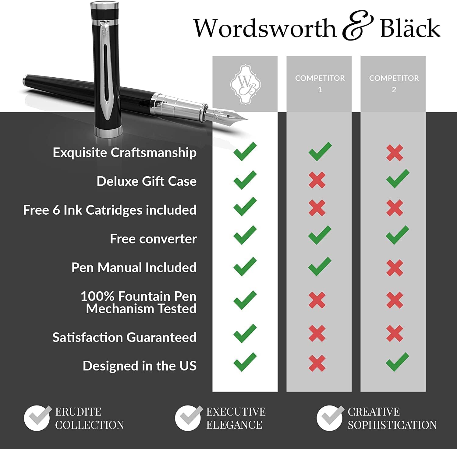 ELEGANTE E BELLEZZA, FATTO PER IMPRESSIONARE TUTTI - Il design metallico splendidamente bilanciato aggiunge un tocco di classe moderna alla tua routine quotidiana. Offre un'elevata precisione e un comfort di scrittura eccezionale per ogni occasione, insieme a uno splendido design. Estratto direttamente dalla nostra collezione Erudite, abbiamo combinato il peso di metalli superiori perfettamente ponderati ed equilibrati per un'esperienza di scrittura premium. ESPRIMITI ATTRAVERSO LA SCRITTURA SENZA SFORZO - Costruito per offrire un peso delicato perfetto sia per gli scrittori mancini che per quelli destrorsi, questo set di penne stilografiche sarà il tuo miglior strumento di scrittura che porti in giro e porti con te ovunque. Con le linee morbide, il flusso coerente, le tue linee scivoleranno sempre sulla pagina, sia che si tratti di note nella tua agenda o di scarabocchi sul lato di una pagina. SCOPRI IL SET DI PENNE STILOGRAFICHE RICARICABILE TUTTO INCLUSO - Include lussuosa penna stilografica, convertitore di inchiostro, 24 cartucce d'inchiostro e un sacchetto regalo - pronto per essere regalato. Ogni inchiostro per calligrafia e cartucce d'inchiostro per penna stilografica viene fornito in una custodia di plastica richiudibile e durerà almeno 2 settimane di uso regolare UNA SCELTA REGALO SQUISITA - Le penne stilografiche sono un regalo di classe per professionisti, manager e dirigenti nuovi e avanzati in ogni settore. L'inchiostro della penna per calligrafia è stato prodotto con cura utilizzando solo coloranti naturali che conferiscono alla composizione un pH neutro, naturale e non tossico. GARANTITO - Tutti i nostri inchiostri per penne stilografiche sono testati sia per l'equilibrio che per un'esperienza senza fuoriuscite per GARANTIRE un flusso di inchiostro confortevole e uniforme. Soprattutto, il tuo acquisto è protetto da una GARANZIA DI