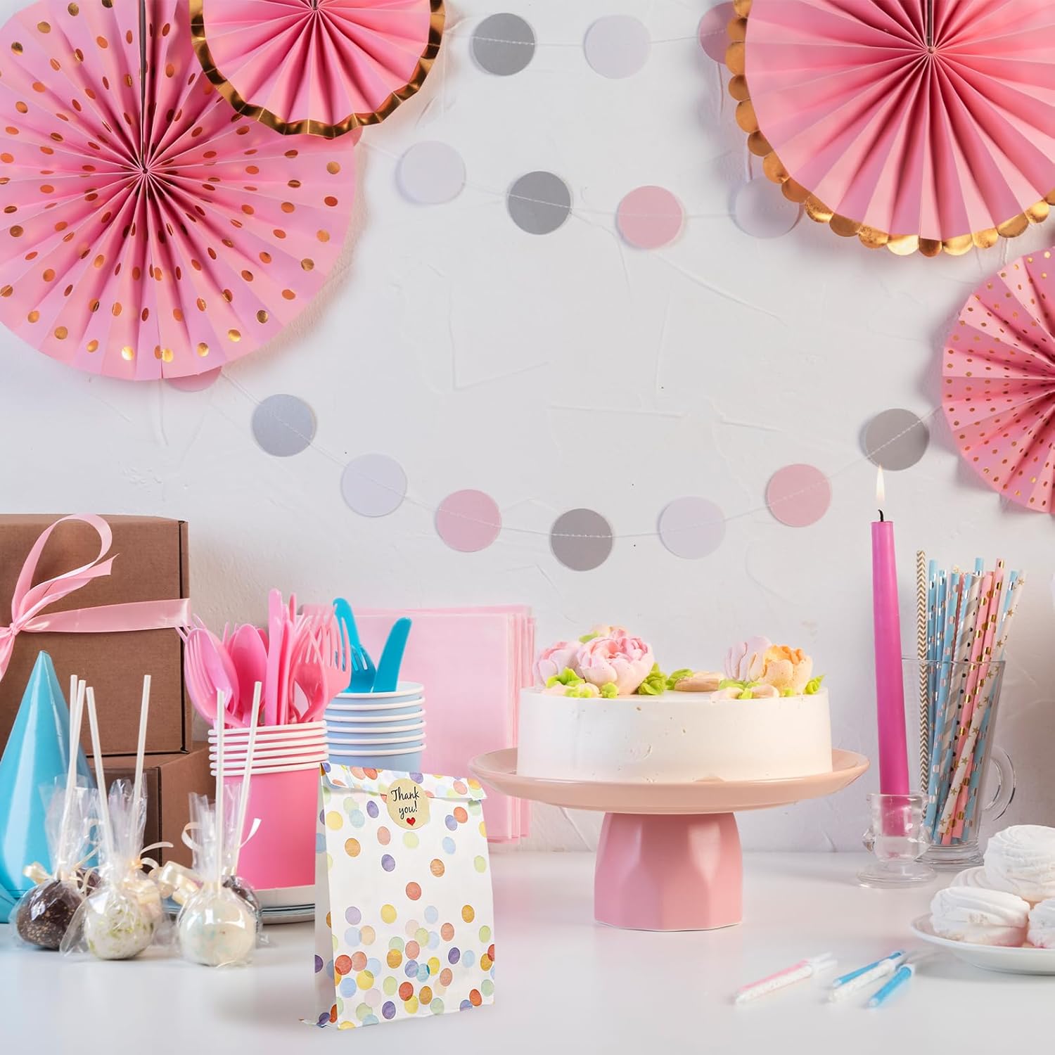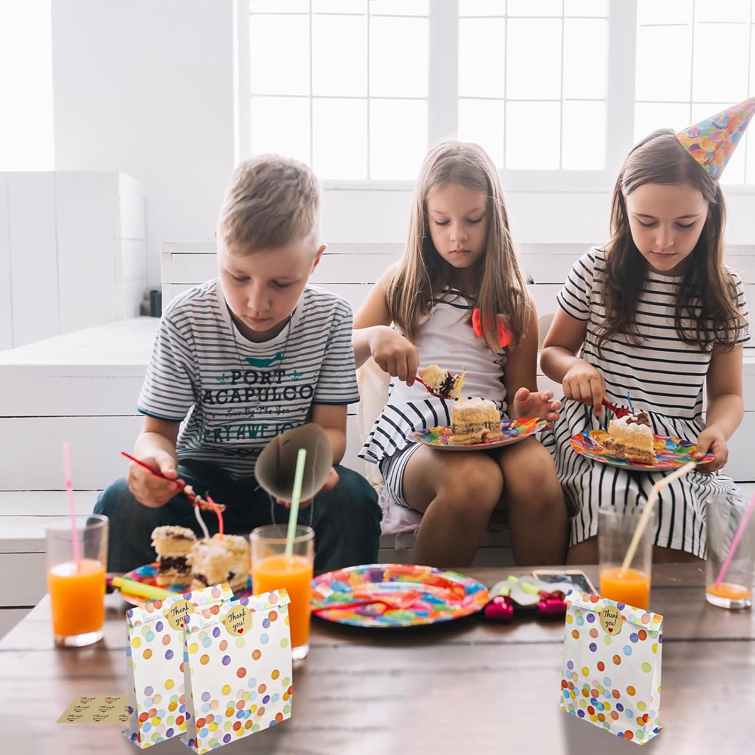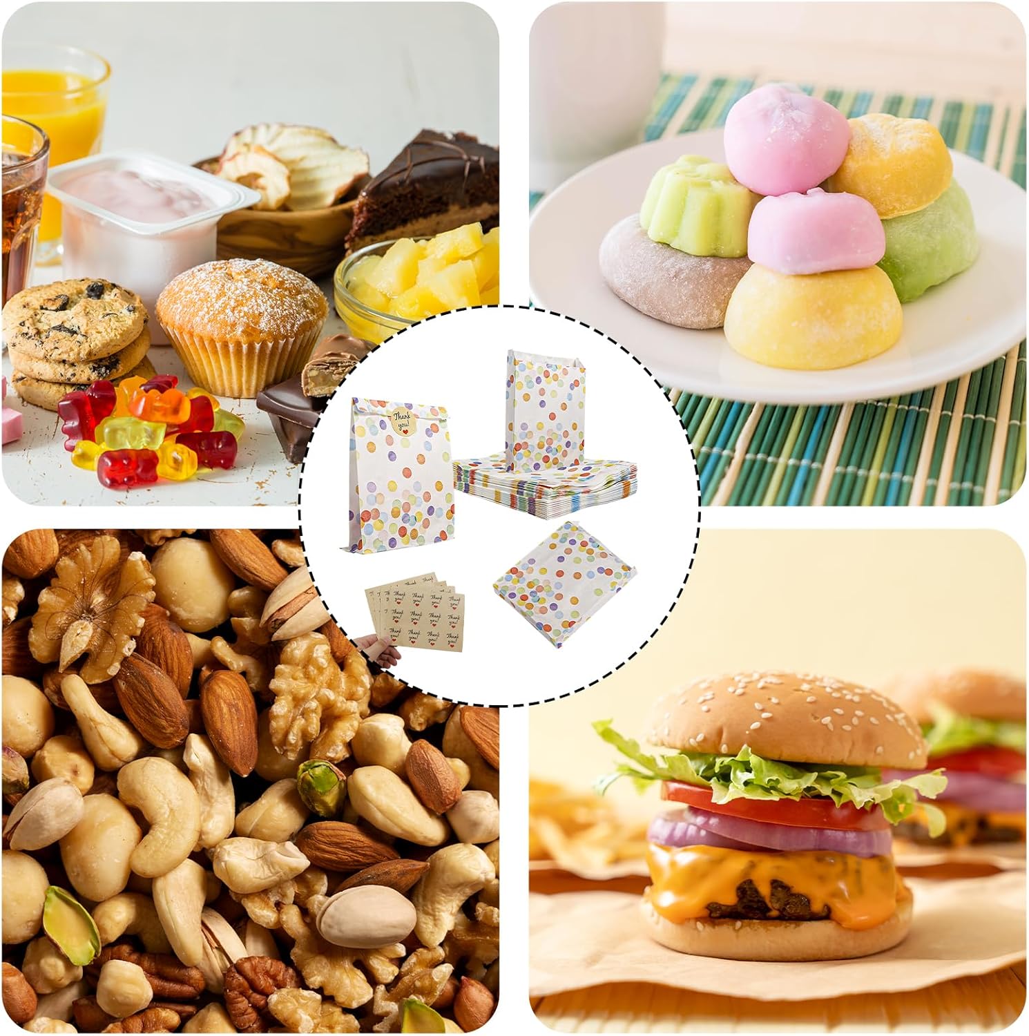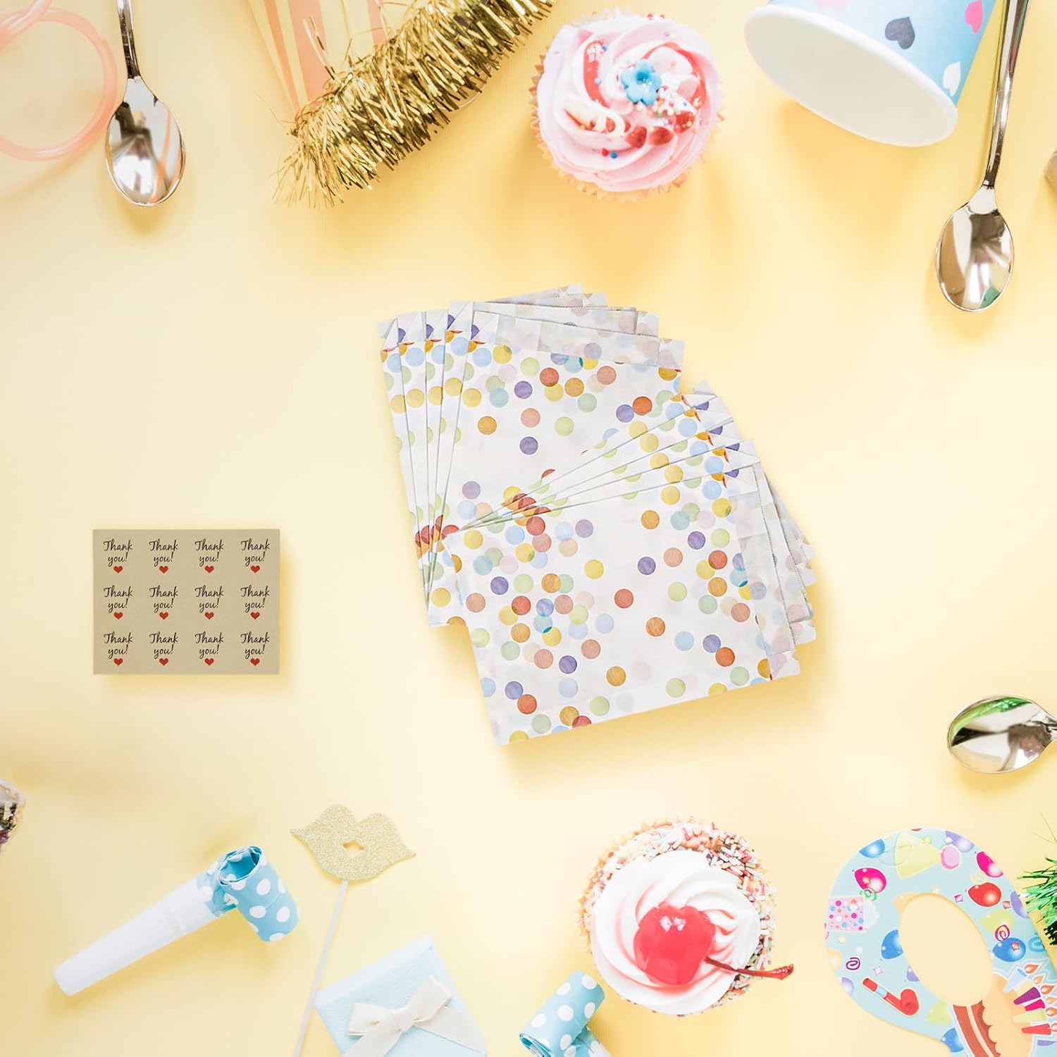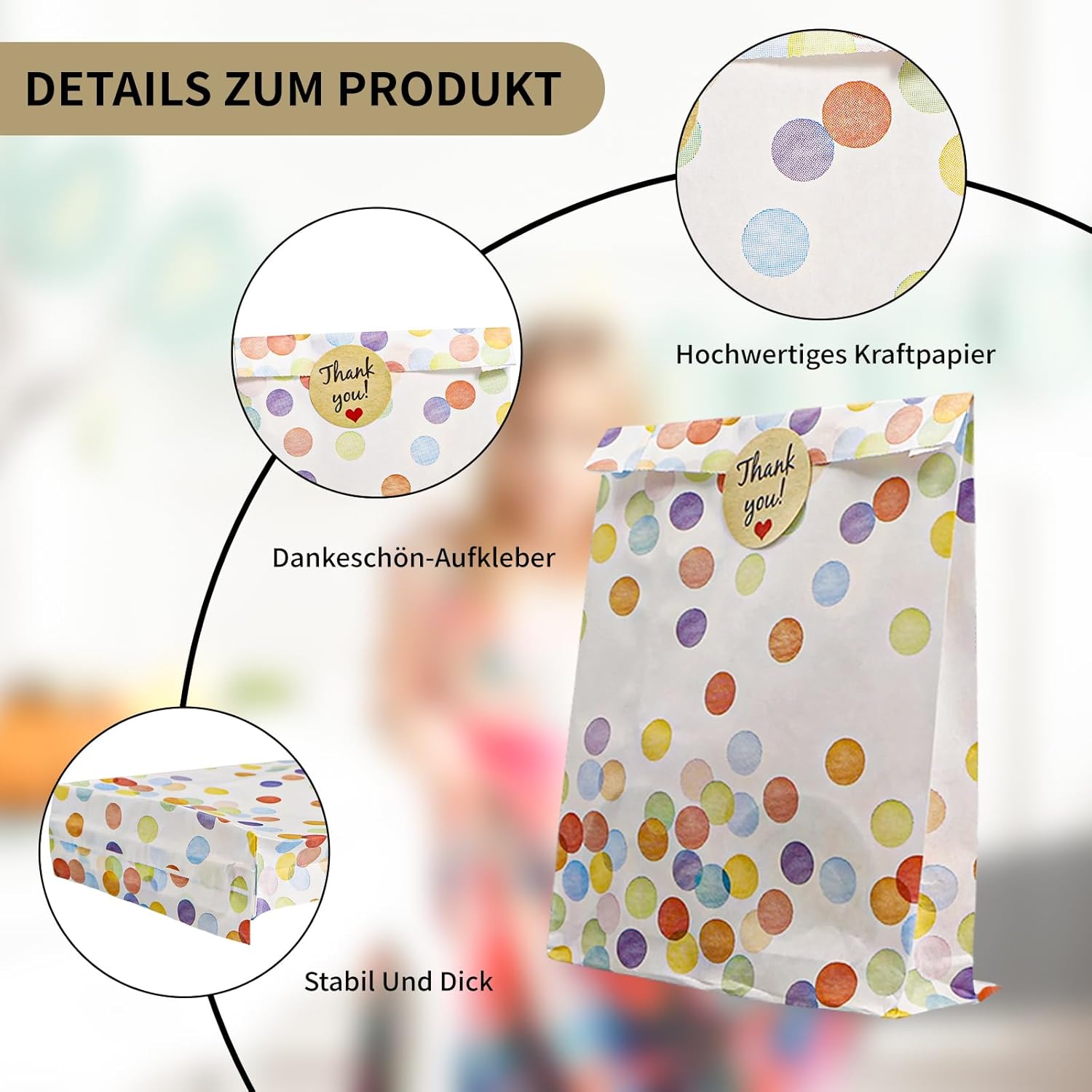 Set di sacchetti regalo: riceverai un ampio set di sacchetti regalo con 40 sacchetti di carta per il compleanno dei bambini, completati da 48 adesivi di ringraziamento. Le buste misurano 19 x 13 x 3,5 cm (5,71 x 4 x 1,05 pollici), mentre il diametro degli adesivi è di 3,5 cm (1,05 pollici). Con questa ampia quantità e dimensioni ideali, sei ben attrezzato per soddisfare tutte le tue esigenze quotidiane. Design vivace a pois: i nostri sacchetti regalo presentano un attraente design a pois nei vivaci colori dell'arcobaleno. Questo modello classico e allegro porta colore e gioia ad ogni celebrazione e rende le borse una vera attrazione. Che si tratti di una festa per bambini o di un'occasione speciale, queste borse sono pratiche e decorative. Robusta carta kraft: realizzate con carta kraft di alta qualità, queste borse per compleanno non sono solo robuste ma anche rispettose dell'ambiente. Il materiale è spesso, quindi non si strapperà o si deformerà facilmente. Inoltre, le buste sono resistenti all'acqua e all'olio, il che le rende ideali per una varietà di contenuti, inclusi snack e caramelle. Non ci sono limiti alla tua creatività! Pratici adesivi adesivi: gli adesivi di ringraziamento inclusi nel set garantiscono una finitura perfetta. Sono facili da attaccare e offrono un modo affidabile per chiudere in modo sicuro i sacchetti regalo. Questi graziosi adesivi non solo danno alle tue borse un tocco personale, ma colpiscono anche per le loro proprietà adesive. Usi versatili: i sacchetti per feste sono estremamente versatili e sono ideali per confezionare snack, noccioline, dolci o altre piccole sorprese. Sono ideali per matrimoni, feste di compleanno, eventi scolastici e molte altre occasioni. Rendi ogni occasione speciale e memorabile con questi graziosi sacchetti regalo!