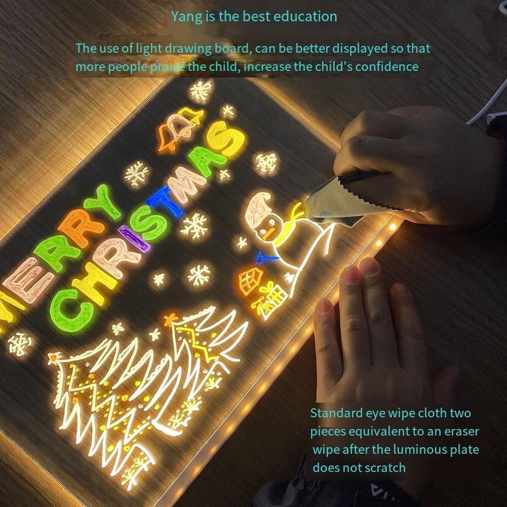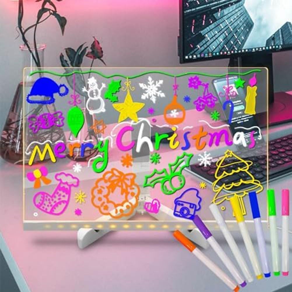Opzioni di colori vivaci: la bacheca LED presenta una varietà di colori vivaci, che la rendono perfetta per creare messaggi e disegni accattivanti che si distinguono in qualsiasi ambiente. Utilizzo versatile: progettata per molteplici applicazioni, questa bacheca in acrilico è adatta per disegni, promemoria o esposizioni creative dei bambini, migliorando sia l'ambiente domestico che quello aziendale. Supporto regolabile: la lavagna è dotata di un supporto regolabile, che consente agli utenti di posizionarla nell'angolazione preferita per una visibilità ottimale, sia su una scrivania che a parete. Facile da pulire: la cancellazione a secco consente una pulizia semplice, che consente di aggiornare rapidamente i messaggi o le opere d'arte senza problemi o problemi. SET COMPLETO: Questo prodotto include sette penne colorate perfette per scrivere o disegnare, fornendo tutto il necessario per iniziare immediatamente a esprimere la tua creatività.