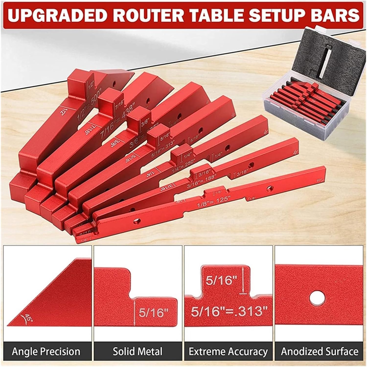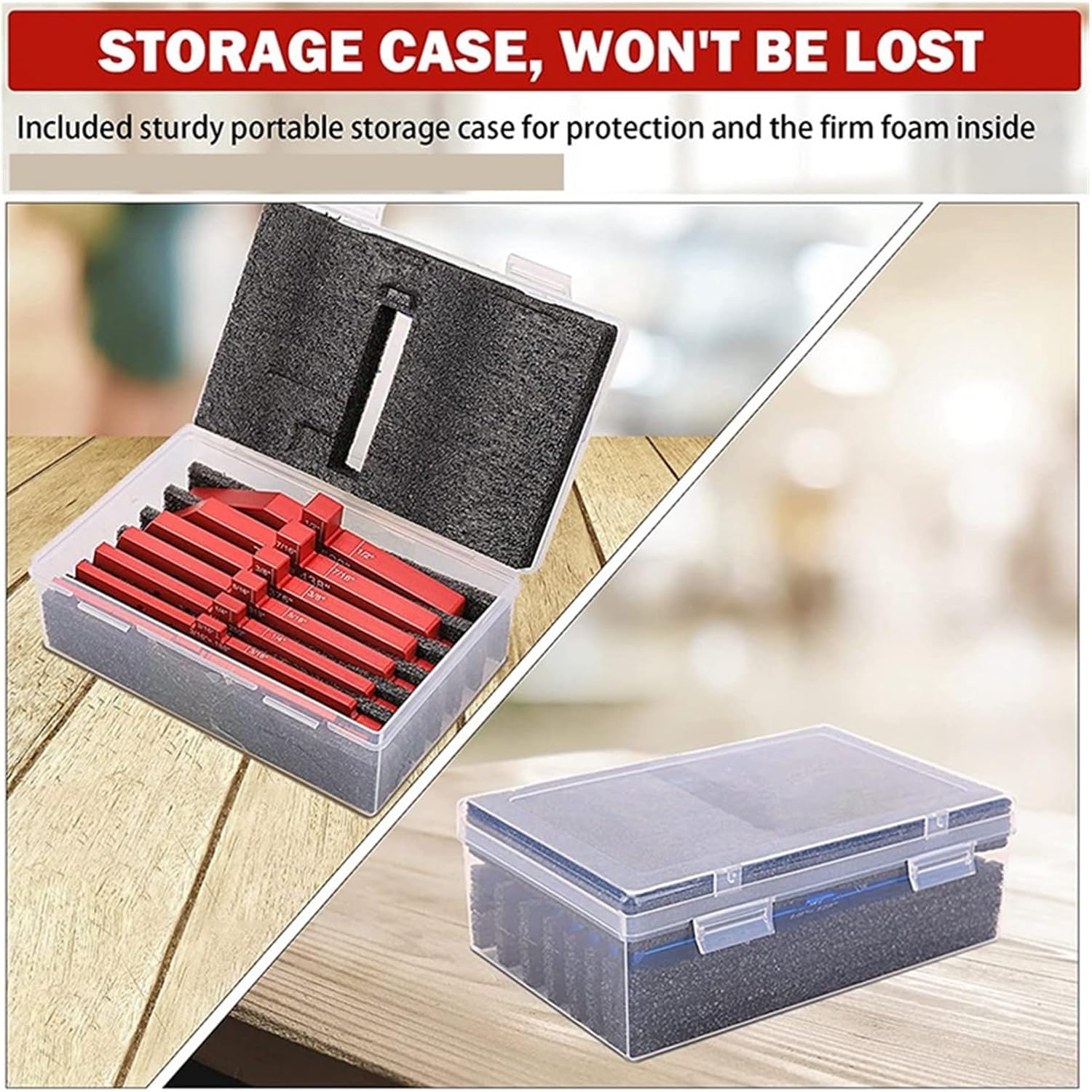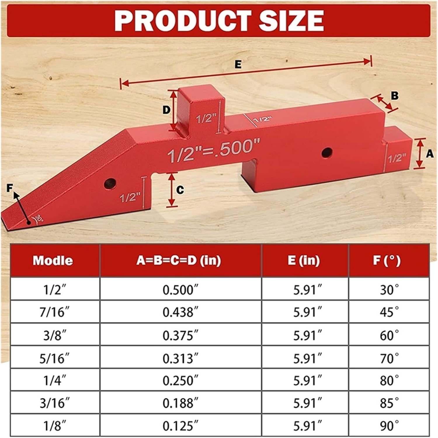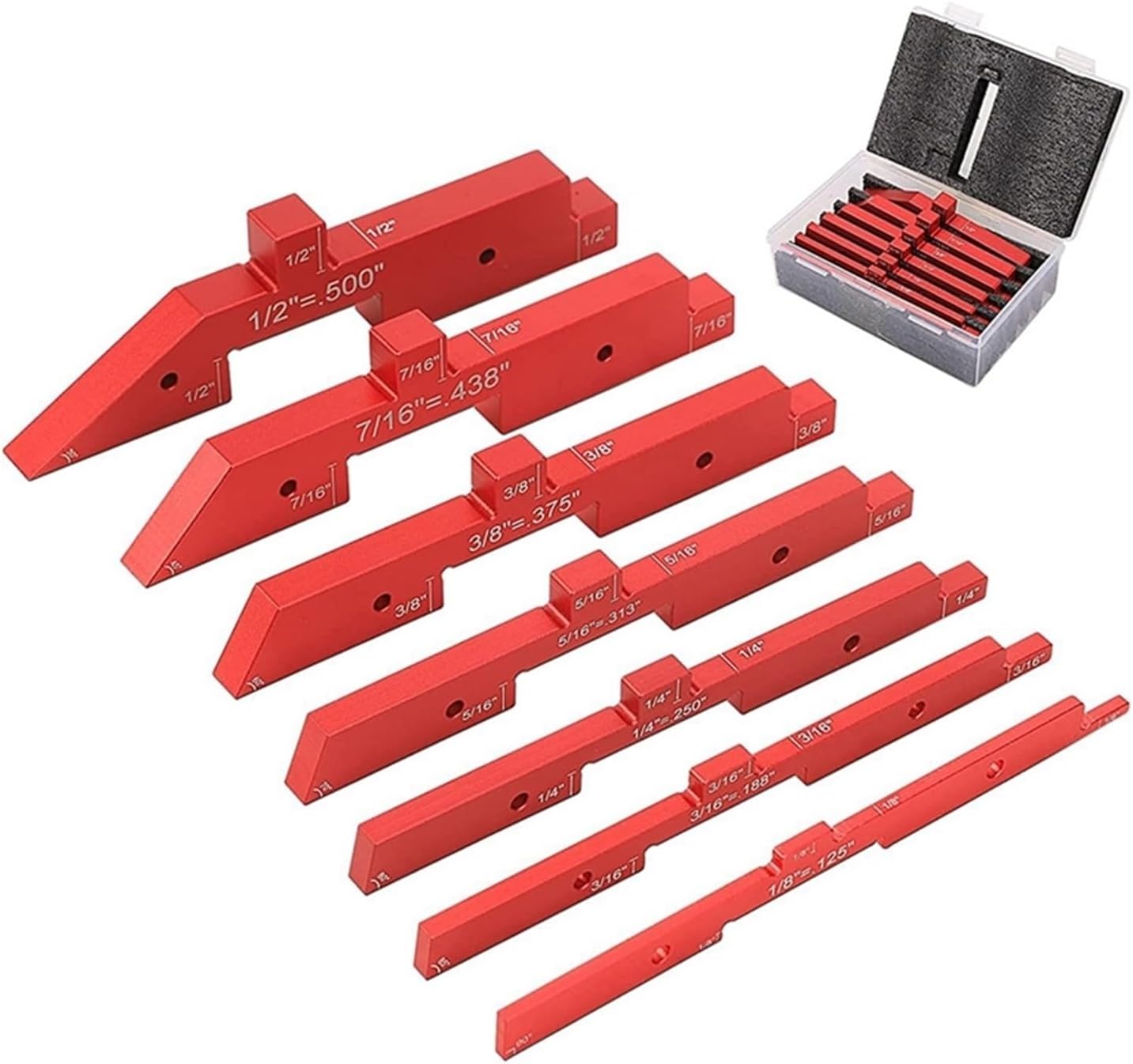 Ciascun blocco ha uno spessore diverso nel set di blocchetti di calibro da 7 pezzi. Lo spessore, l'altezza e la profondità di ciascun misuratore hanno le stesse dimensioni. Può misurare profondità, altezze fisse o impilarle in base al loro spessore per un'ampia variazione o dimensioni. Molto flessibile e pratico. 4 calibri in 1. Il set di calibri da tavolo del router può essere utilizzato come misuratore di altezza, calibro di profondità, calibro quadrato e calibro angolare. È una combinazione di misuratori di profondità e altezza tradizionali e blocchi di costruzione tradizionali. Misure precise del misuratore di altezza del blocco di configurazione: 1/8 di pollice, 3/16 di pollice, 1/4 di pollice, 5/16 di pollice, 3/8 di pollice, 7/16 di pollice e 12 pollici I blocchetti di misura possono essere utilizzati singolarmente impilati, ci sono centinaia di combinazioni, sufficienti per soddisfare le vostre diverse esigenze. Lo strumento per mitra da 7 pezzi in lega di alluminio, anodizzato con una finitura liscia può proteggere meglio le mani, le punte del router e la sega da tavolo. I blocchi di installazione per la lavorazione del legno con eccellenti etichette da intaglio, Clear non sbiadiscono mai, il che lo rende facile da leggere. Una custodia è inclusa, quindi è più protetta durante la spedizione.