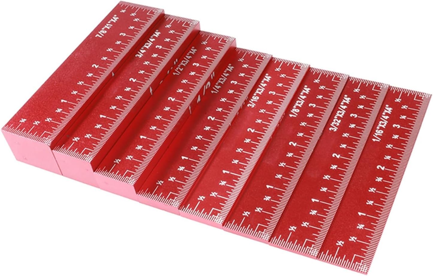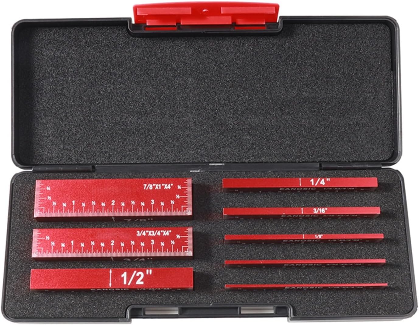Dimensioni: 7/8", 3/4", 1/2", 3/16", 1/8", 3/32", 1/16". Materiale: realizzato in lega di alluminio per utensili di alta qualità antistress contro la distorsione, rettificato con precisione e temprato. Applicazione: facile da usare nel bloccaggio di precisione di parti in alesatura, fresatura, stampa, lavori di assemblaggio, ecc. Facile da riporre: il set viene fornito in una custodia di plastica per una facile conservazione, protezione e trasporto. Confezione: blocchi paralleli da 8 pezzi.