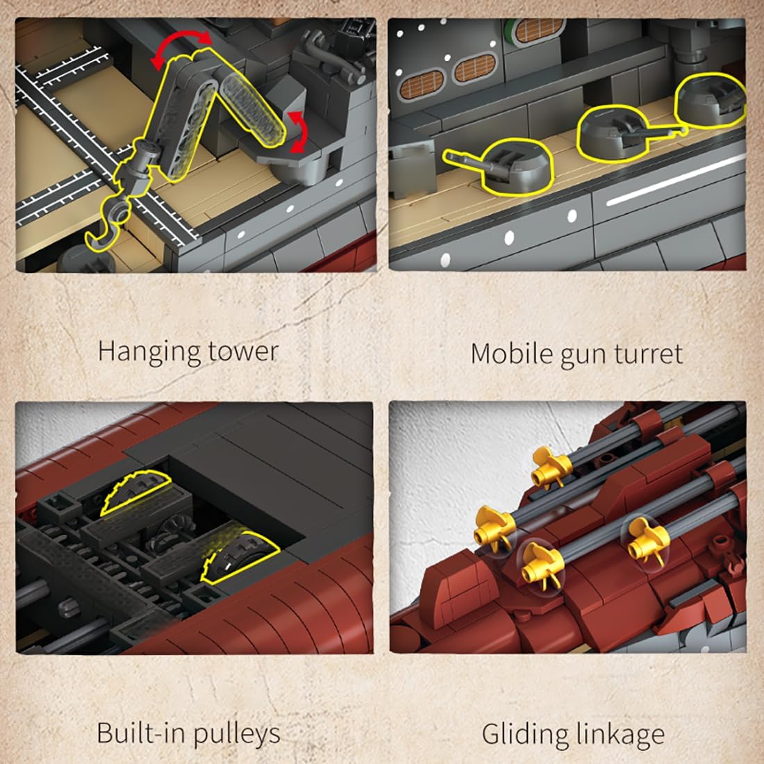 Altamente replicato: questo set di costruzione è basato sulla corazzata di classe Queen e ricrea fedelmente tutto, dallo scafo e dalla struttura del ponte alle torrette e agli alberi. I giocatori verranno trasportati indietro nel tempo, all'era della guerra navale, quando le navi da guerra regnavano sovrane. Set completo di accessori: oltre al set dell'edificio principale della corazzata, contiene anche diversi piccoli aerei, barche e altri accessori che arricchiscono la scena dell'edificio. I giocatori possono simulare varie battaglie navali, come il lancio di navi da guerra e il decollo e l'atterraggio di aerei. Mattoncini di alta qualità: il set è realizzato con mattoncini di alta qualità e presenta una superficie densa e priva di sbavature, che garantisce un processo di costruzione regolare e una lunga durata. Incoraggia le abilità pratiche e di pensiero: durante il processo di costruzione, i giocatori devono seguire i passaggi per assemblare ciascun componente dallo scafo base alla sovrastruttura. Ciò non solo rafforza le abilità pratiche, ma promuove anche il pensiero spaziale e logico. Valore collezionistico ed espositivo: il modello finito della corazzata Queen Class attira davvero l'attenzione e un tesoro raro per gli appassionati militari e i collezionisti di costruzioni. Visualizzarlo a casa o in ufficio mette in risalto il tuo gusto unico.