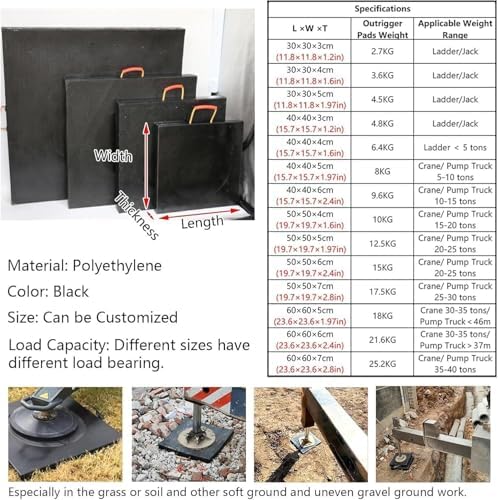 Materiale ----- I cuscinetti sono realizzati in polietilene, costruiti per durare, resistere all'usura e allo strappo; resistenti ai raggi UV, alle intemperie, non conduttivi, impermeabili. Aiutano a creare una superficie più liscia e piana per il tuo cric. Adattabilità alle superfici antiscivolo ----- I piedini stabilizzatori sono compatibili con diverse superfici e terreni, distribuendo il peso in modo uniforme. Impediscono alle gru di affondare e di sbilanciare su terreni morbidi. Grazie ai nostri piedini stabilizzatori, puoi avere un appoggio sicuro. Ampie applicazioni ----- I blocchi di sollevamento possono essere impilati e posizionati in più aree per facilitare il livellamento e la stabilizzazione. Offrono una configurazione stabilizzante per attrezzature pesanti come gru per autocarri con gambe di supporto, gru cingolate, gru per lavori pesanti, pompe a braccio, pompe per calcestruzzo, autopompe e piccole piattaforme aeree. Design delle maniglie ----- I cuscinetti sono dotati di una maniglia in stile corda facile da afferrare, comodamente trasportabile; dimensioni compatte e facili da riporre; basta posizionare i cuscinetti sotto le gambe per fornire una base solida per il veicolo. Carichi verticali di grandi dimensioni ----- Possono trasportare un peso elevato senza piegarsi o cedere. Garantiscono stabilità al veicolo, mantenendolo sicuro e protetto, e proteggono il cemento e altre superfici da attrezzature pesanti.