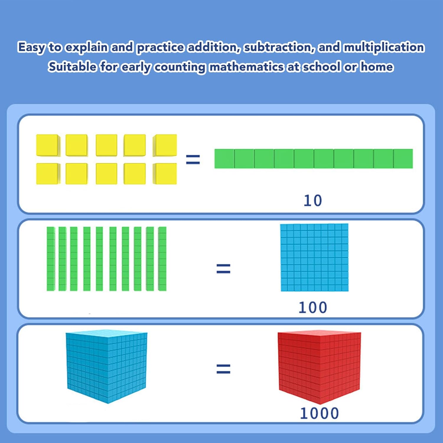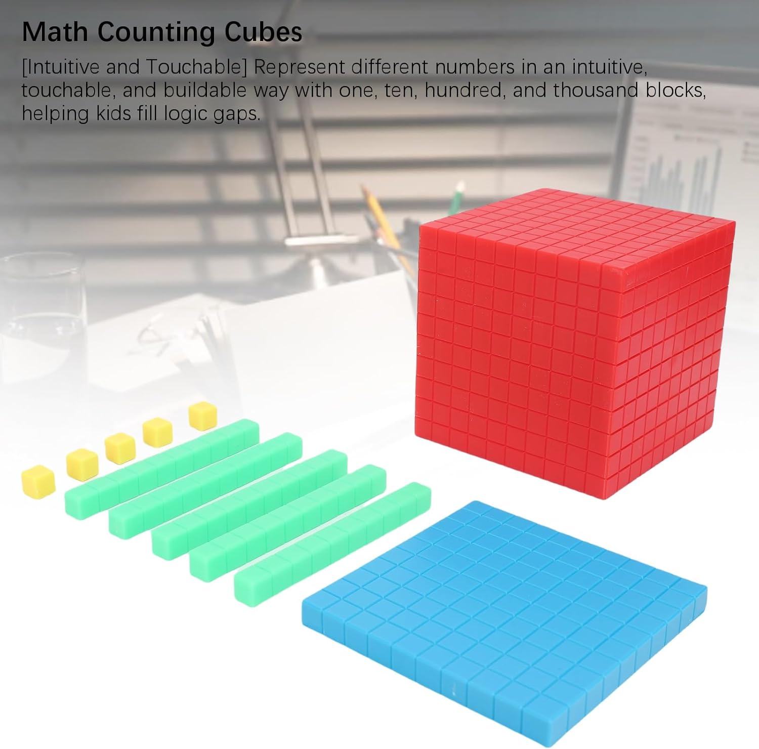 [Abilità matematiche iniziali] Coinvolgi i bambini in divertenti attività di conteggio e introduce concetti decimali senza sforzo. [Set educativo completo] Include 121 vivaci blocchi codificati a colori ideali per l'esplorazione pratica in varie impostazioni. [Apprendimento intuitivo] Rappresenta facilmente i numeri con , dieci, cento e mille blocchi per migliorare la comprensione logica. [Utilizzo versatile] per l'educazione matematica a scuola o a casa, promuovendo apprendimento e intrattenimento efficaci. [Materiale sicuro] Costruito in plastica robusta, garantisce durata e fornisce un'esperienza di apprendimento per i bambini.