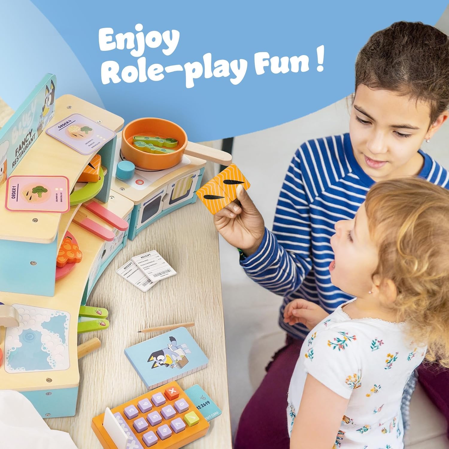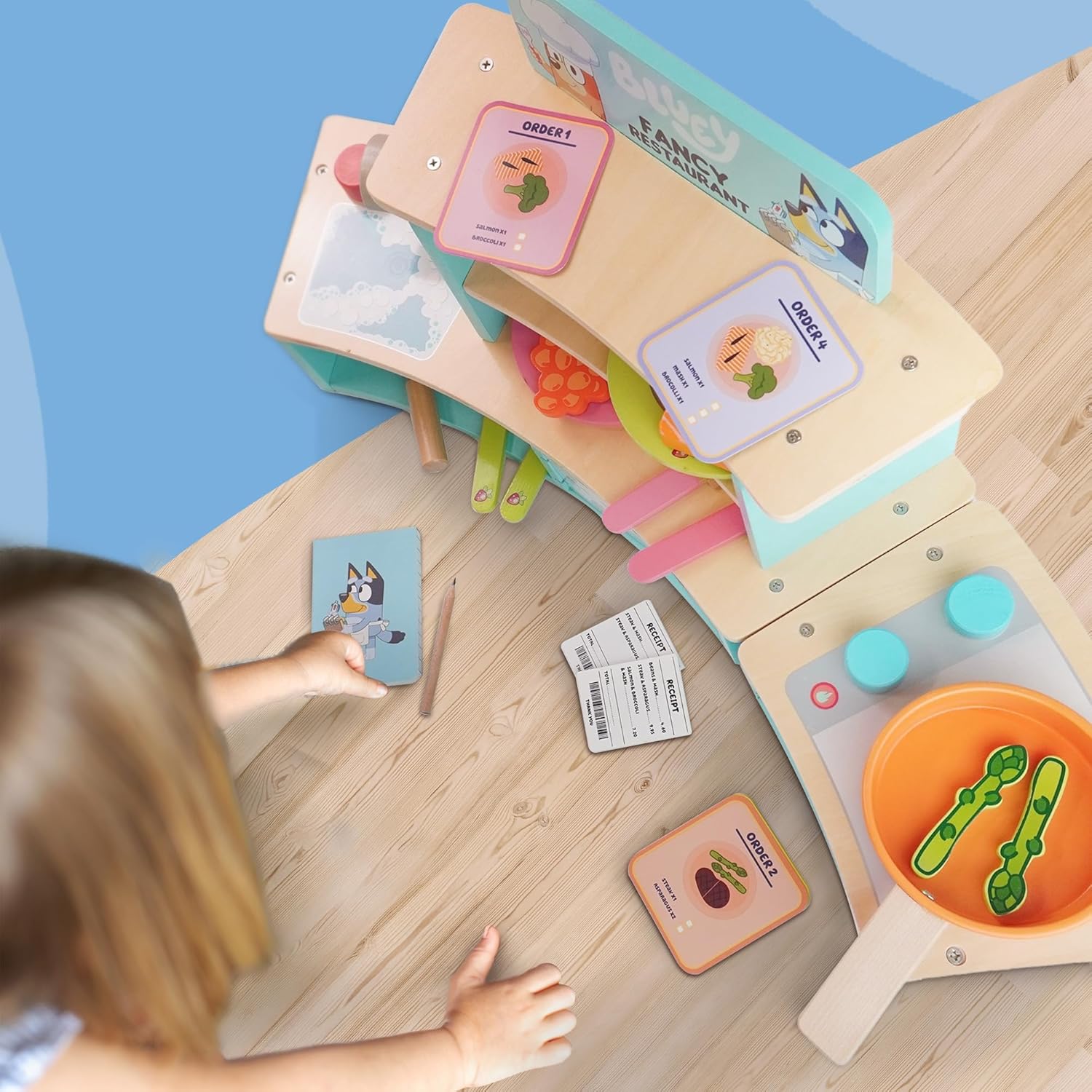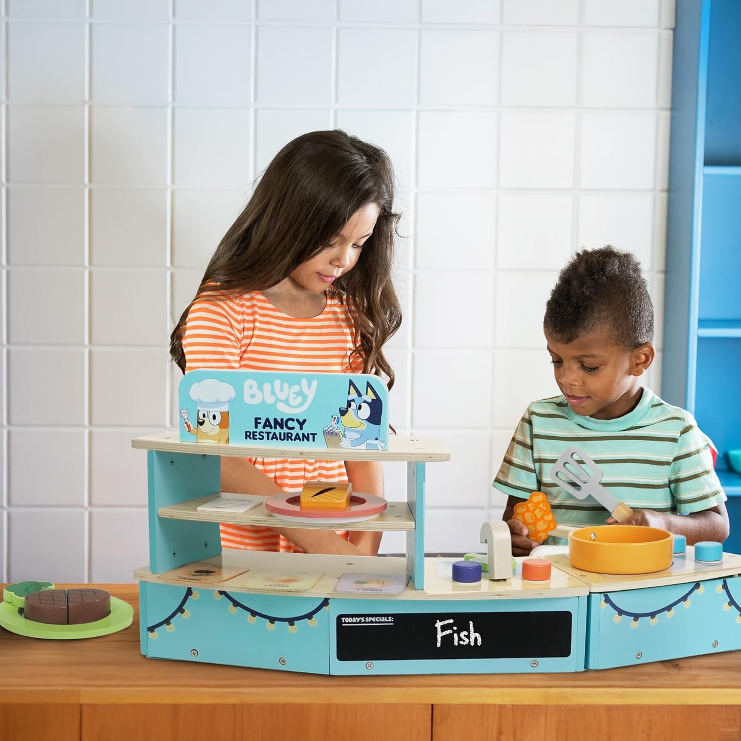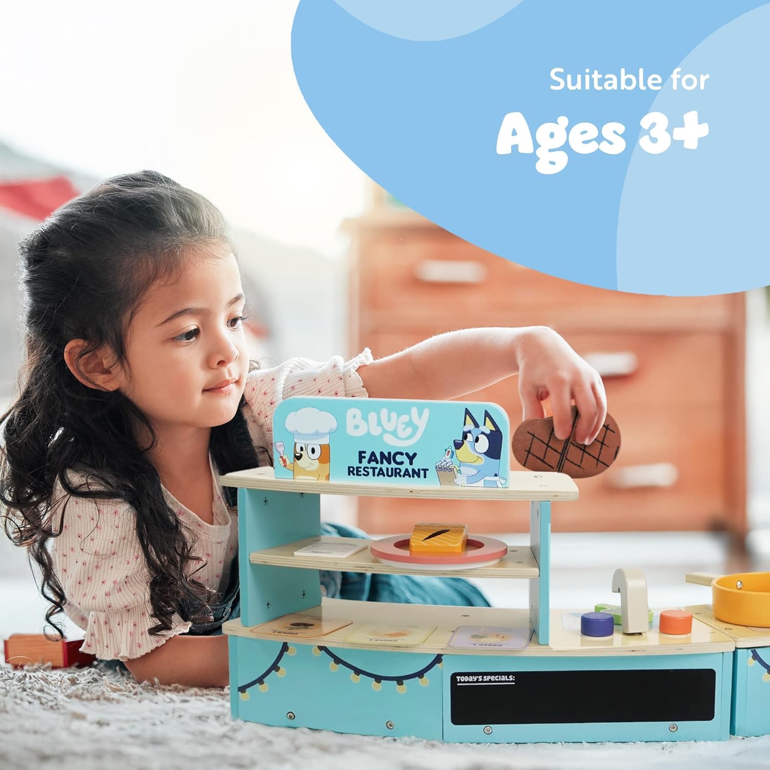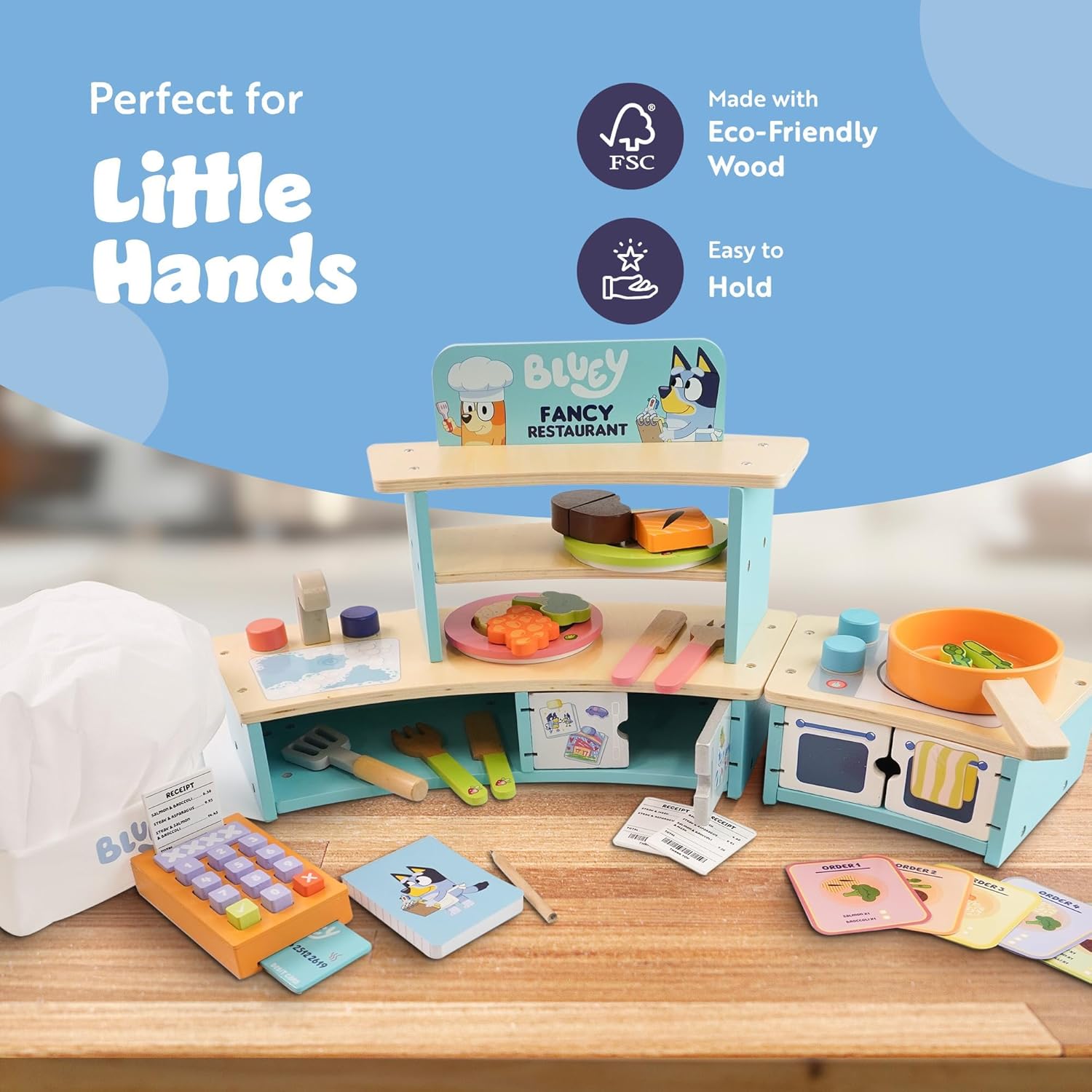 Emozionante divertimento di gioco finto: assumi il ruolo di Chef o Cameriere al Bluey's Fancy Restaurant! Cucina sul piano cottura, abbina piatti ai biglietti o prendi ordini di cibo, perfetto per infinite ore di gioco di ruolo fantasioso. Caratteristiche interattive della cucina: Include un forno, un lavandino e un frigorifero per migliorare la cottura finta e servire. Questo set compatto da tavolo ispira creatività e divertimento pratico durante il gioco. Struttura in legno di alta qualità: realizzato in robusto legno certificato FSC, questo set da gioco è costruito per durare. I materiali di provenienza responsabile aggiungono un tocco sostenibile agli elementi essenziali per il gioco. Design compatto da tavolo: ideale per spazi più piccoli, questo set da gioco offre grande divertimento in un formato portatile. Facile da installare e riporre, è ideale per giocare a casa o in viaggio. Perfetto per i fan Bluey dai 3 anni in su: progettata per i giovani amanti dei Bluey questa finta cucina incoraggia il gioco di ruolo e la narrazione creativa per bambini dai 3 anni in su.