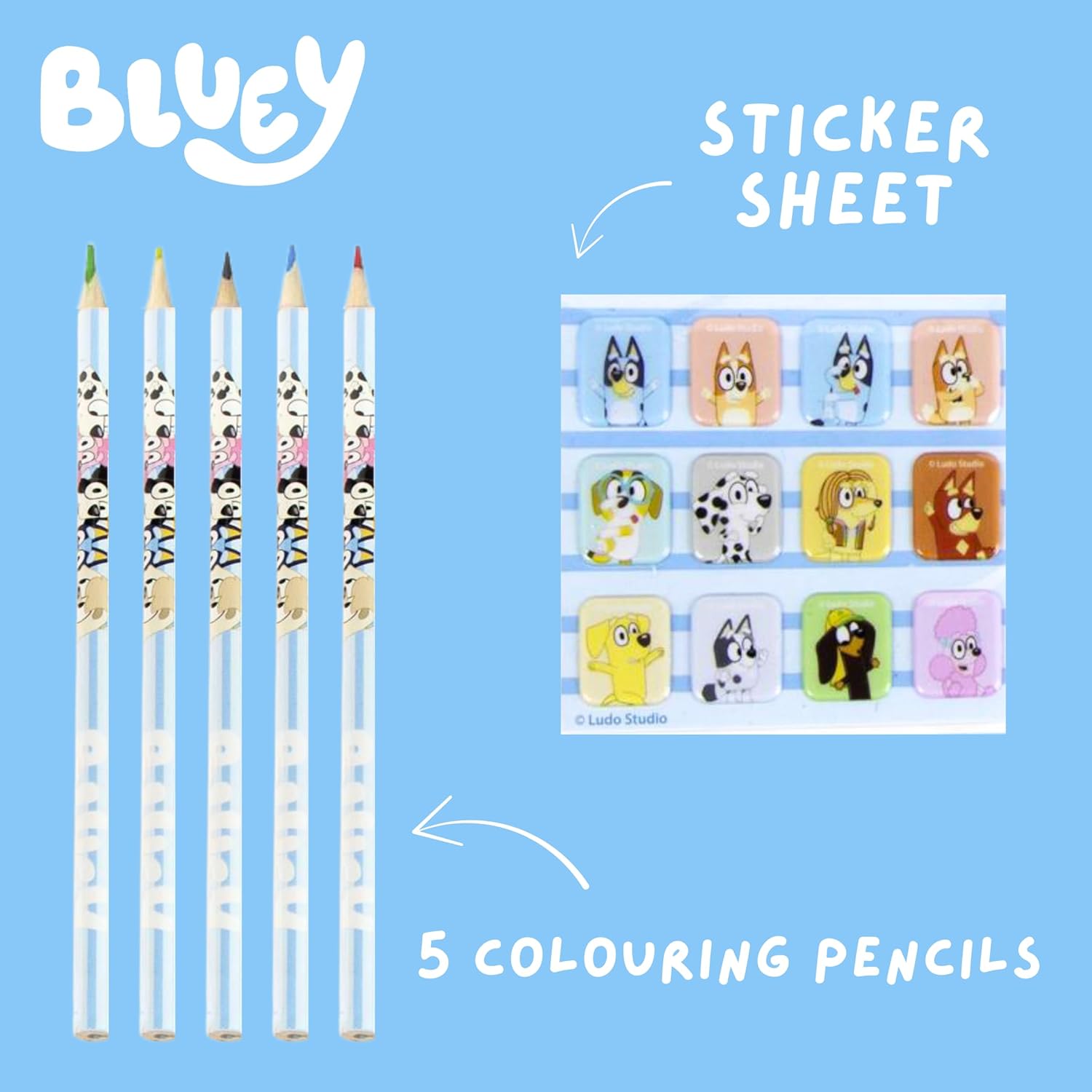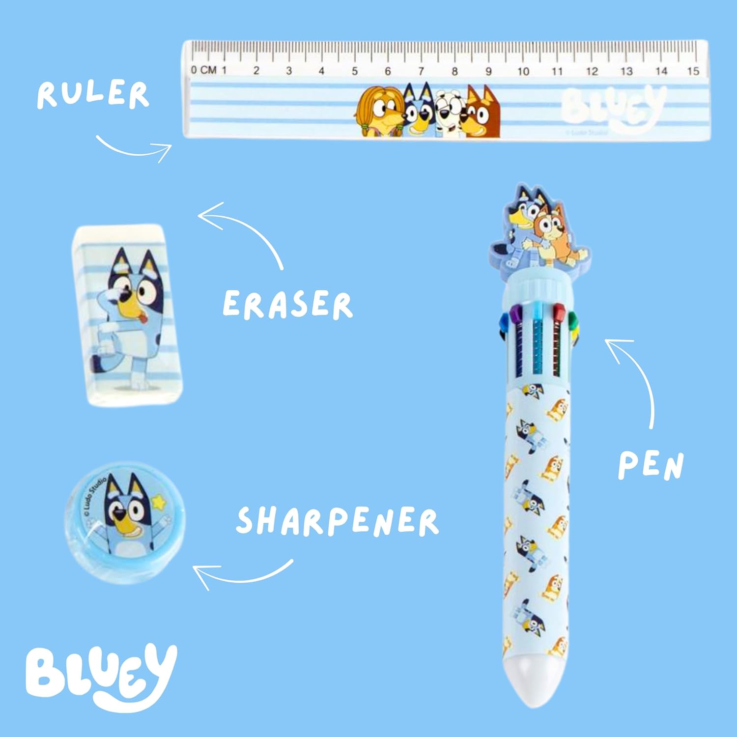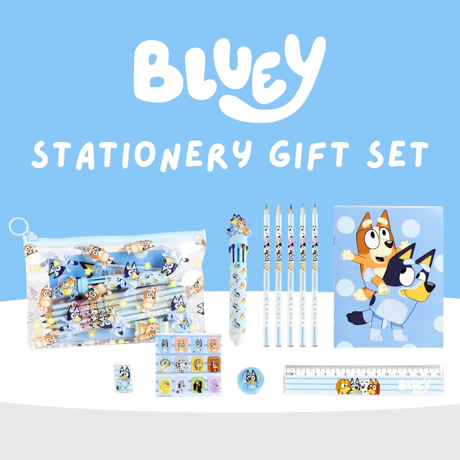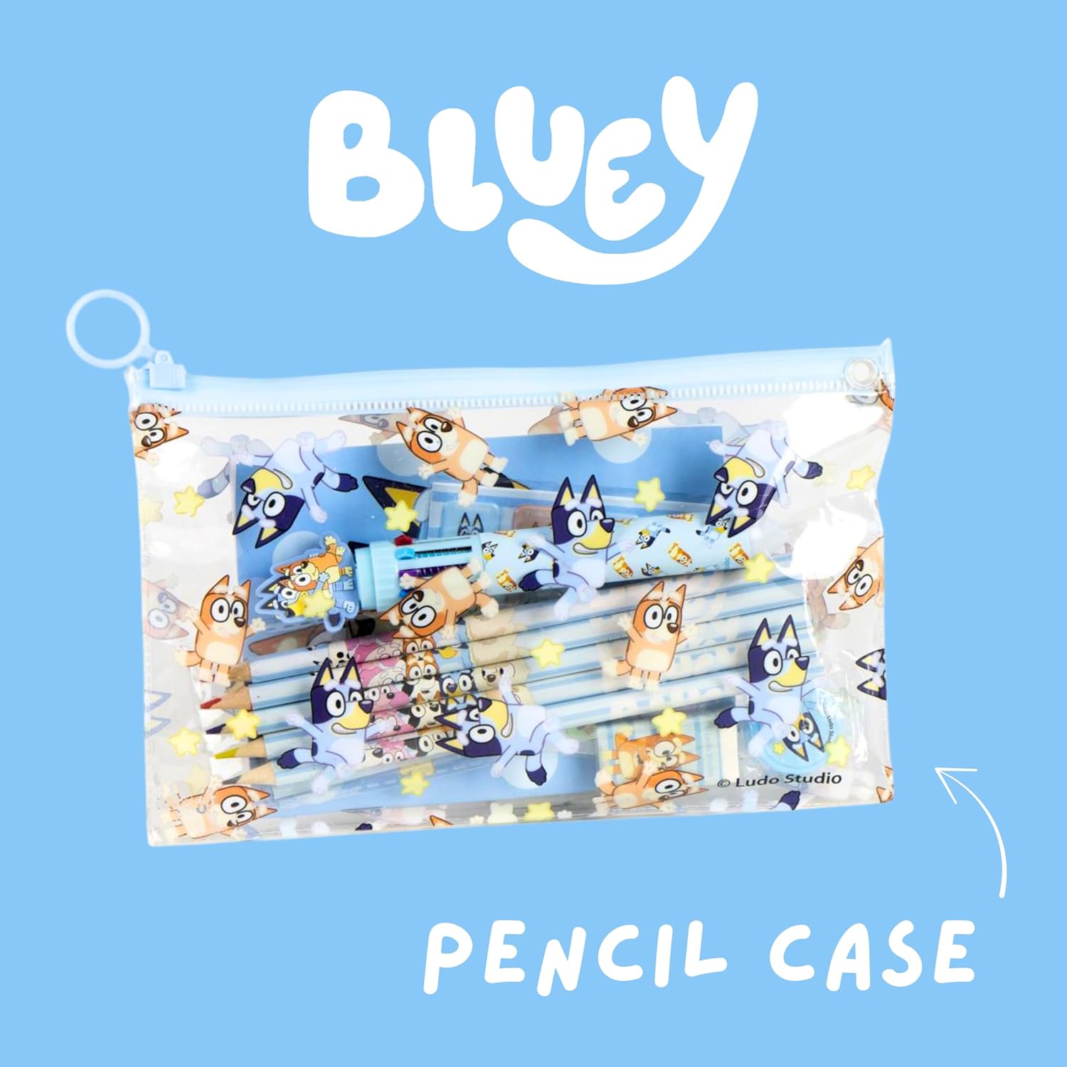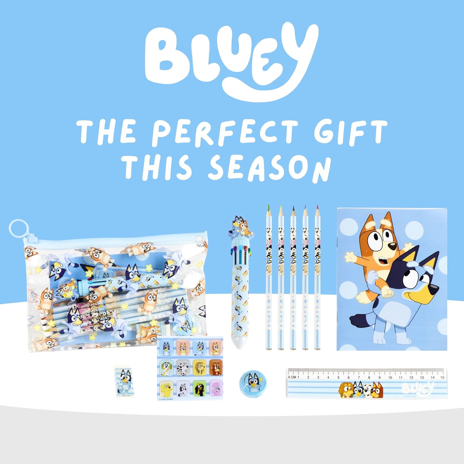 Bluey Set Di Cancelleria, Include 5 Matite Colorate, Righello, 6 Penne A Sfera Colorate, Adesivi, Gomma, Temperino, Quaderno E Astuccio, Set Di Cancelleria Regalo Per Bambini