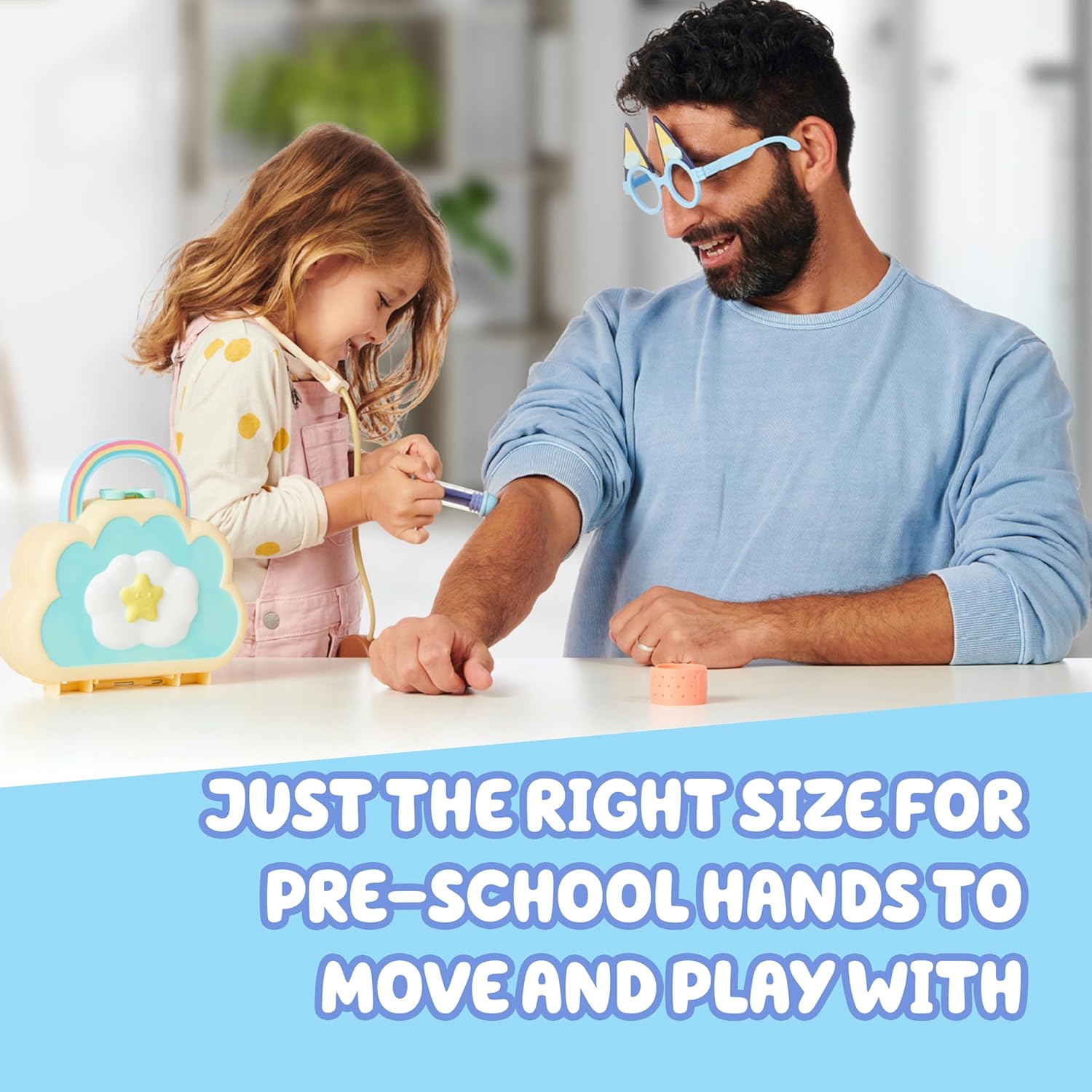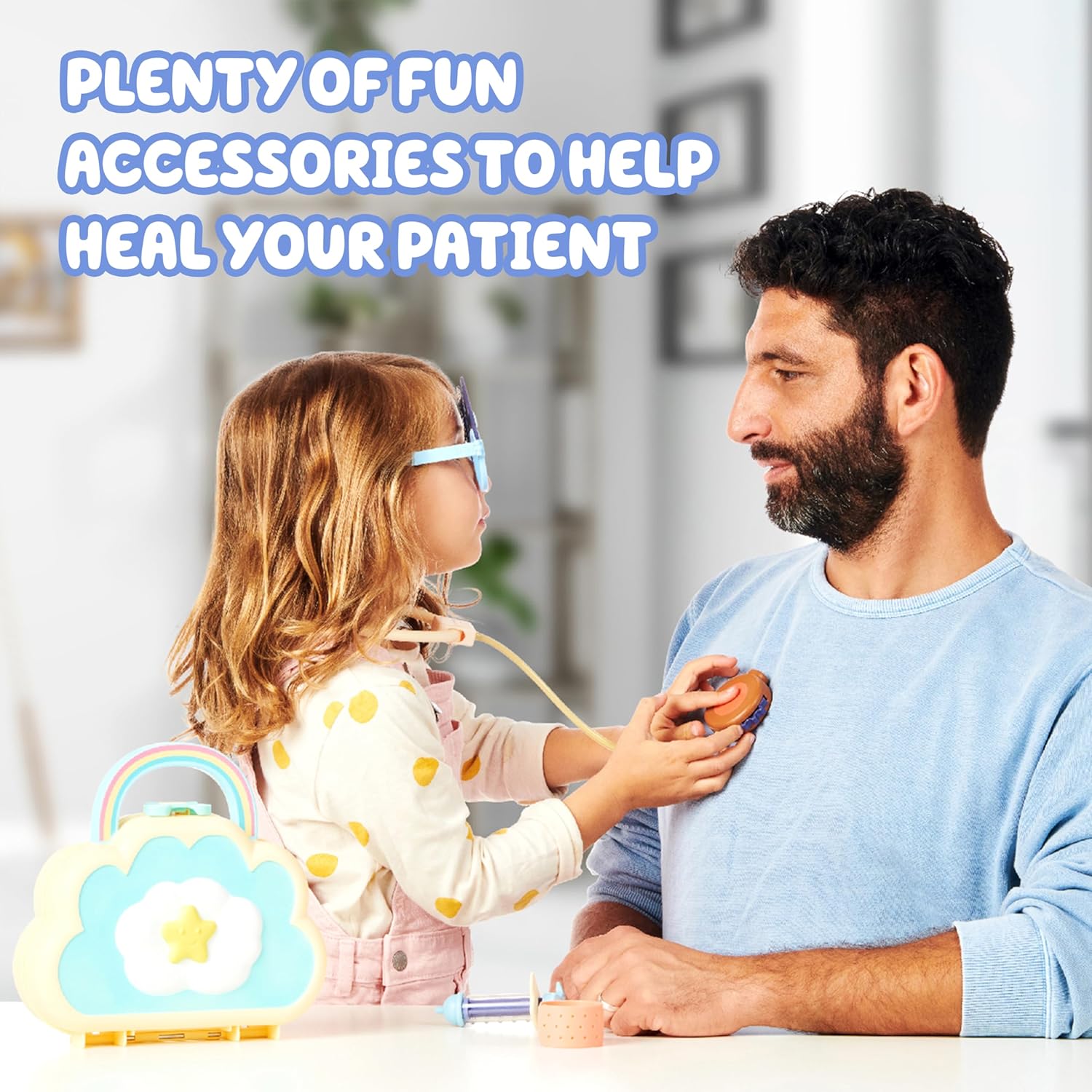 Supporto ideale per il gioco e l'immaginazione Ottimo da regalare Tanti accessori divertenti, tra cui uno stetoscopio giocattolo, siringa Press & Play, benda giocattolo, adesivi, badge medico e persino un paio di occhiali Dr. Bluey