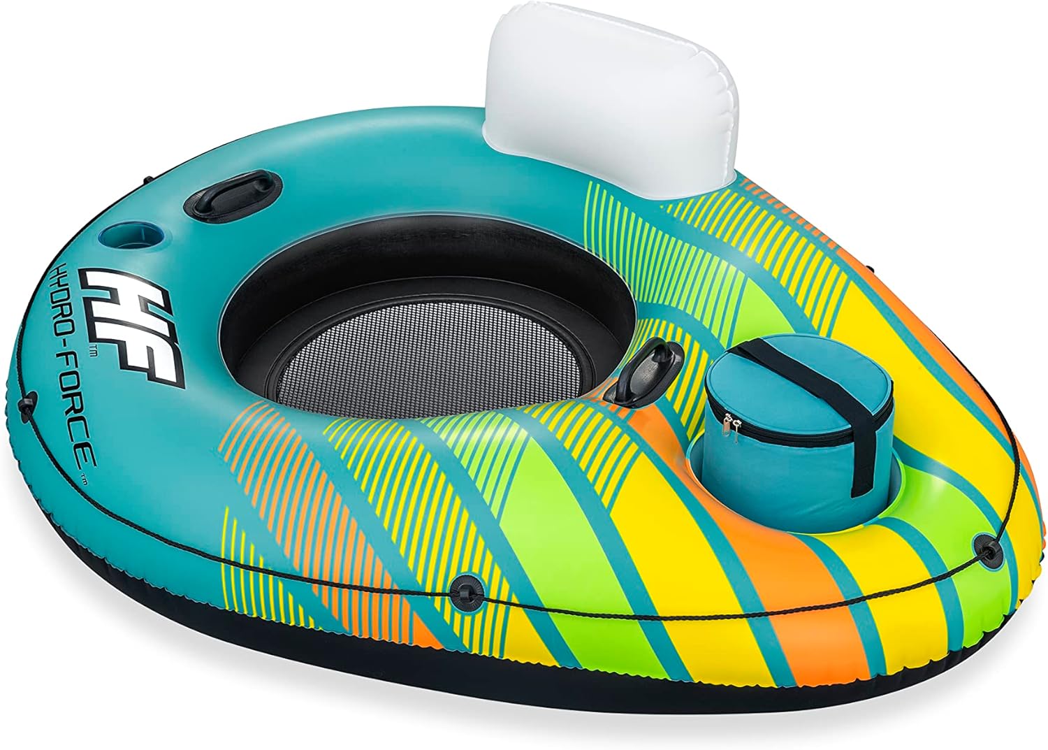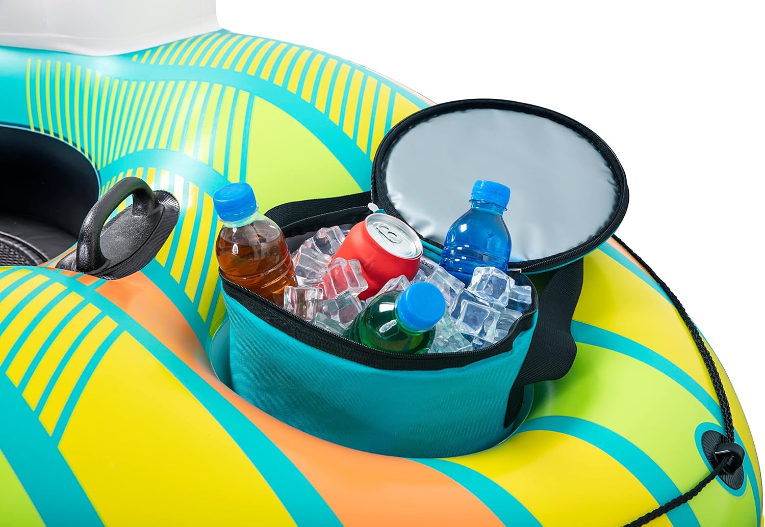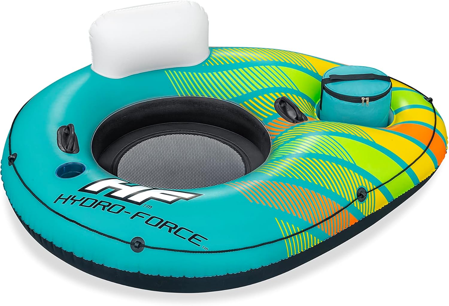 Il materiale Inflata-Shield resiste alle forature, limita l'allungamento e migliora la presa 1 dispositivo di raffreddamento gonfiabile rimovibile e spazio di archiviazione integrato per tenere bevande e snack a portata di mano Fondo in rete per un tempo confortevole e fresco Linea di vita a 360° con occhielli integrati per agganciare la boa o appenderla a quella degli amici Due robuste maniglie per salire semplicemente sulla boa Lo schienale fornisce supporto durante tutto il tempo in acqua