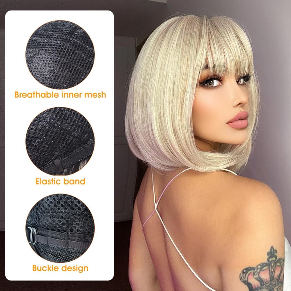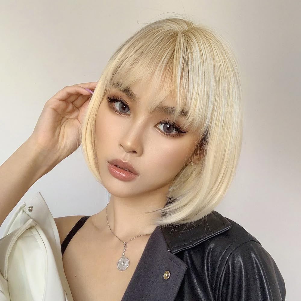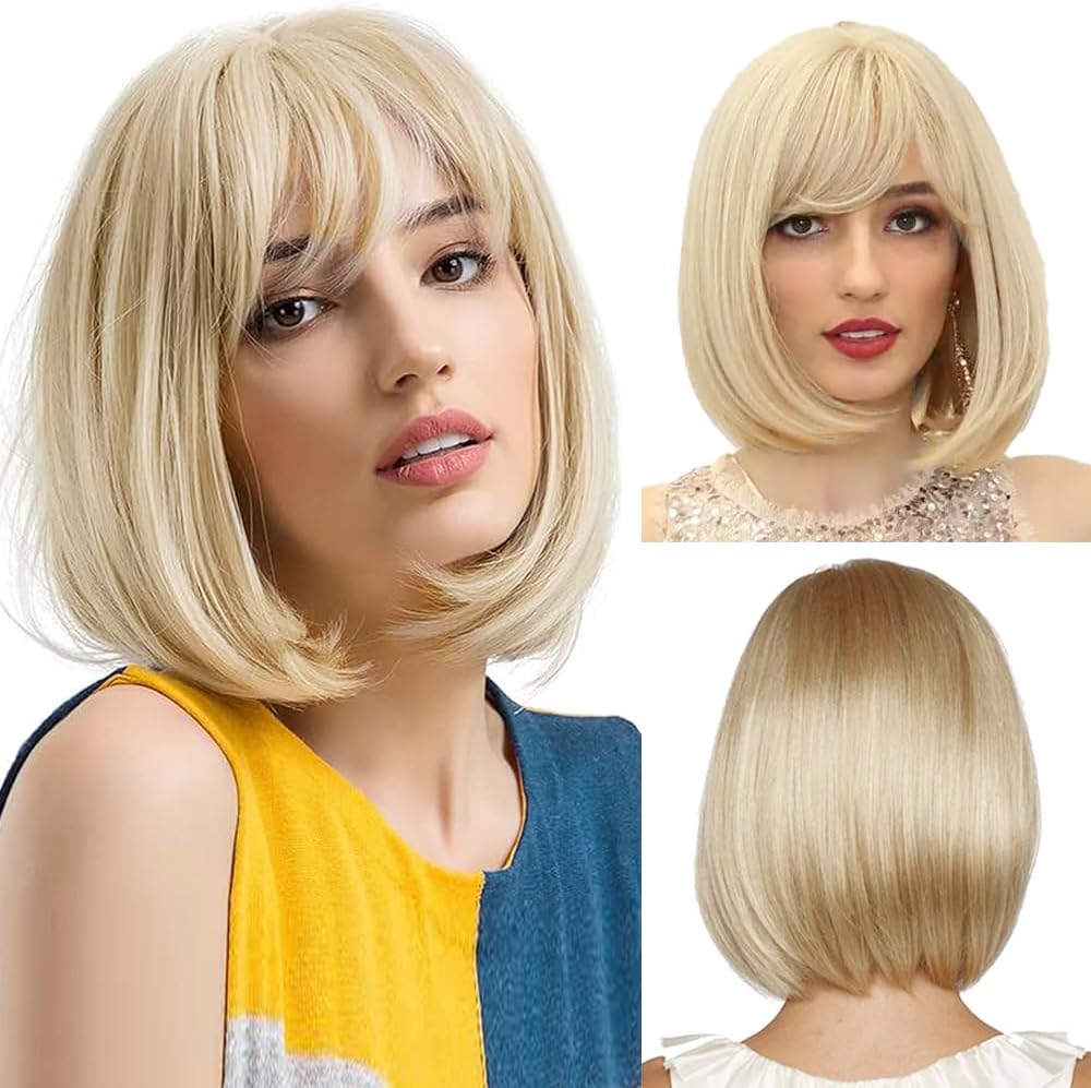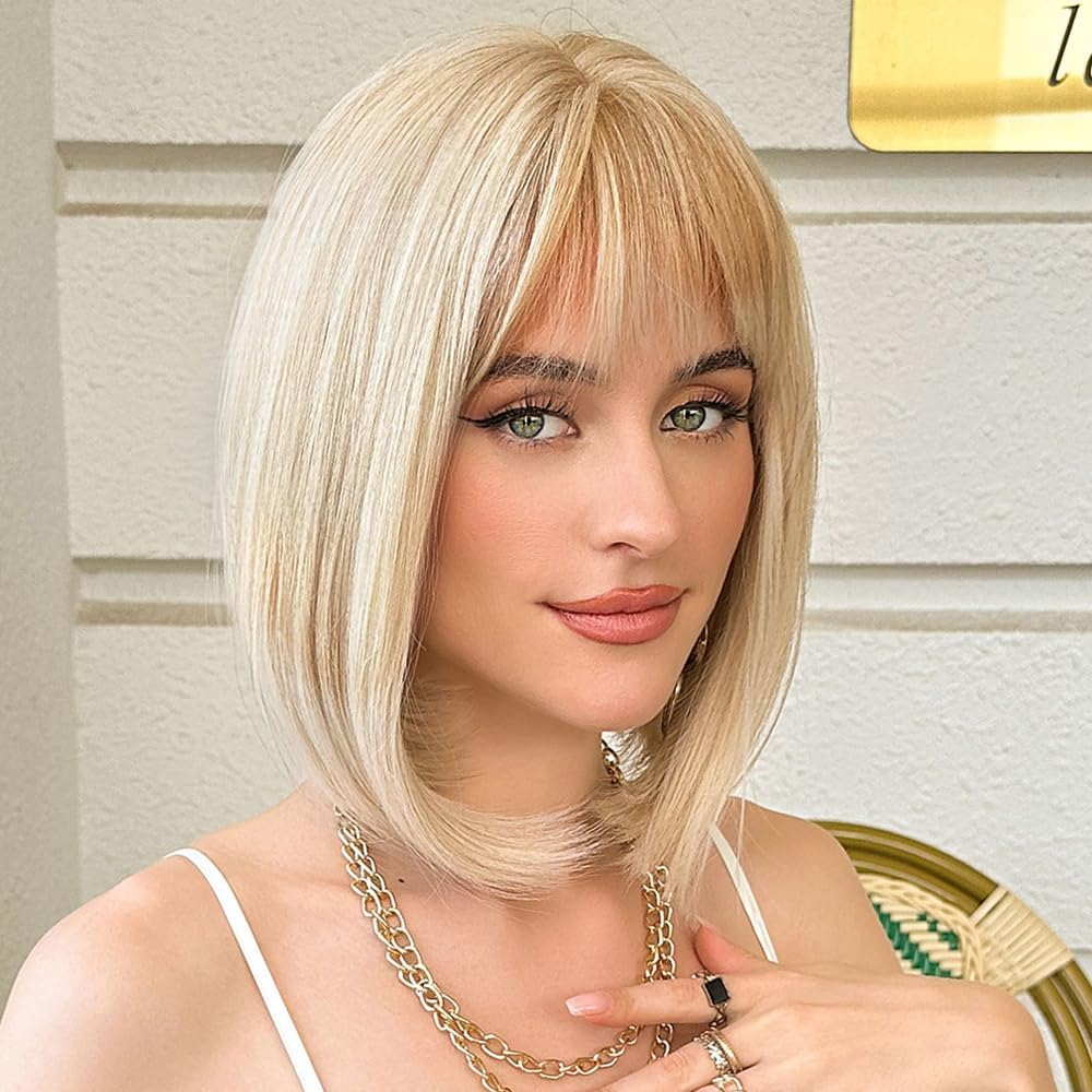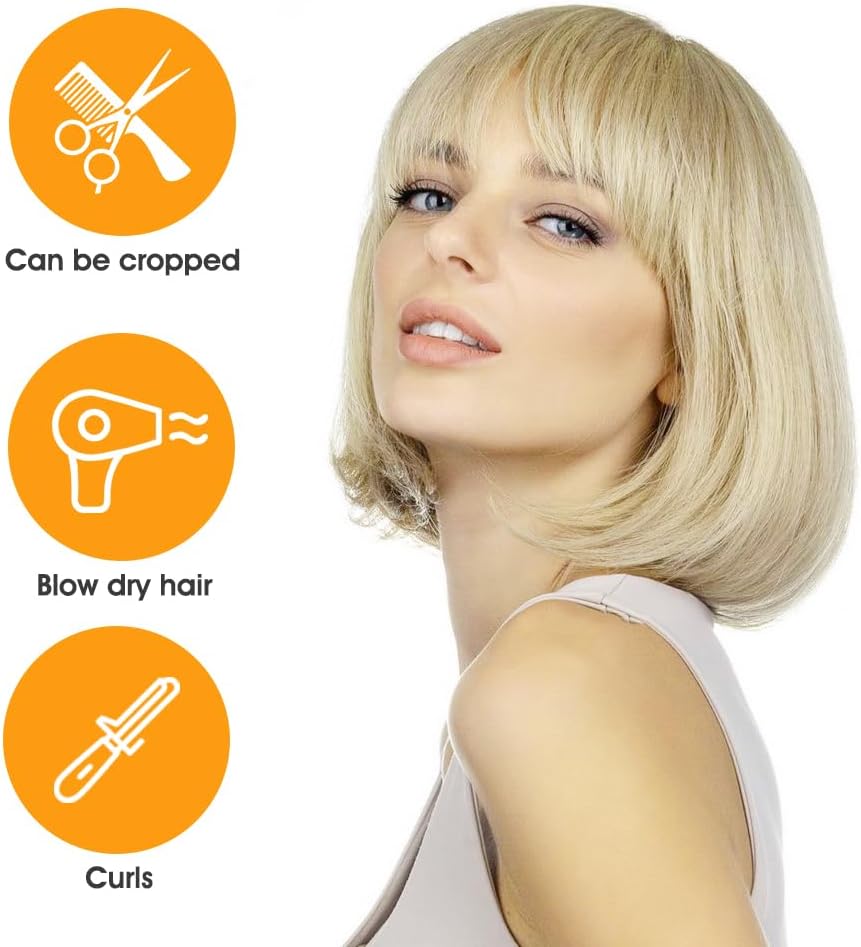 [Parrucca Bob Corta con Frange] --- Bob parrucca con frangia corta Bob ha una forma nuova e unica, Platingold pieno di personalità, consistenza morbida, colore espressivo, parrucca corta diritta per le donne si adatta perfettamente alla forma del viso, attira gli occhi e il cuoio capelluto realistico rende l'effetto di indossare più naturale e sorprendente. [Contiene una rete interna traspirante] --- La parrucca corta Bob con frangia misura circa 30 cm di lunghezza. La rete interna traspirante dispone di 8 fibbie regolabili, parrucche sintetiche adatte per una circonferenza della testa di 52-58 cm. (parrucca bob con frangia ha un po 'di capelli fluttuanti o perdita di capelli, che è un fenomeno normale. Basta pettinarlo delicatamente con un pettine.) [Capelli resistenti alle alte temperature] --- La parrucca corta Bob con frangia è realizzata in fibra sintetica sintetica di alta qualità ad alta temperatura, l'effetto di indossare è realistico e naturale, parrucca con frangia resistenza alle alte temperature da 120 a 180 gradi, taglio libero, tintura dei capelli e permanente, morbida e liscia al tatto, parrucca corta per le donne non facile da perdere i capelli. [Facile da curare] --- La parrucca corta Bob con frangia può essere lavata dopo l'uso, non è facile da perdere i capelli e crespo, si consiglia di pettinarla con un pettine dopo l'uso; oppure mettere la parrucca bionda corta in acqua per 2-5 minuti, premere delicatamente e pulire con le mani, evitare l'esposizione al sole e posizionarla verticalmente in un luogo ventilato per asciugare naturalmente. [Scenari applicabili] --- L'effetto quadrato corto e affascinante è molto adatto per l'uso quotidiano e accattivante e corto colore biondo parrucche è molto adatto per il trucco, le feste, gli eventi a tema di Hollywood, il cosplay o i vestiti quotidiani, Halloween, mascherate, matrimoni, incontri, feste di moda, eventi a tema, ecc.