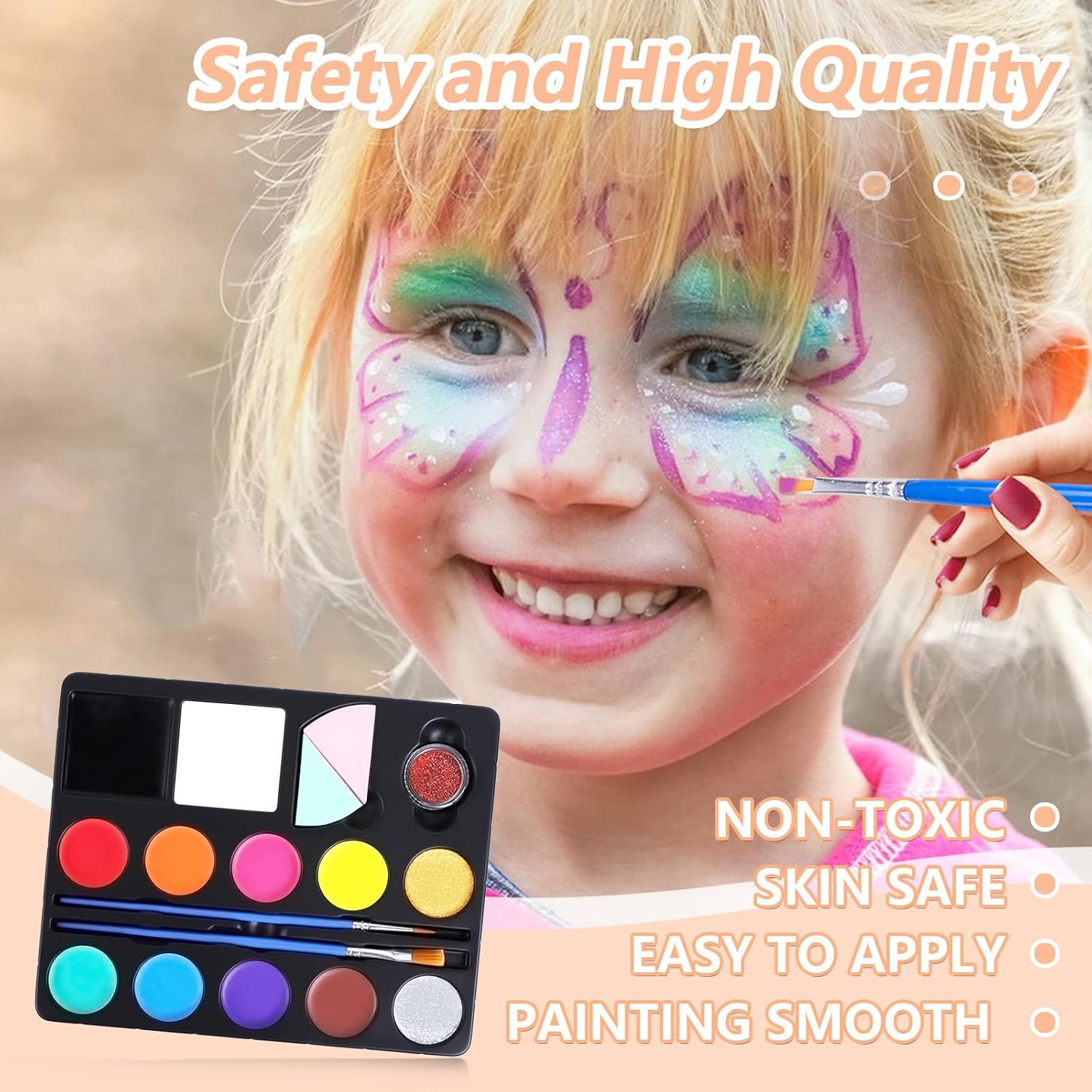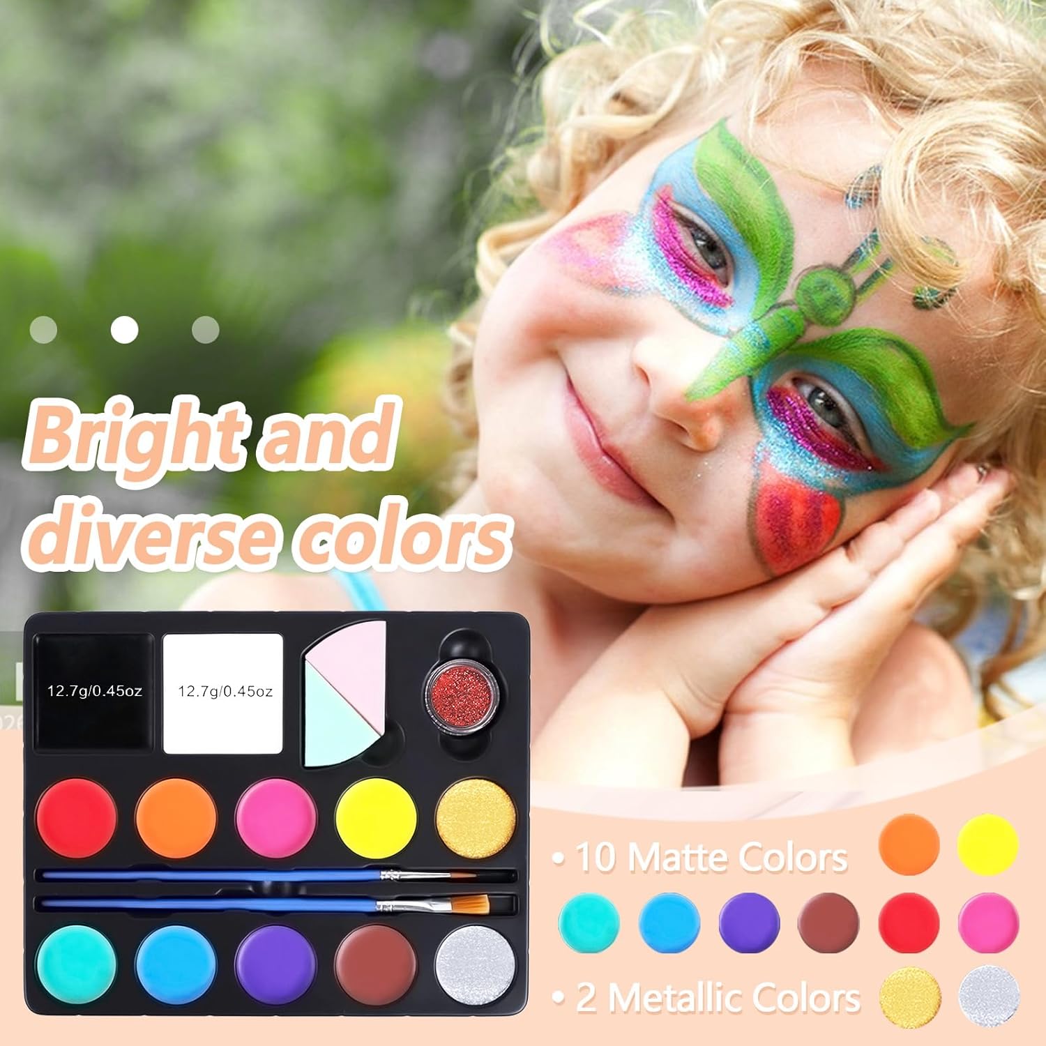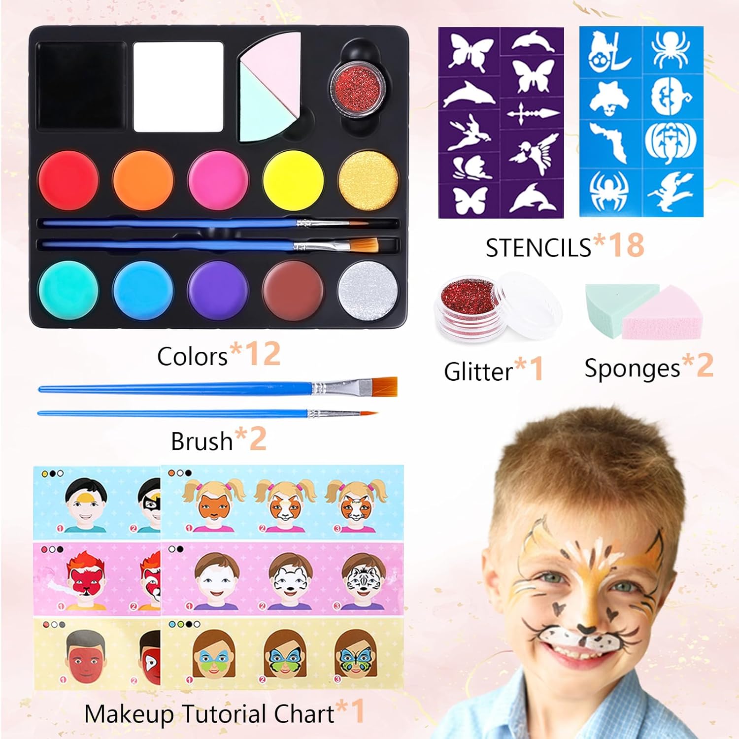 Set trucco per bambini: questo set contiene 12 colori per il corpo, 1 glitter, 18 stencil, 2 spugne e 2 pennelli. Permette di creare diversi dipinti per il corpo a seconda delle necessità. Perfettamente adatto per trucchi per bambini, trucco e trucco per bambini. Sicuro: questo set di trucco per bambini utilizza una formula sicura, di alta qualità, ipoallergenica e solubile in acqua, sicura, non tossica e delicata. Adatto a tutti i bambini e adulti sensibili alla pelle. Perfetto per il trucco dei bambini, i colori del bodypainting e il trucco dei bambini. Poiché ogni pelle è diversa, si consiglia di testare prima il colore su una piccola area. Facile da usare e pulire: inumidire il pennello o versare un po' d'acqua sul trucco necessario, quindi utilizzare il pennello per trasformare la superficie in una pasta. Applicare il colore sul viso o sul corpo con il pennello per creare un body painting preciso. Per la pulizia è necessario solo acqua saponata o un panno umido. Regalo raffinato: il set di trucco per bambini a 12 colori è colorato, vivace e ben confezionato. Dotato di vari strumenti di pittura e modelli di trucco per bambini, è sicuro e non tossico. Perfetto come regalo di compleanno, festa o sorpresa per trucchi per bambini. Ampia applicazione: questo set di colori per il corpo ti farà brillare in diverse occasioni. Ideale per carnevale, feste di compleanno, eventi scolastici, Halloween, Natale, Pasqua, trucco teatrale e cosplay. Perfetto con set di tatuaggi glitterati, trucco per bambini per ragazze e pennelli.