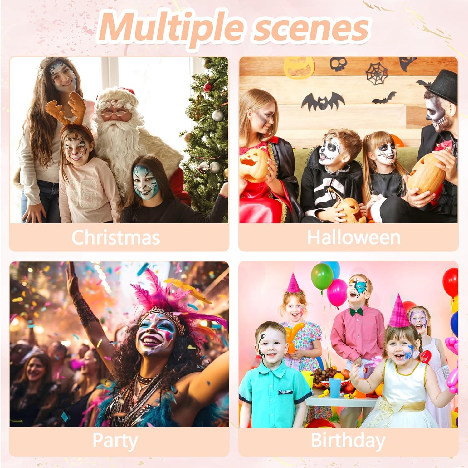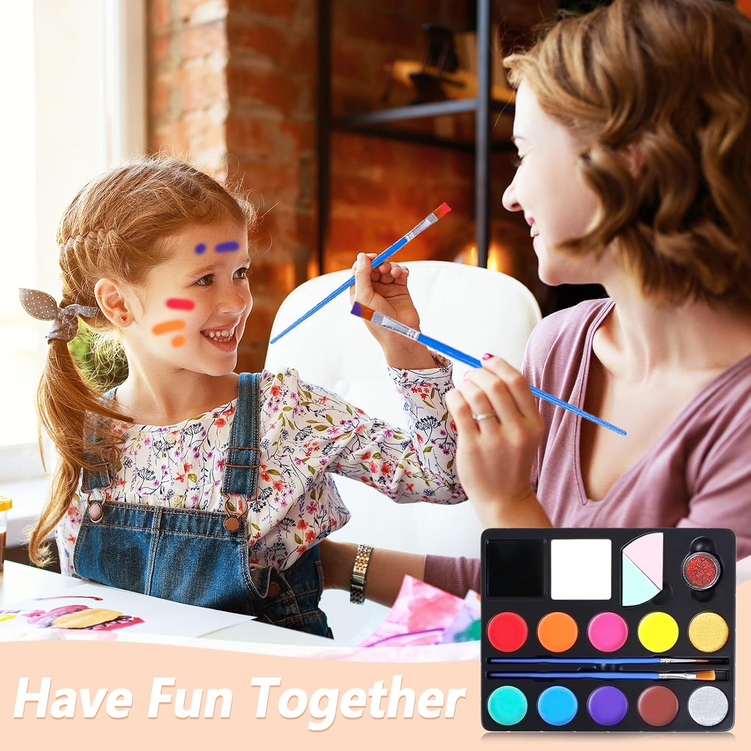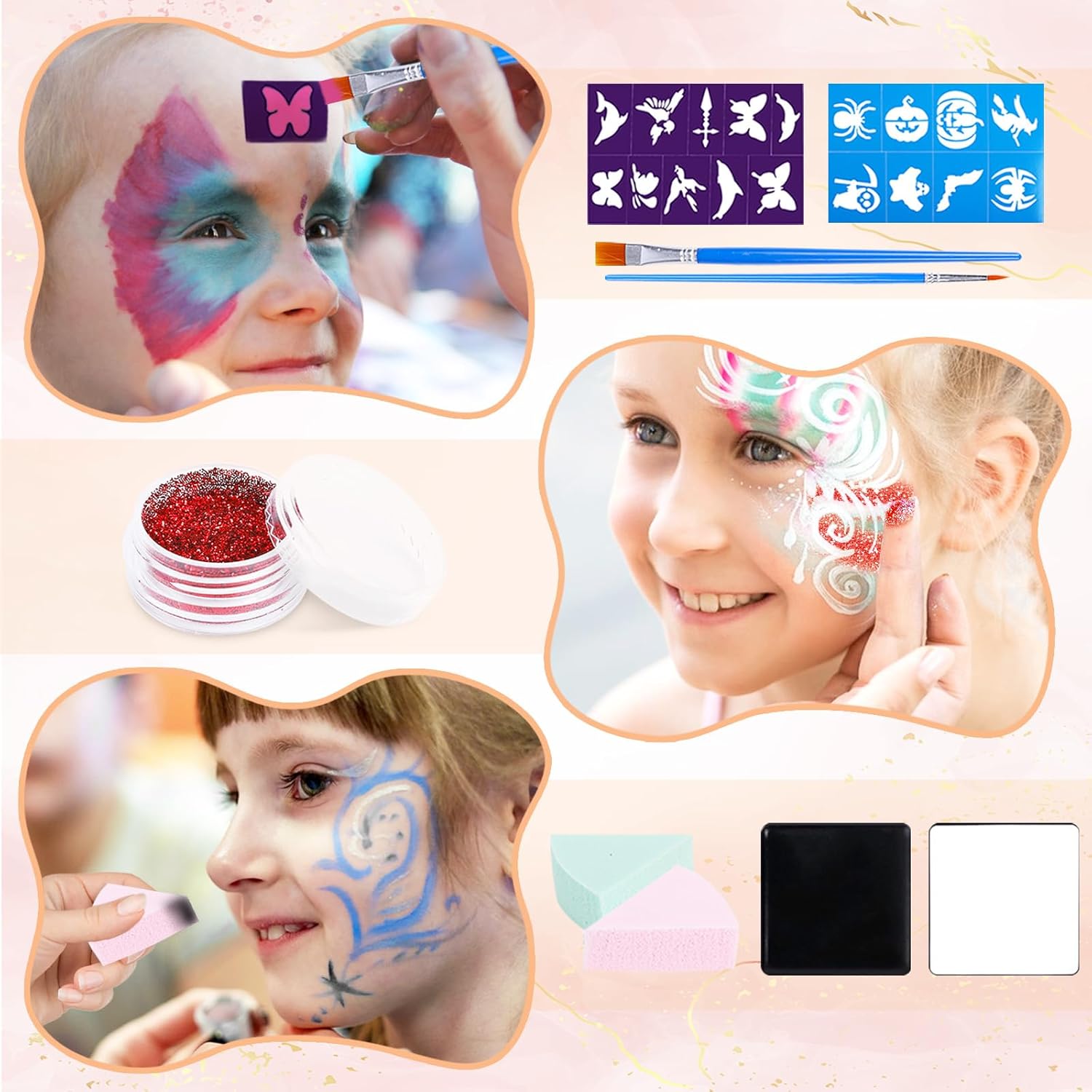 Set trucco per bambini: questo set contiene 12 colori per il corpo, 1 glitter, 18 stencil, 2 spugne e 2 pennelli. Permette di creare diversi dipinti per il corpo a seconda delle necessità. Perfettamente adatto per trucchi per bambini, trucco e trucco per bambini. Sicuro: questo set di trucco per bambini utilizza una formula sicura, di alta qualità, ipoallergenica e solubile in acqua, sicura, non tossica e delicata. Adatto a tutti i bambini e adulti sensibili alla pelle. Perfetto per il trucco dei bambini, i colori del bodypainting e il trucco dei bambini. Poiché ogni pelle è diversa, si consiglia di testare prima il colore su una piccola area. Facile da usare e pulire: inumidire il pennello o versare un po' d'acqua sul trucco necessario, quindi utilizzare il pennello per trasformare la superficie in una pasta. Applicare il colore sul viso o sul corpo con il pennello per creare un body painting preciso. Per la pulizia è necessario solo acqua saponata o un panno umido. Regalo raffinato: il set di trucco per bambini a 12 colori è colorato, vivace e ben confezionato. Dotato di vari strumenti di pittura e modelli di trucco per bambini, è sicuro e non tossico. Perfetto come regalo di compleanno, festa o sorpresa per trucchi per bambini. Ampia applicazione: questo set di colori per il corpo ti farà brillare in diverse occasioni. Ideale per carnevale, feste di compleanno, eventi scolastici, Halloween, Natale, Pasqua, trucco teatrale e cosplay. Perfetto con set di tatuaggi glitterati, trucco per bambini per ragazze e pennelli.