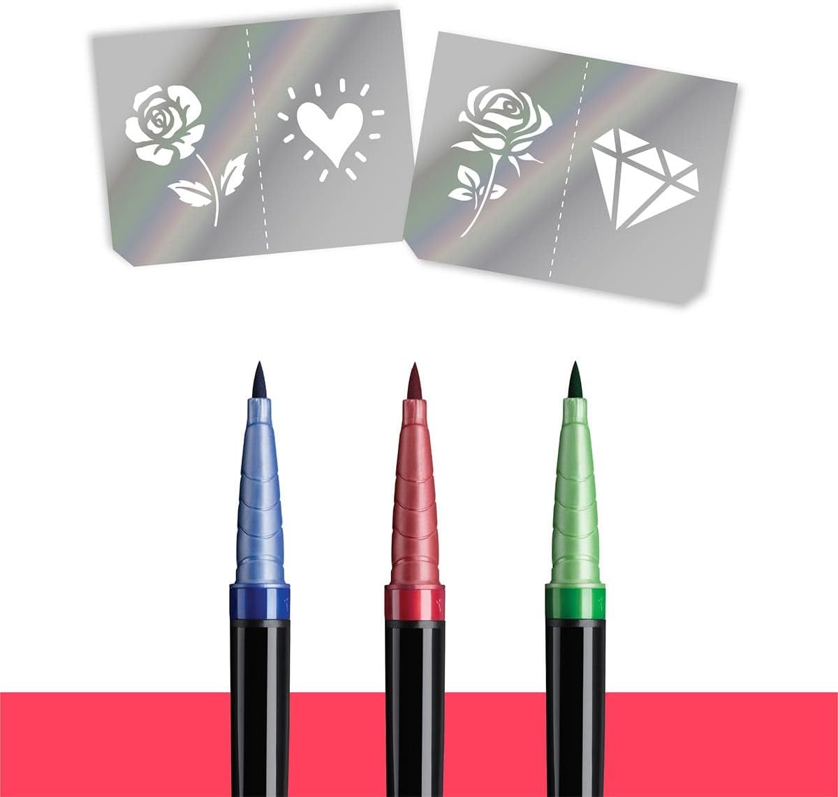Crea una bellissima body art con questo kit in stile old school di 3 pennarelli Bic per tatuaggi temporanei e 2 fogli per stencil Questi pennarelli cosmetici sono realizzati con un’attenzione alla pelle con inchiostro a basso odore che si asciuga velocemente, ideali per body painting, eventi sportivi e feste Inchiostro vivace in blu, rosso e verde che dura fino a 2 giorni - usa gli stencil in stile retrò o vai a mano libera con il tuo design Con una presa e una punta flessibile che scrive da 1 a 4 mm, questi pennarelli sono facili da usare per disegnare linee sottili e riempire le forme Stai pensando a un tatuaggio al braccio o alla caviglia? Prima di impegnarti, guarda come sarebbe il tuo disegno per una notte o un fine settimana con gli amici