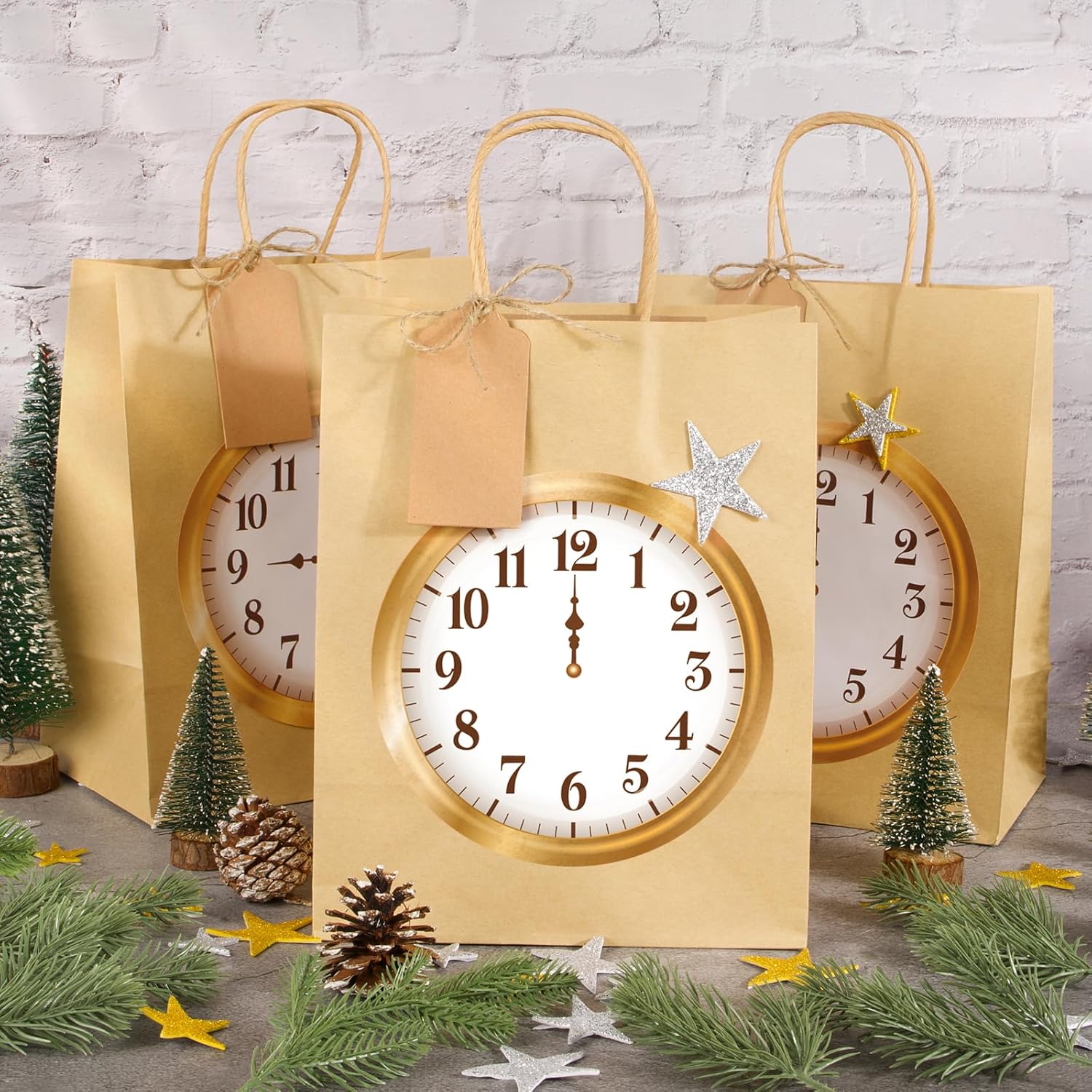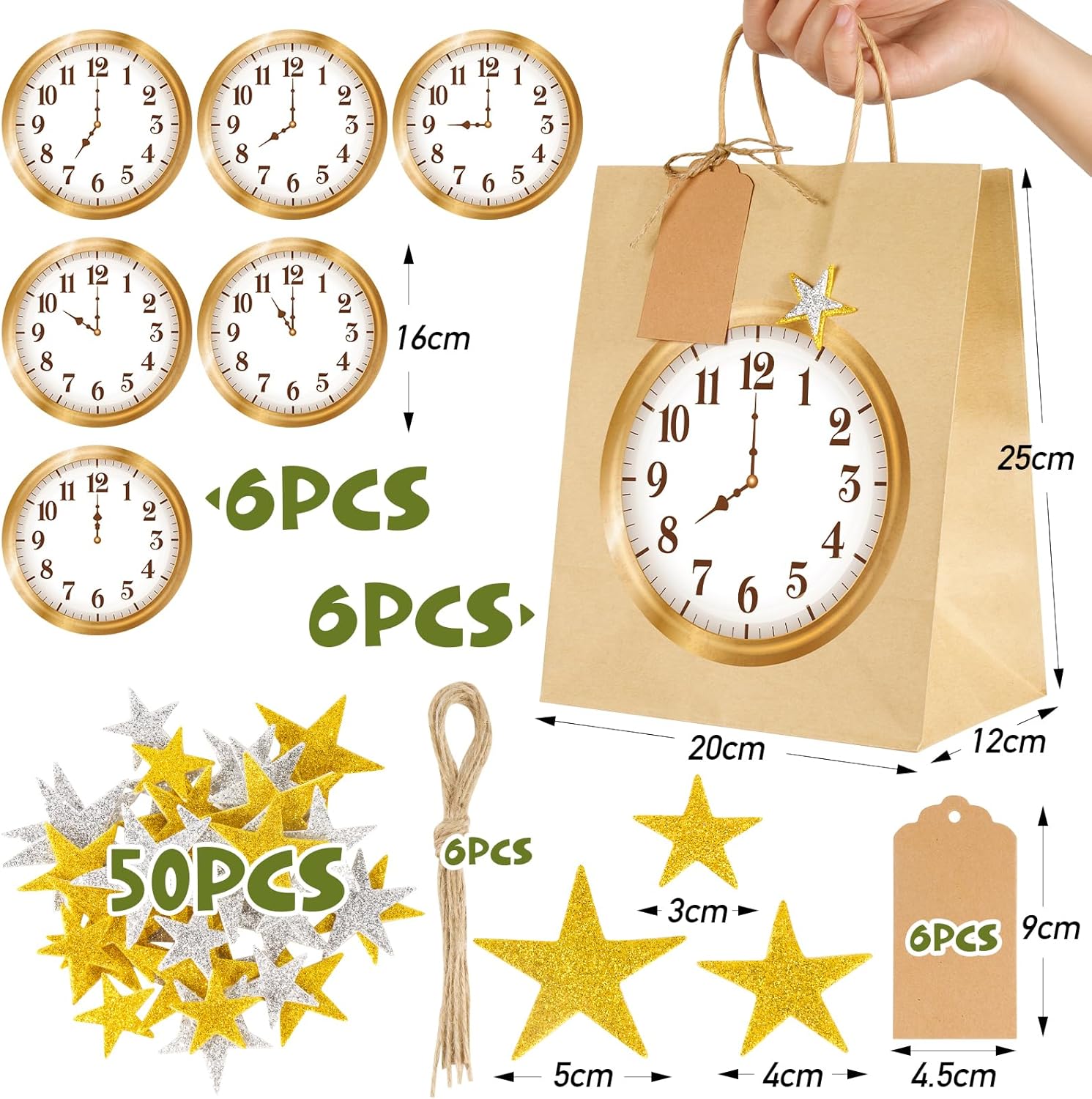 Borse per il conto alla rovescia di Capodanno: riceverai 6 borse per il conto alla rovescia di Capodanno, 6 adesivi per il conto alla rovescia, 50 adesivi con stelle glitterate, 6 pezzi di corda di canapa, 6 pezzi di ciondoli. Materiale: i sacchetti regalo sono realizzati in carta kraft, spessa, robusta e durevole, non facile da deformare. Dimensioni: 25×20×12 cm. Questi adesivi per il conto alla rovescia di Capodanno sono perfetti per il conto alla rovescia per il nuovo anno, con questi graziosi sacchetti regalo che rendono il conto alla rovescia per il nuovo anno ancora più divertente quest'anno. Puoi mettere qualcosa di dolce o qualcosa con cui giocare nei sacchetti, ideale per la festa di Capodanno dei bambini, il gioco di Capodanno, i regali di Capodanno.