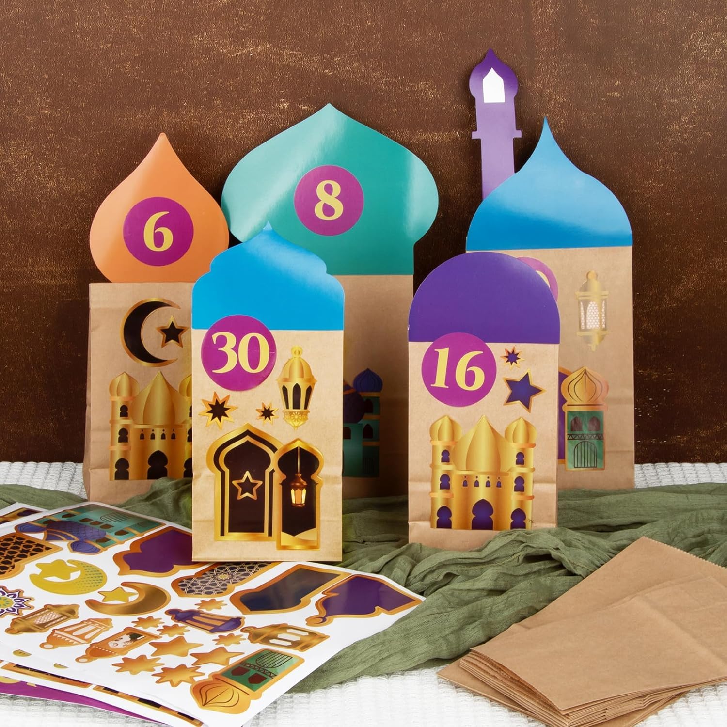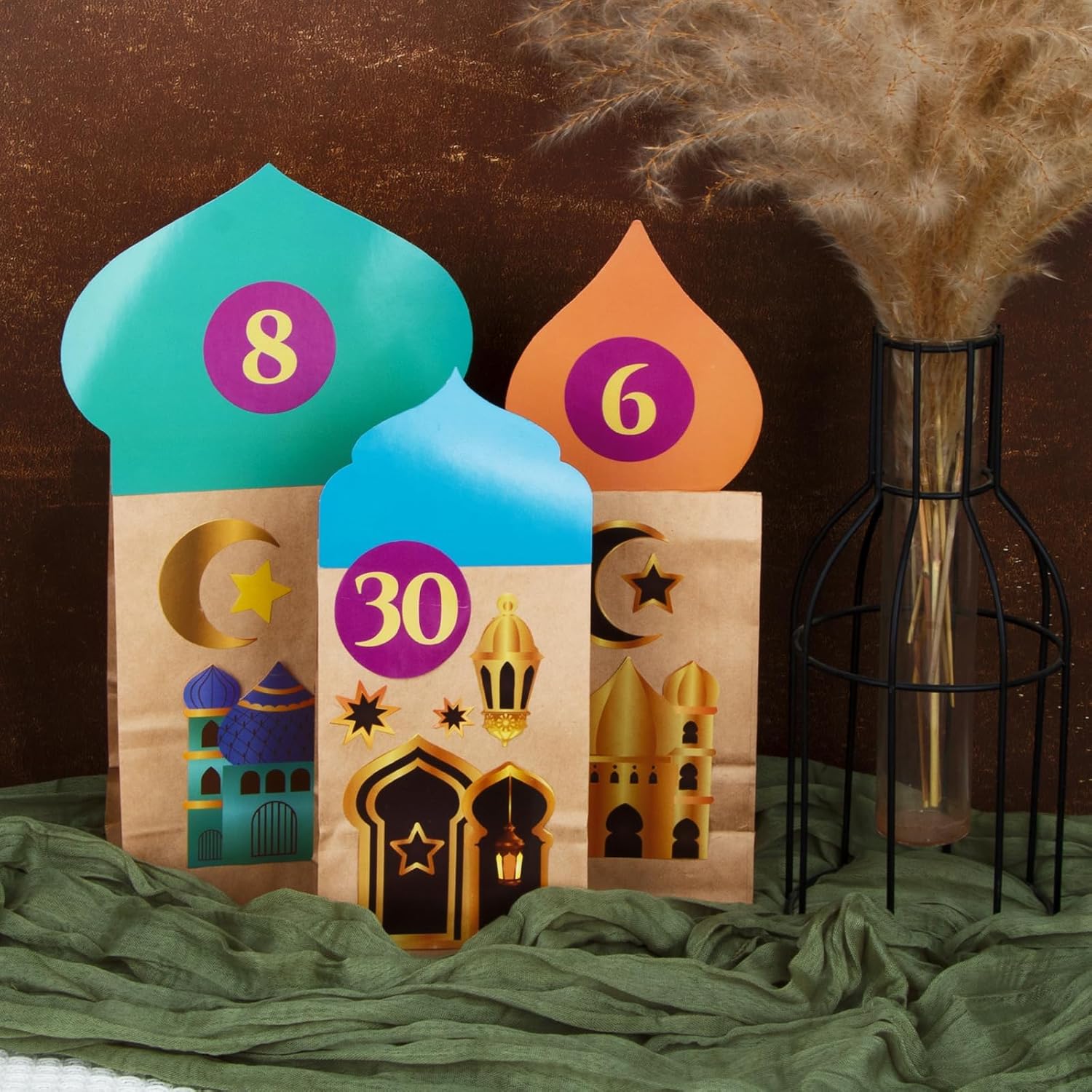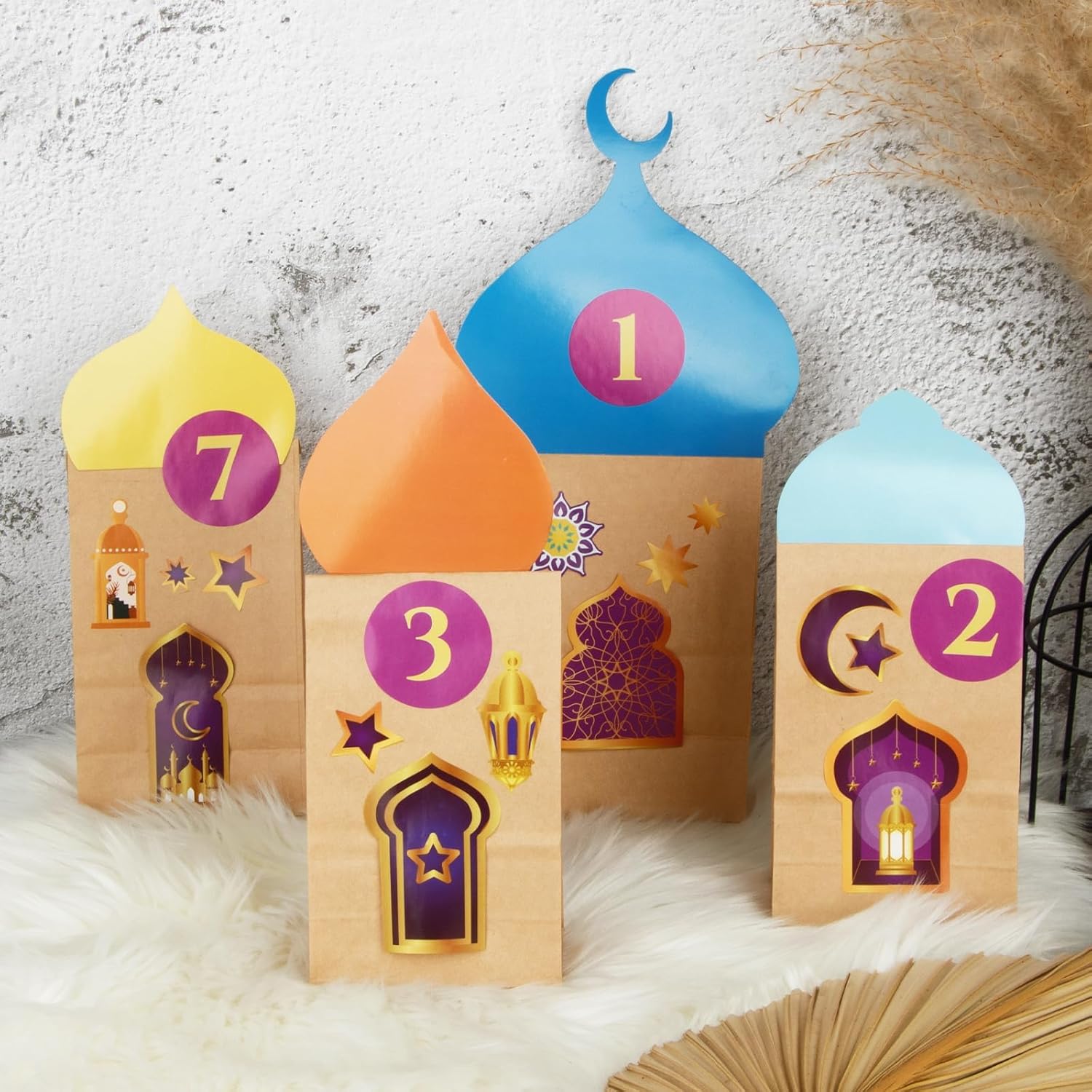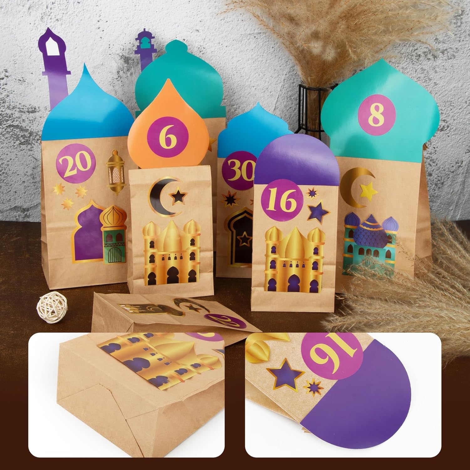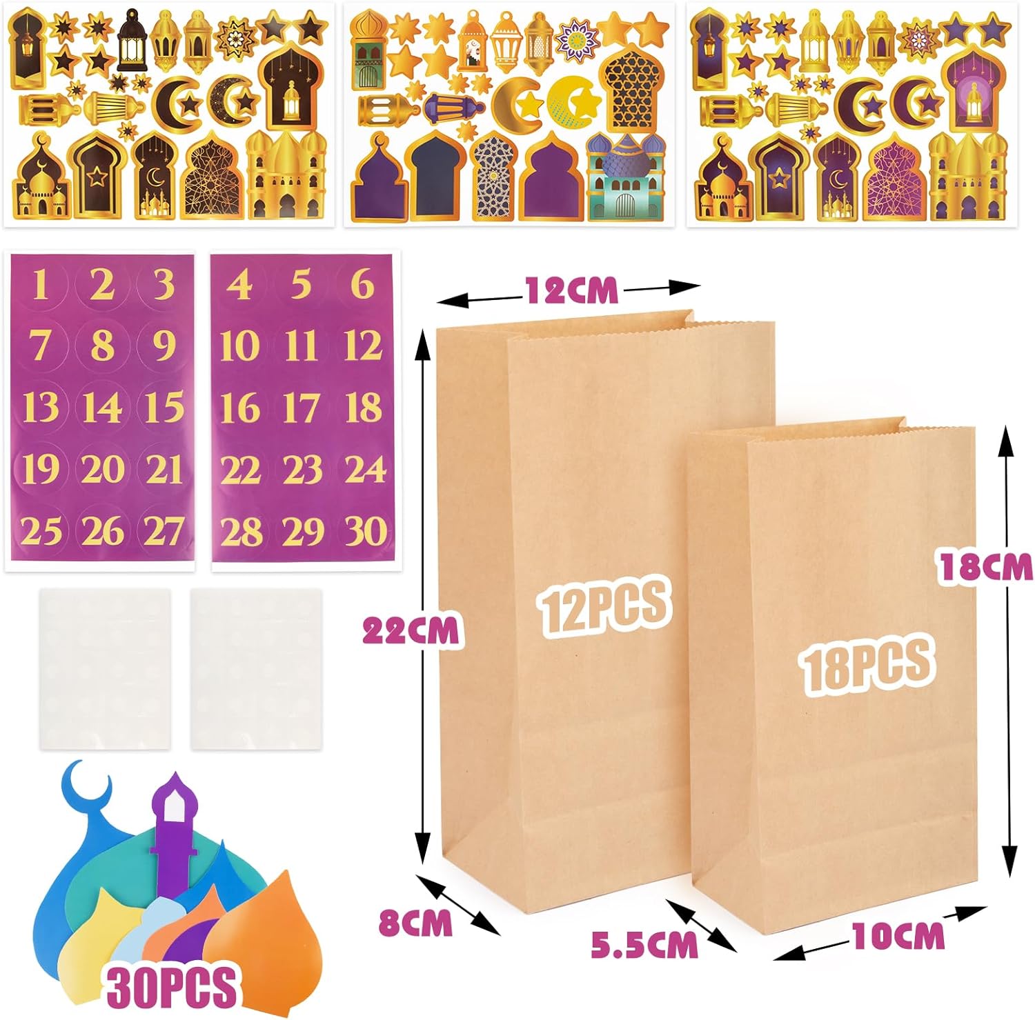 Contenuto della confezione: 30 calendari Ramadan da riempire + 30 adesivi con numeri 1-30 + 30 biglietti Ramadan + 3 adesivi Ramadan + 2 adesivi biadesivi. Materiale: utilizzo di carta di alta qualità. Dimensioni: la dimensione è 22×12×8 cm, 18×10×5,5 cm. Una meravigliosa idea regalo tradizionale per bambini e adulti. Decorazione perfetta per calendario Ramadan, sacchetti regalo Ramadan, sacchetti di carta, sacchetti di caramelle, feste, ecc.