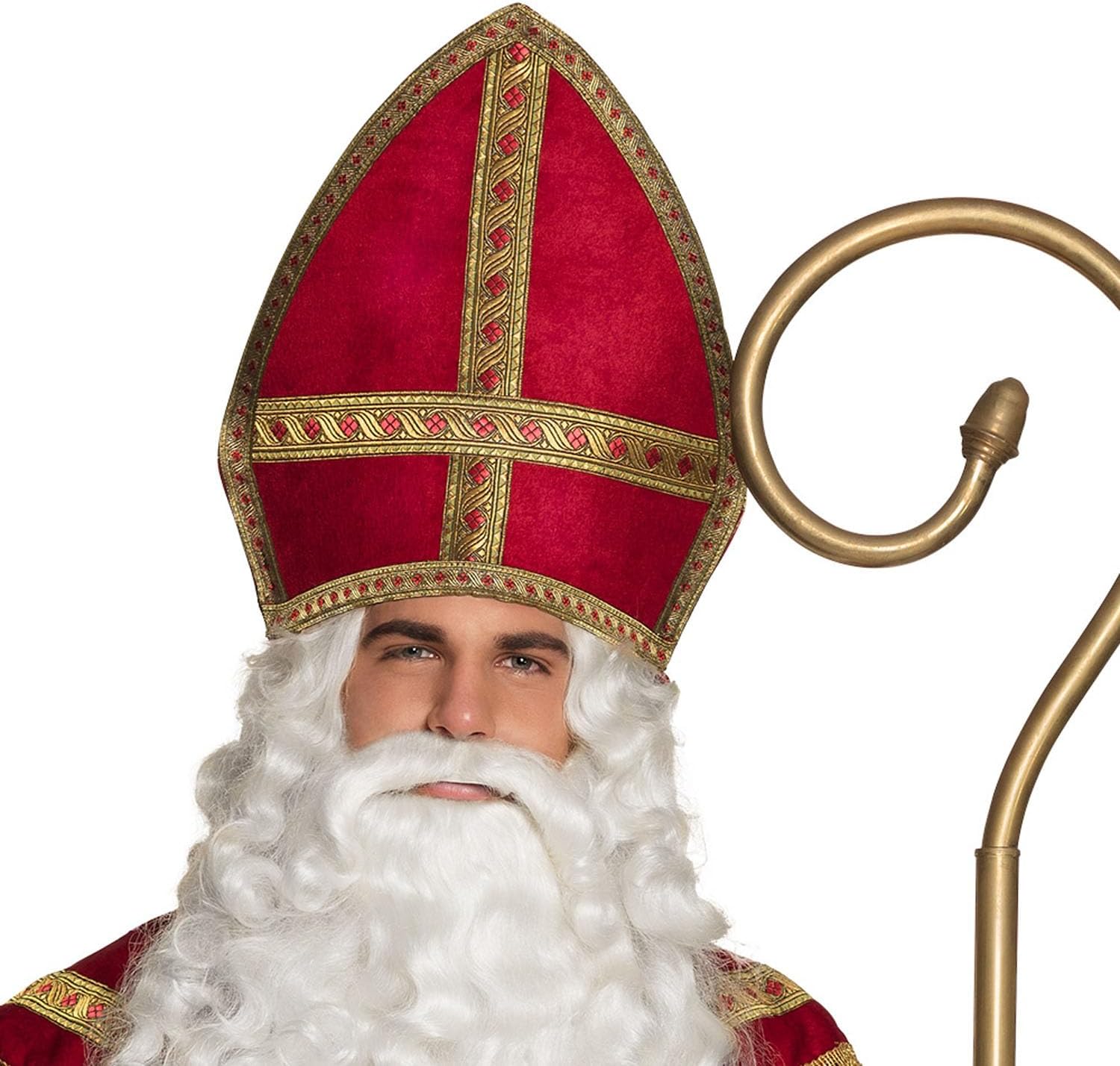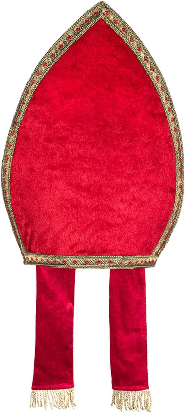Si tratta di un berretto di Babbo Natale della ditta Boland Il bellissimo berretto è di colore rosso con decorazioni dorate Questa mitra per adulti ha una dimensione di 35 x 33 cm Il bellissimo berretto è realizzato in 100% poliestere È perfetto da indossare durante il carnevale o per una festa in costume