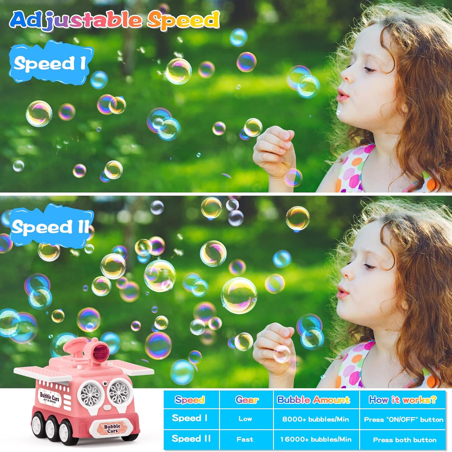 💦Macchina per bolle a fori multipli: macchina per bolle portatile con potenza super jet, 15.000-20.000+ bolle al minuto, che crea un oceano di bolle da sogno. Basta un tocco per accendere la macchina delle bolle e creare bolle frenetiche! Bolle + speciale luce LED a doppio effetto, le bolle brillano come un fiume di stelle nel cielo notturno. Lascia che tutti si immergano nel mondo delle bolle da sogno! 💦Macchina per bolle a doppia velocità: doppia potenza