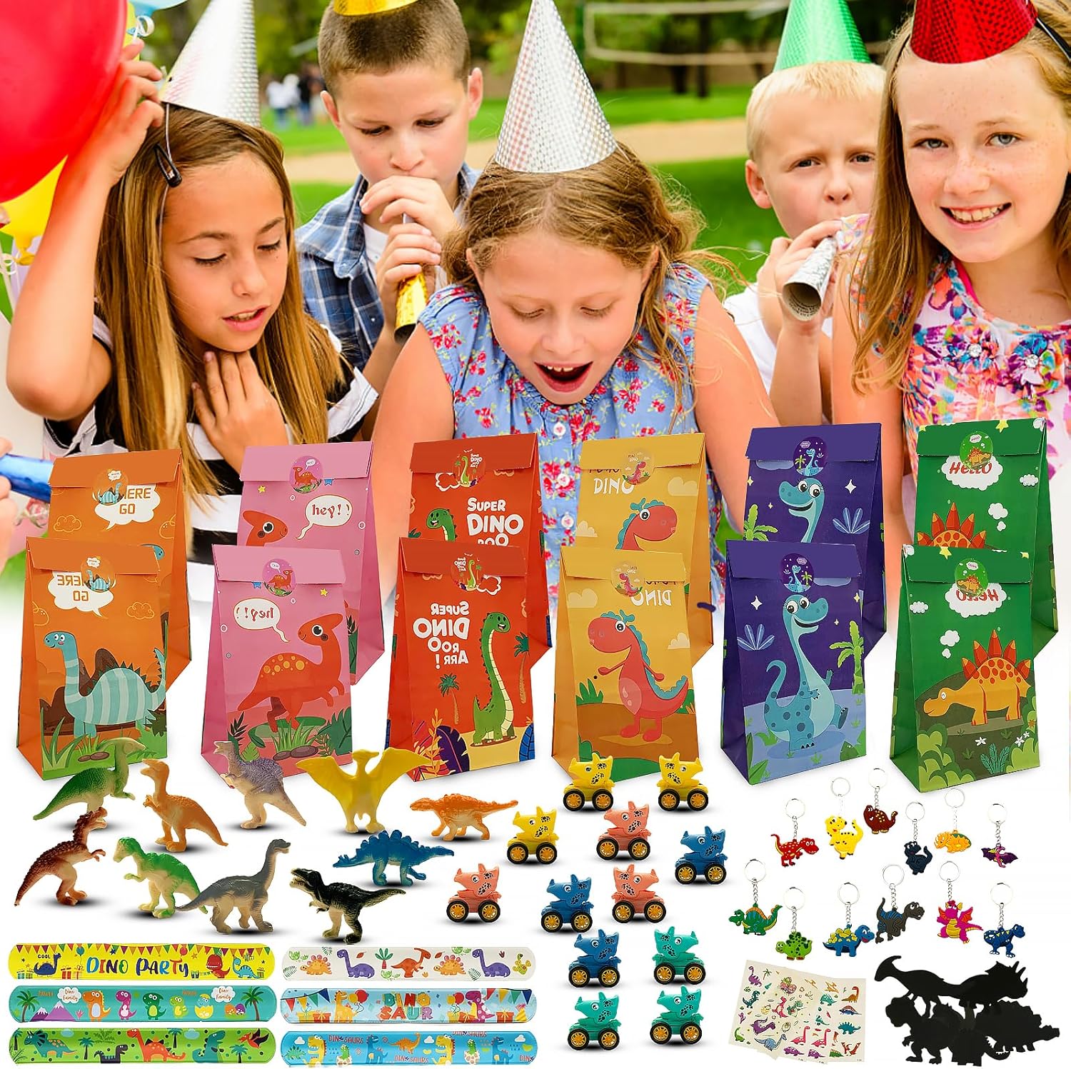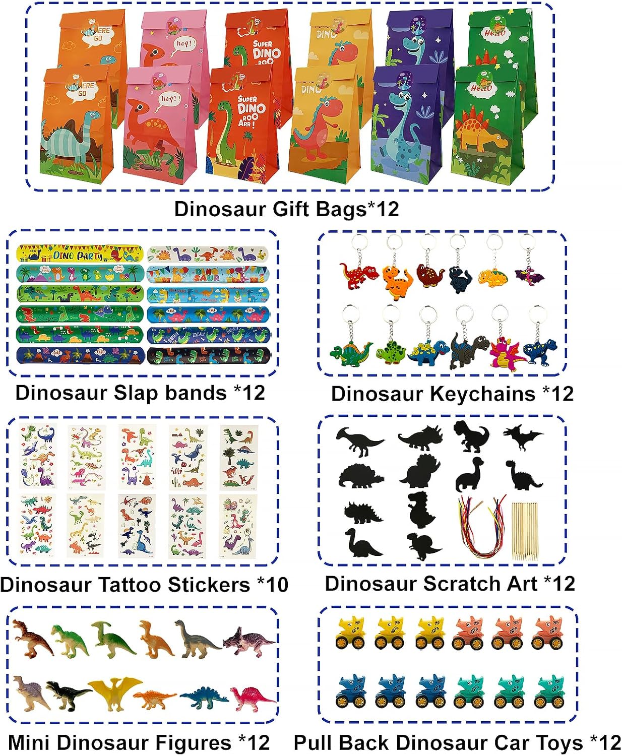 🦖 【Bomboniere con dinosauri per il compleanno dei bambini】 Il set di bomboniere con dinosauri contiene 12 set di disegni artistici da grattare con dinosauri, 12 mini figure di dinosauri, 12 portachiavi con dinosauri, 12 braccialetti con dinosauri, 12 sacchetti regalo con dinosauri, 10 luminosi adesivi per tatuaggi con dinosauri, 12 giocattoli con auto con dinosauri a scomparsa. Questo set contiene una varietà di sorprese che regaleranno a tuo figlio e ai suoi amici ricordi indelebili. 🌟 【Materiali di alta qualità】 I materiali utilizzati nel set sono principalmente PVC, carta e gomma, che sono durevoli e sicuri per garantire che i bambini siano sicuri e comodi durante l'utilizzo, e i bambini possono anche godersi a lungo il divertimento di questi articoli a tema dinosauri senza preoccuparsi di danni o usura. 🦕 【Valore educativo】 Gli elementi del set come il set di dinosauri da grattare e le mini figure di dinosauri non solo forniscono intrattenimento e divertimento, ma stimolano anche l'interesse dei bambini per i dinosauri e la scienza. I bambini possono utilizzare le immagini e i giocattoli da grattare per conoscere diverse specie di dinosauri e sviluppare le loro capacità di apprendimento e scoperta. 🌴 【Adesivi luminosi per tatuaggi di dinosauri】 Gli adesivi per tatuaggi di dinosauri si illuminano al buio, portando energia e divertimento alle feste dei bambini. Poiché sono realizzati con materiali sicuri e non tossici, i genitori possono essere certi che i loro bambini si divertiranno con questi tatuaggi fosforescenti. 🎉【Ampia gamma di scenari】Questo set non è adatto solo per le feste di compleanno dei bambini, ma anche per altre celebrazioni, feste, giornate di gioco e altre occasioni. Offre una vasta gamma di articoli per bambini di tutte le età, 3 4 5 6 7 8 9 anni, portando divertimento ed eleganza alle celebrazioni in una varietà di scenari.