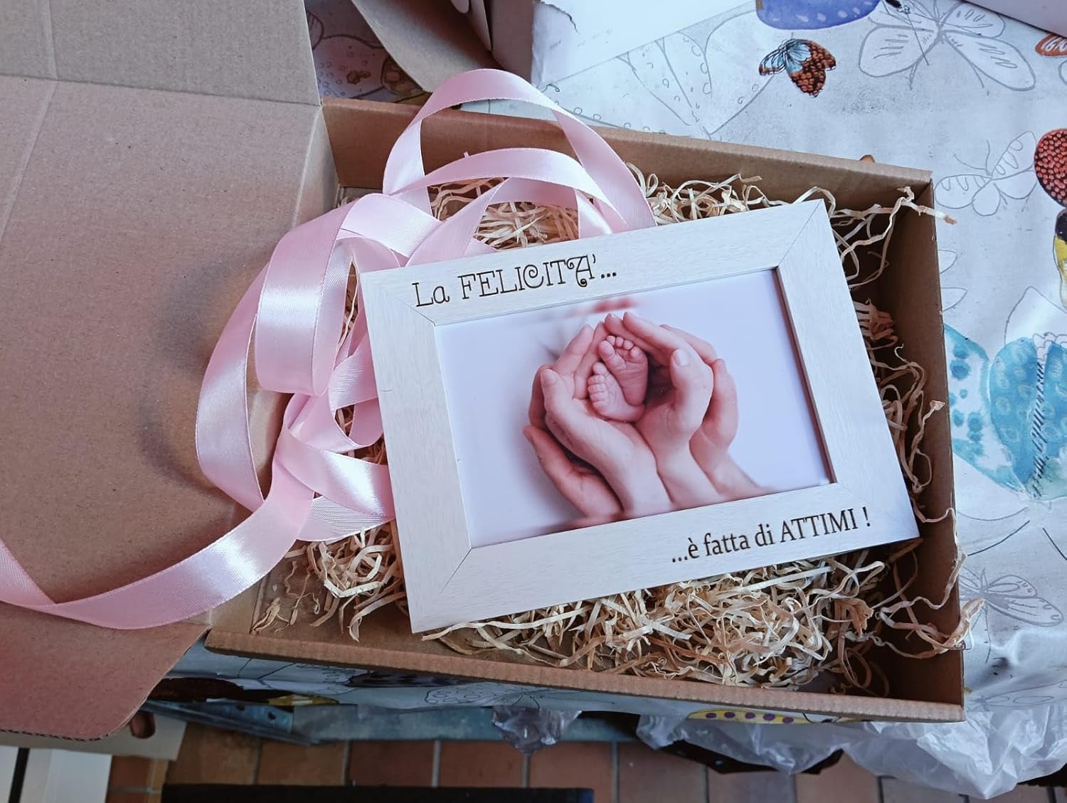 Cornice in Legno Naturale oppure Bianca 13x18 cm adatta come Bomboniere Nascita Bimbo oppure Battesimo Contiene all'interno una stampa di mani intrecciate che puo' essere facilmente sostituita con una foto 10x15 cm Viene fornita con scatola di cartone naturale e doppio fiocco all'interno (rosa e celeste) da utilizzarsi in base al sesso del neonato Puo' essere scelta in una delle due versioni : legno naturale oppure bianca entrambi molto delicate All'interno della scatola oppure sulla superficie è possibile inseire un sacchetto confetti oppure una scatolina portaconfetti