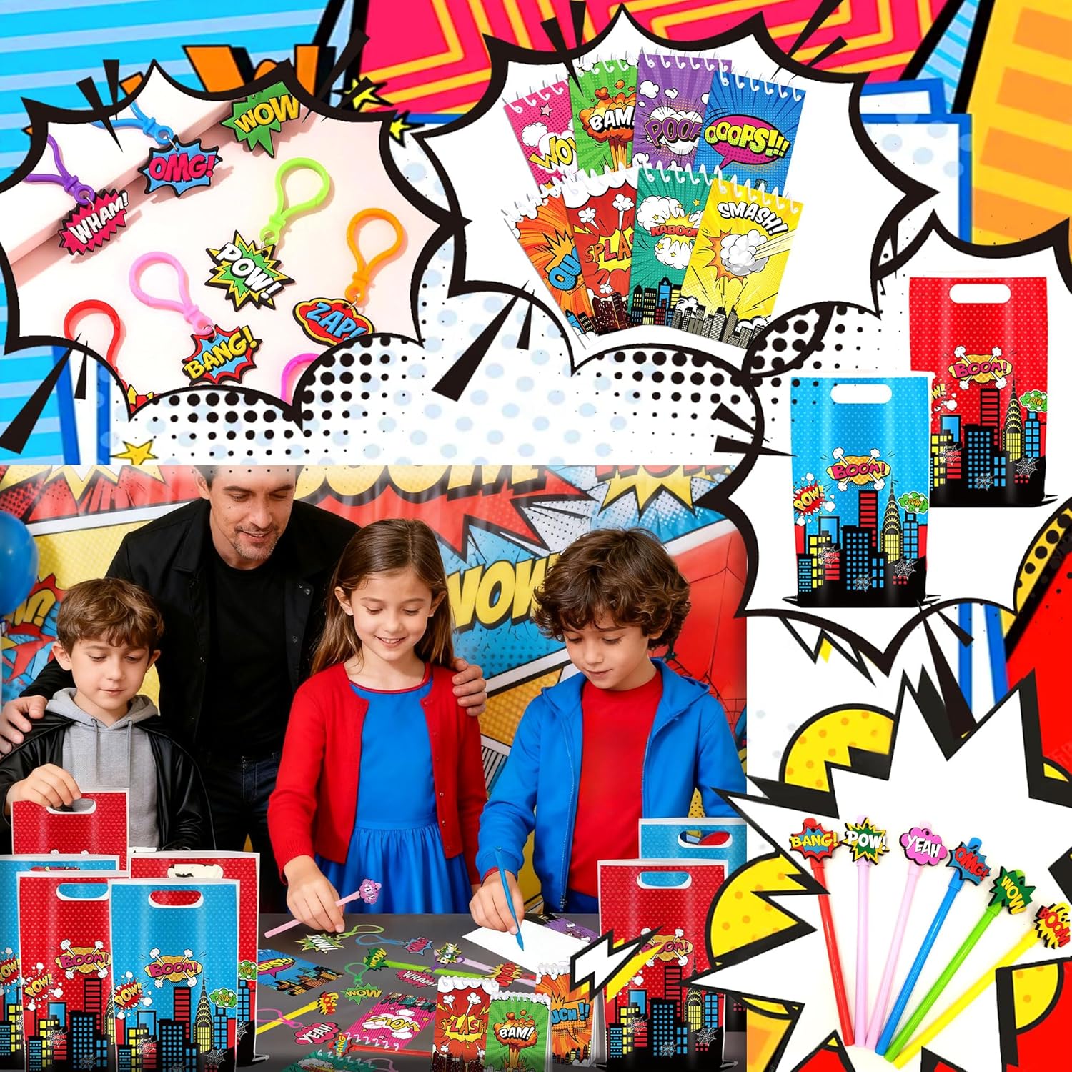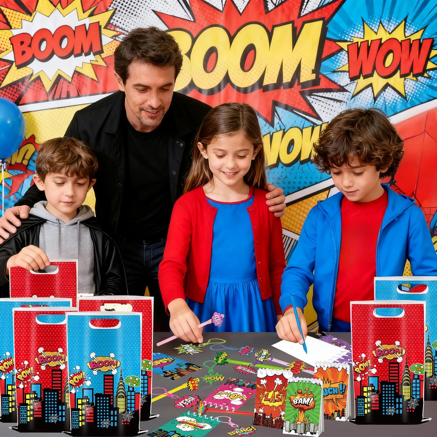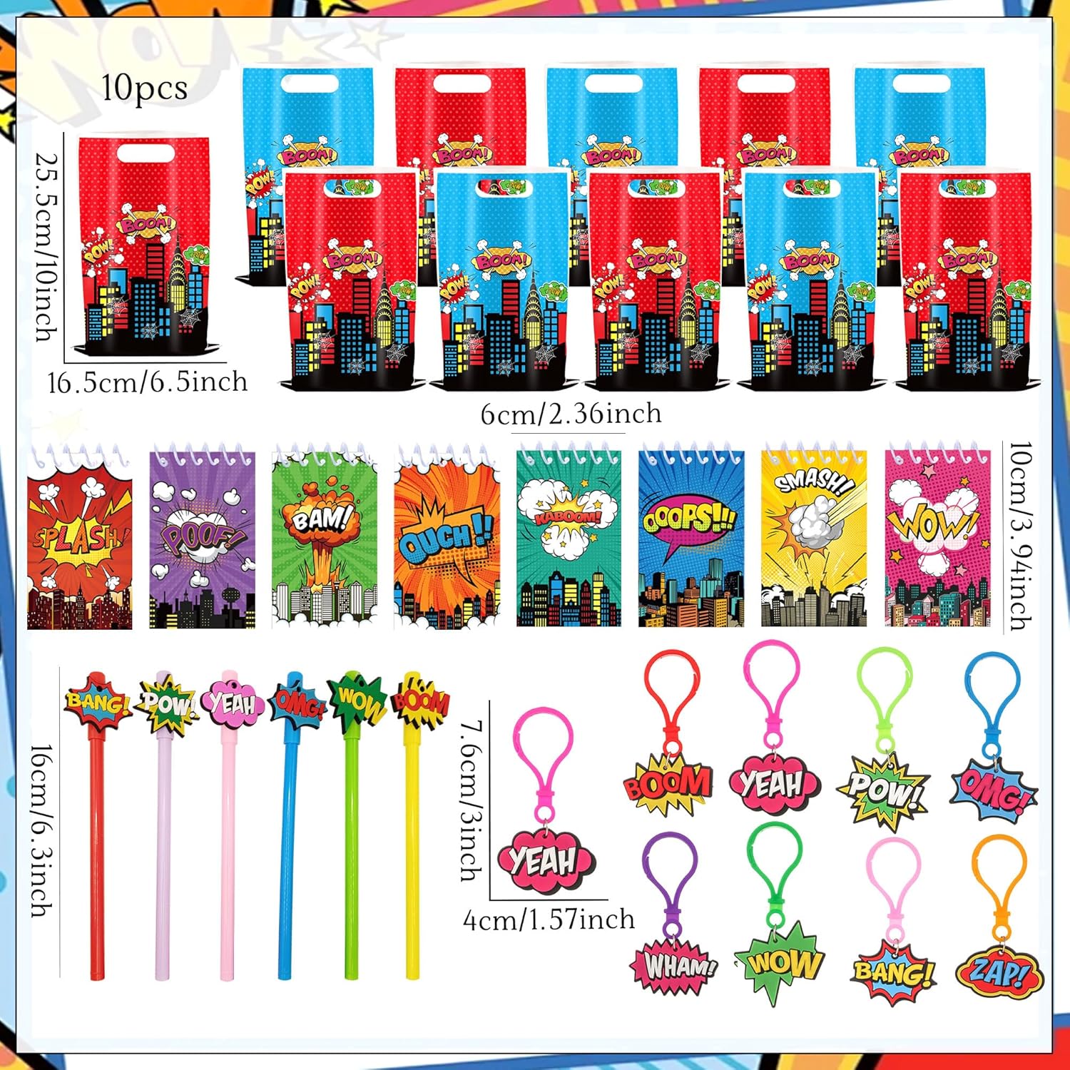 Include 10 sacchetti per bomboniere Eroe, 8 blocchi note a spirale Hero Party Favor, 6 penne e 8 badge a bottone, pronti a deliziare gli ospiti in qualsiasi evento a tema supereroe Le bomboniere dei supereroi sono ideali per feste di compleanno, carnevali o eventi scolastici, aggiungendo un elemento divertente e interattivo per bambini e adulti I quaderni a spirale Hero Party Favor misurano 10 cm x 6 cm, ideali per bomboniere e sacchetti regalo, con vivaci opere d'arte in stile fumetto con parole d'azione e paesaggi urbani Mini quaderni, penne e badge incoraggiano la creatività e la partecipazione, rendendoli ideali per giochi o cabine di carnevale Progettato per resistere all'eccitazione di qualsiasi festa, garantendo che i tuoi favori rimangano vivaci e divertenti per tutto il giorno