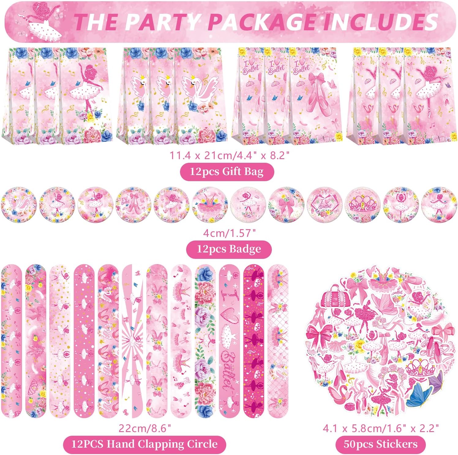 Riceverai: Riceverai un totale di 122 regali di compleanno per ballerine, 12 sacchetti regalo, 12 mini taccuini, 12 braccialetti di gomma, 50 adesivi, 12 adesivi di montaggio, 12 badge per bottoni, 12 braccialetti schiaffo, quantità sufficiente e stili fantastici possono soddisfare le tue esigenze per diversi tipi di forniture per feste di balletto. 【Design per feste con ballerine】 Tutti i tipi di ballerine a tema balletto, come balli, corone, cigni bianchi, scarpette da ballo, ecc., soddisfano pienamente l'immaginazione delle ragazze a tema ballerina. Se acquisti accessori per la festa di compleanno a tema ballerina per la tua ragazza sul tema del suo compleanno, questa festa renderà la ragazza indimenticabile. Misura adatta: i sacchetti regalo misurano ca. 11,4 cm x 21 cm; il mini taccuino misura circa 10 cm x 6 cm, i braccialetti misurano circa 21,6 x 3 cm. 【Materiale affidabile】 Le borse regalo a tema, gli adesivi e il mini blocco note sono realizzati con pesanti cartoncini di carta riciclabile. I badge dei pulsanti sono realizzati in lega e i braccialetti slap sono costituiti principalmente da nuclei metallici resistenti all'interno e avvolti strettamente con materiale morbido all'esterno. 【Scene applicabili】 Queste forniture per feste di compleanno a tema ballerina sono molto adatte per celebrare feste a tema ballerina, baby shower, premi in classe, premi in classe, ecc. Possono anche essere usati come premi in classe o a casa per incoraggiare studenti e bambini.