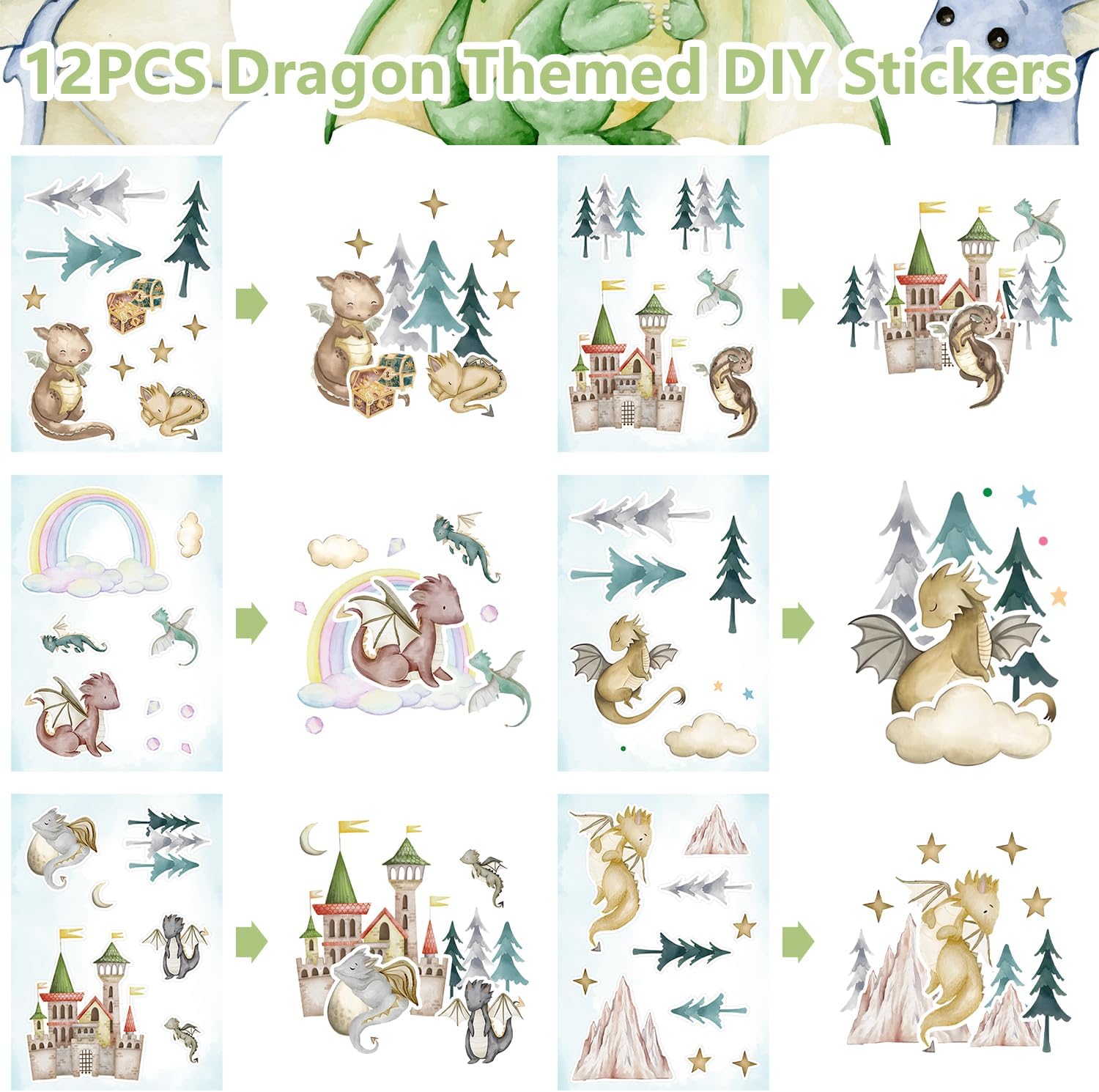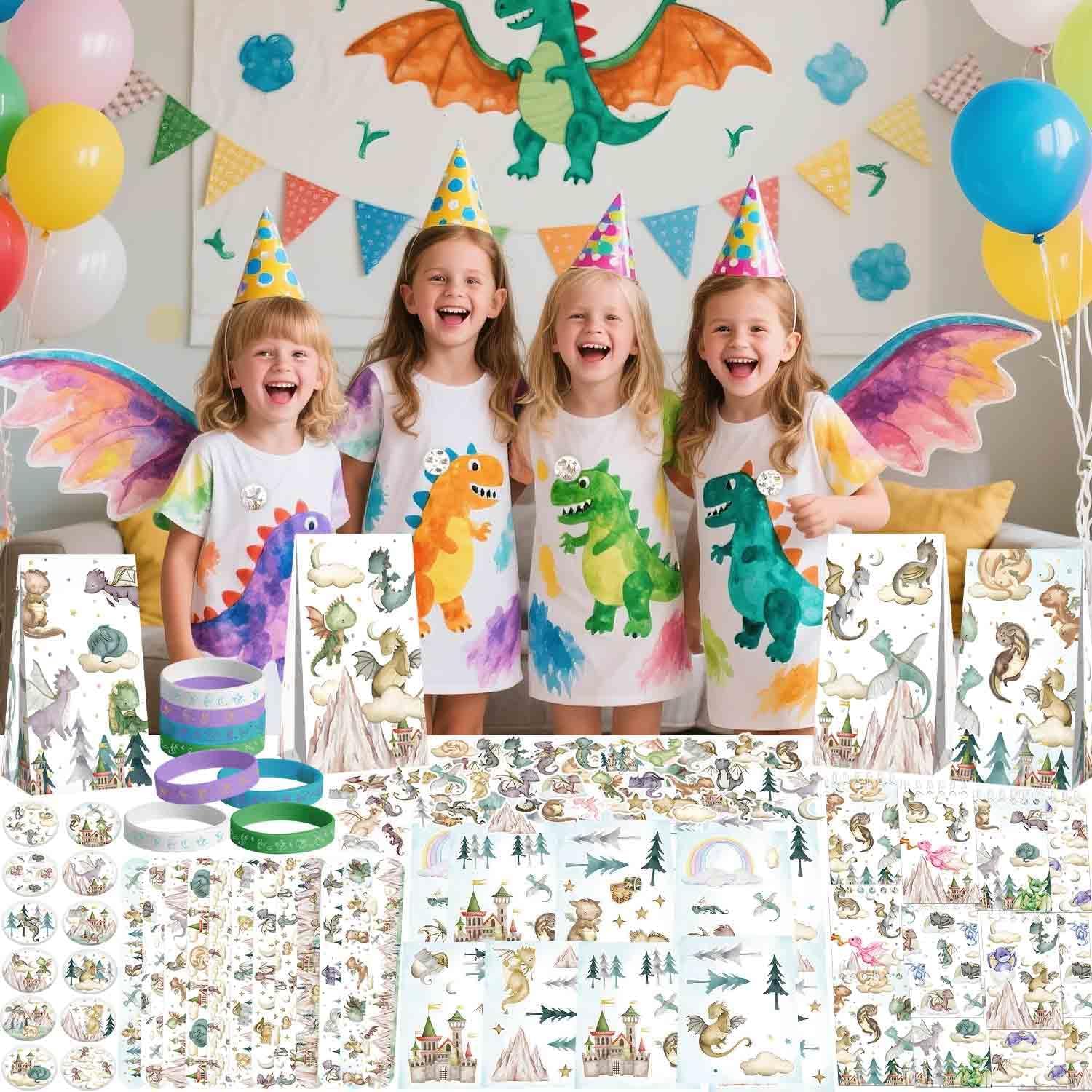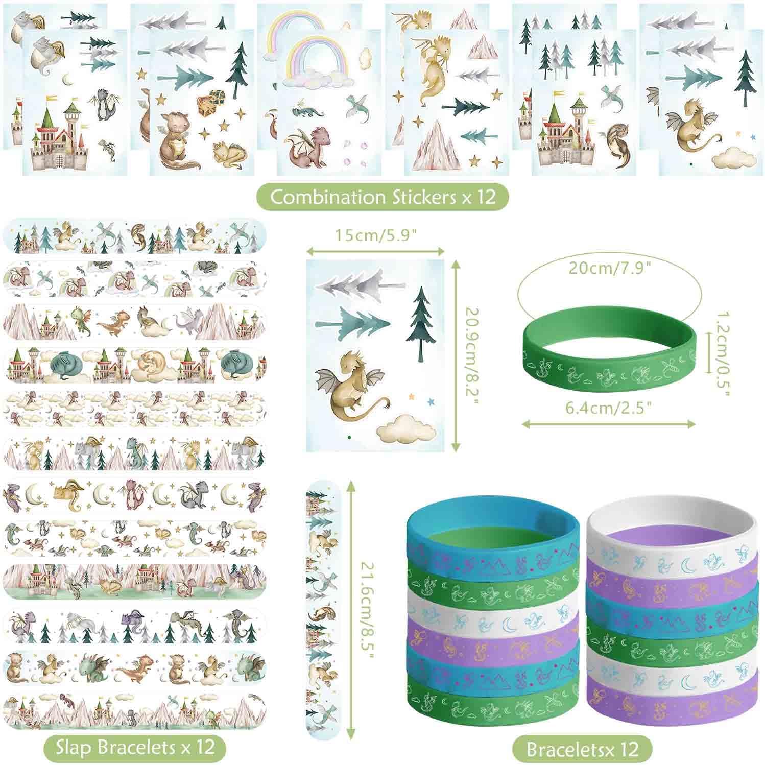 Forniture per feste a forma di drago: include 12 braccialetti, 50 adesivi per bagagli, 12 sacchetti regalo, 12 braccialetti schiaffi, 12 adesivi fai da te (4 stili) e 12 badge a tema drago, sufficienti per i bambini da condividere con gli altri per divertirsi, e puoi confezionarli nei sacchetti per feste come omaggi per gli ospiti. Materiale: Dragon favorisce borse e bicchieri di carta realizzati in carta ecologica, gli adesivi sono realizzati in schiuma impermeabile, circa lasciare tracce quando strappati, braccialetti realizzati in materiale resistente, flessibile ma forte. Braccialetti Dragon Slap: queste bomboniere sono realizzate in materiali PVC, comodi e sicuri da indossare, basta picchiettarli delicatamente sul polso e formeranno un cerchio e indossarlo saldamente al polso. Design magico del drago: le nostre bomboniere per feste a forma di drago ad acquerello presentano una combinazione di draghi, nuvole, arcobaleni, castelli, montagne e disegni carini, pose ed espressioni del drago, alcuni sono seduti, sdraiati, dormono e volano, che possono creare un pieno di mistero e fantasia stile drago per la tua festa. Occasioni applicabili: il set di bomboniere per feste a tema drago ad acquerello è ideale per feste di compleanno a tema drago, riunioni di amici, baby shower, feste di laurea, feste di Halloween, anche gli ornamenti quotidiani per la casa e così via.