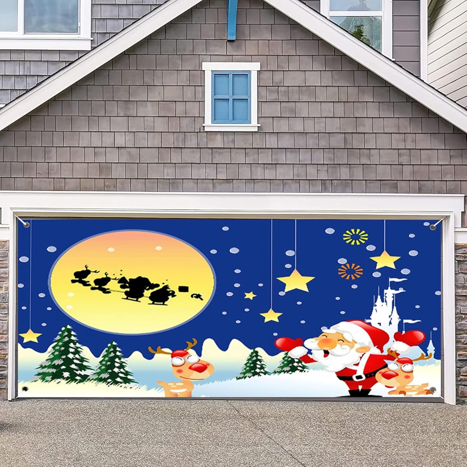 Bomboniere per feste di compleanno per bambini dagli 8 ai 12 anni, striscione blu per porta del garage, motivo: giorno di slitta con cervi, grandi decorazioni natalizie, copertura in