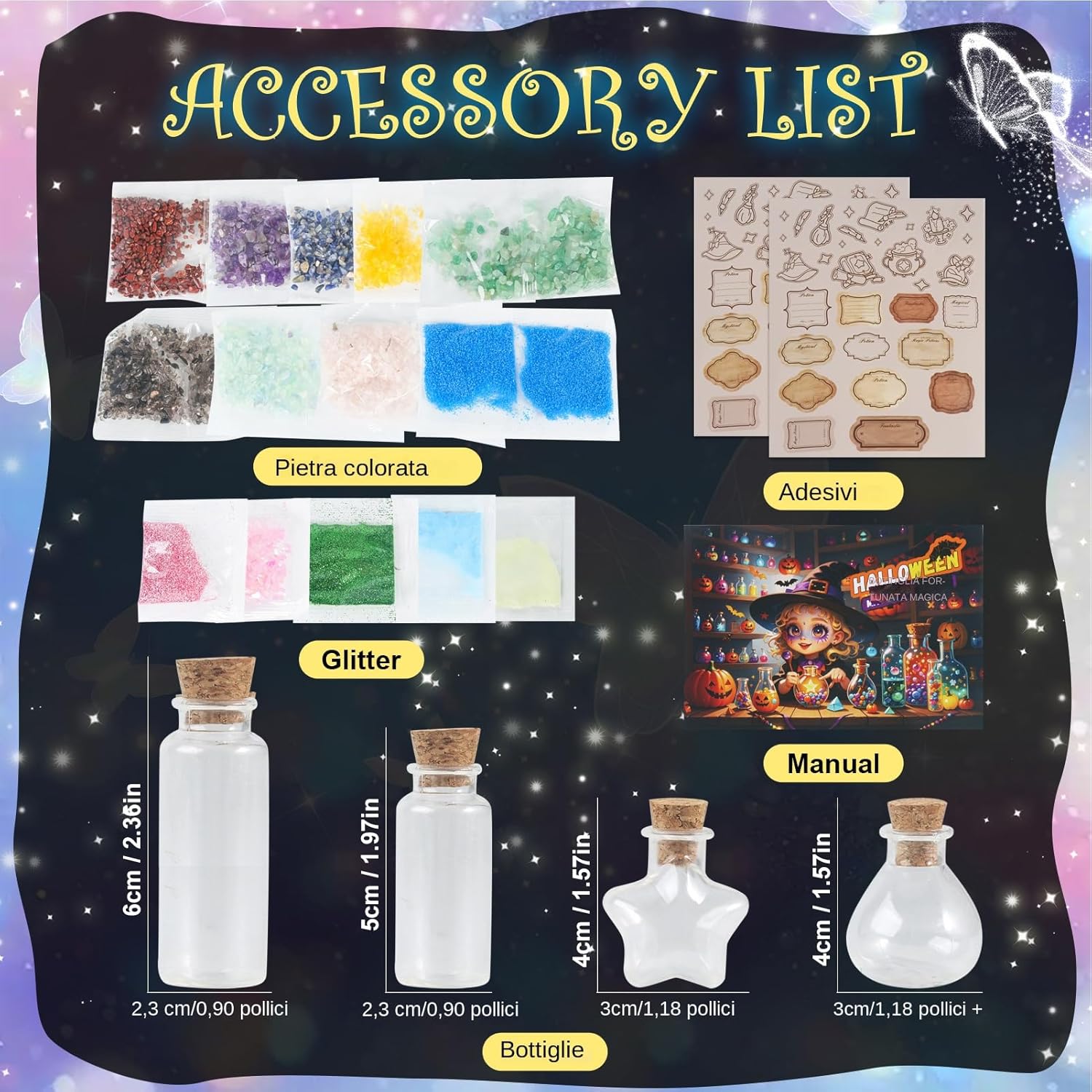 Materiali durevoli: utilizzando materiali selezionati di alta qualità, il nostro kit artigianale per pozioni misteriose garantisce un utilizzo sicuro in PP e offre un'esperienza di creazione affidabile e robusta per tutte le età Incoraggia il familiare: scopri l'incantevole mondo della creazione di fate con il nostro kit artigianale per pozioni misteriose. I genitori possono accompagnare i propri figli mentre e realizzano oggetti unici con bottiglie speranzose Immergiti nel mondo mistico: con il kit artigianale per pozioni misteriose Violet Rich, libera la tua immaginazione e creatività utilizzando bottiglie mistiche, incantevoli adesivi fatati, glitter portafortuna, pietre di e altri oggetti incantevoli per creare pozioni e incantesimi mistici Regalo favorevole: il nostro kit artigianale per pozioni misteriose è proprio ciò di cui hai bisogno. Ricco di divertimento in più, questo kit è un regalo fantastico per i bambini dai 6 anni in su, in occasione di compleanni e festività speciali Utilizzo pratico: mantieni le creazioni di tuo figlio pulite e ordinate con il nostro kit artigianale per pozioni misteriose. La scatola include glitter fatati per un tocco mistico e una scatola mistica per esporre con orgoglio le pozioni del mago