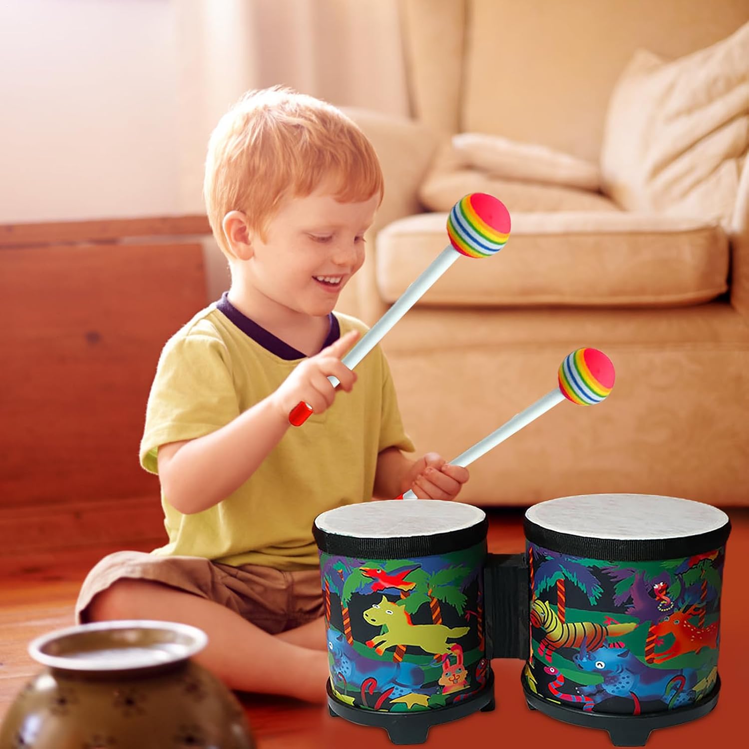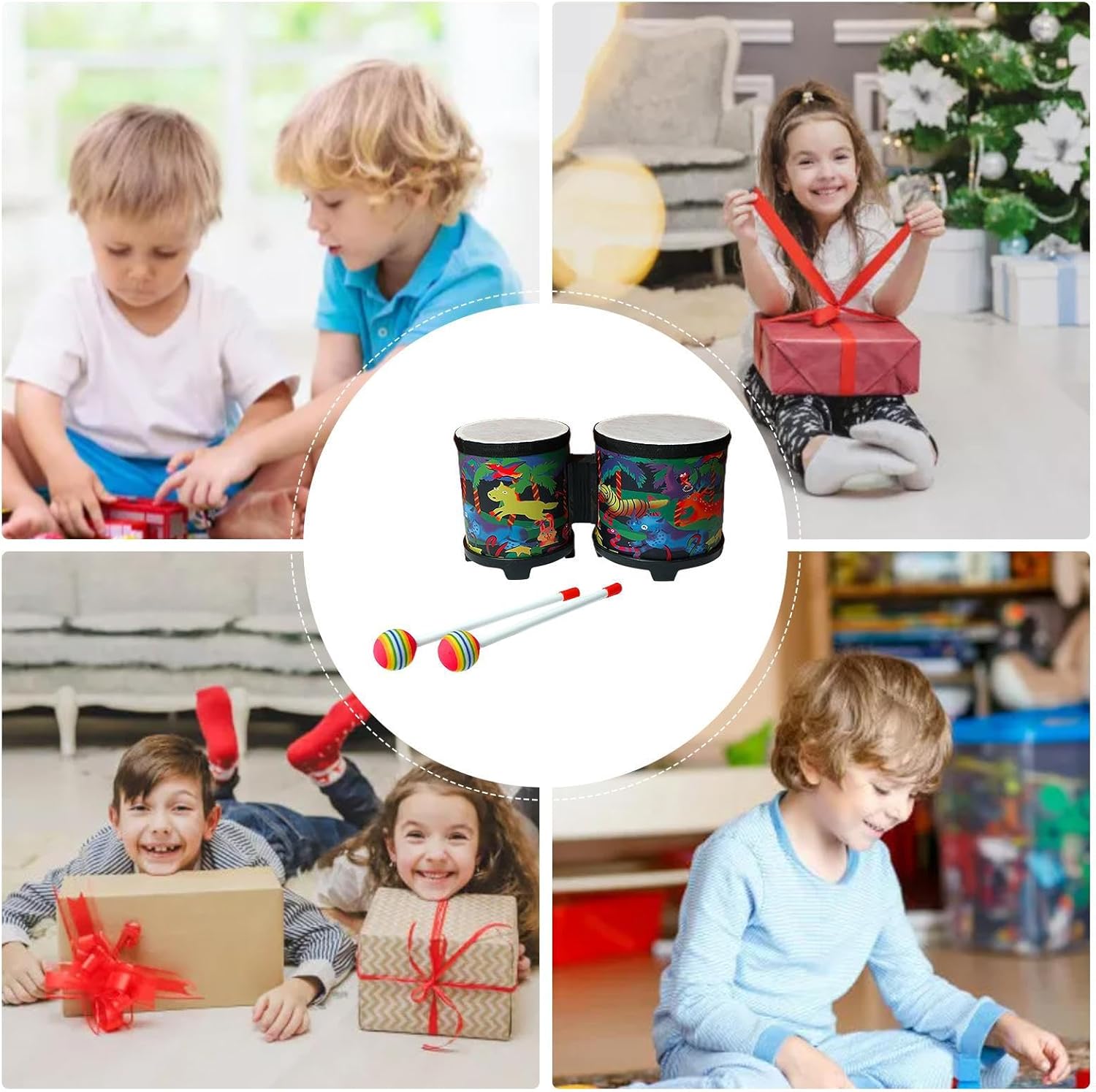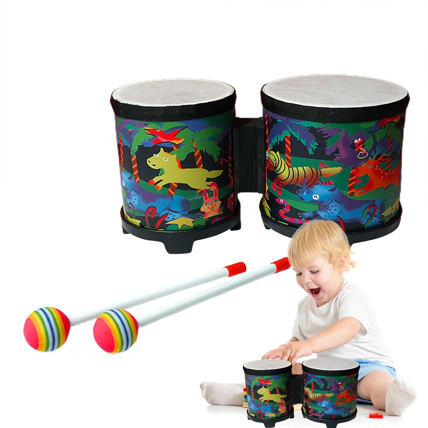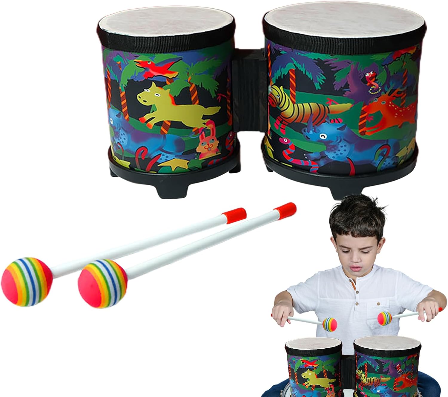 Eccellente stabilità: il nostro Bongo Drum offre un'eccellente stabilità per prestazioni perfette con una chiara articolazione degli strumenti a percussione. Adatto per adulti, bambini e piccoli, viene fornito con un martello e superfici saldamente fissate per un forte senso del ritmo. Affidabile e resistente: costruito in legno e materiali ABS di ottima qualità, il nostro tamburo bongo garantisce durata e buona qualità nel tempo. I cerchi lisci garantiscono la massima sicurezza per gli adulti e gli adulti. Design abbagliante: il tamburo bongo presenta colori vivaci, motivi ricchi e squisita lavorazione. Dopo un superbo processo di stampa e tintura, il tamburo non si sbiadisce facilmente e mantiene la sua bellezza a lungo. Design accattivante: stupisci i tuoi cari con gli animali della giungla, le creature marine e i volti umani di questo tamburo bongo. L'eccezionale qualità del suono e il design accattivante lo rendono un regalo perfetto per ogni occasione speciale, come compleanni, Natale e molto altro ancora. Sviluppo delle competenze: promuove la creatività e migliora la coordinazione fisica, i talenti musicali, l'attenzione e l'intelligenza con il nostro tamburo bongo educativo.