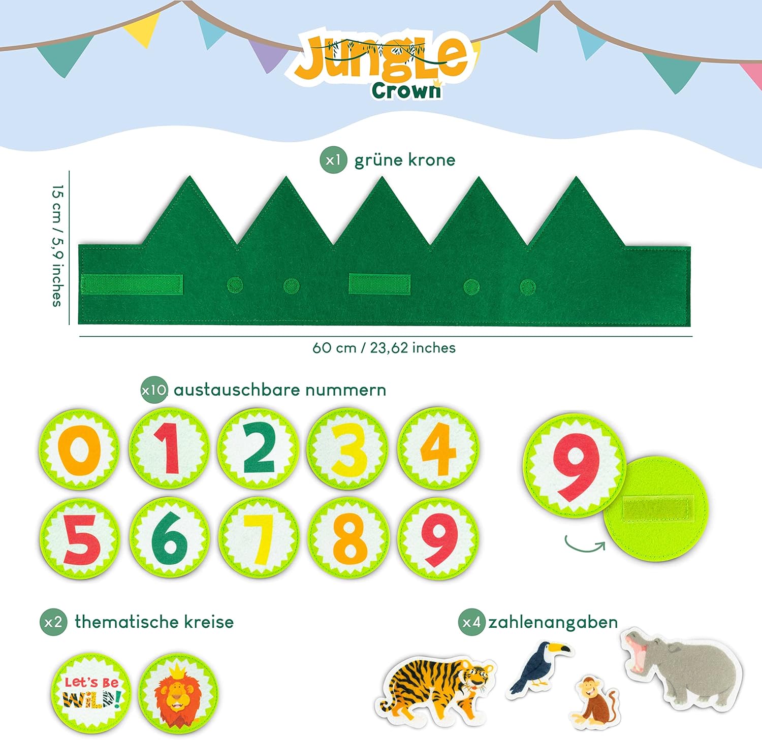 Wir haben bewusst nach einer langlebigen Geburtstagskrone gesucht, die auch noch nach dem 9. Geburtstag genutzt werden kann. Mit dieser Krone ist das ohne Probleme möglich. Für Schnappszahlen muss jedoch auch hier etwas kreativ werden.