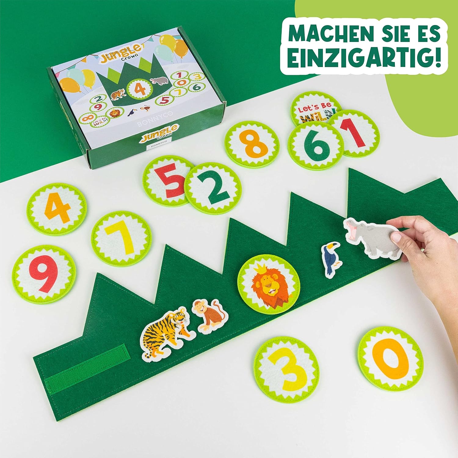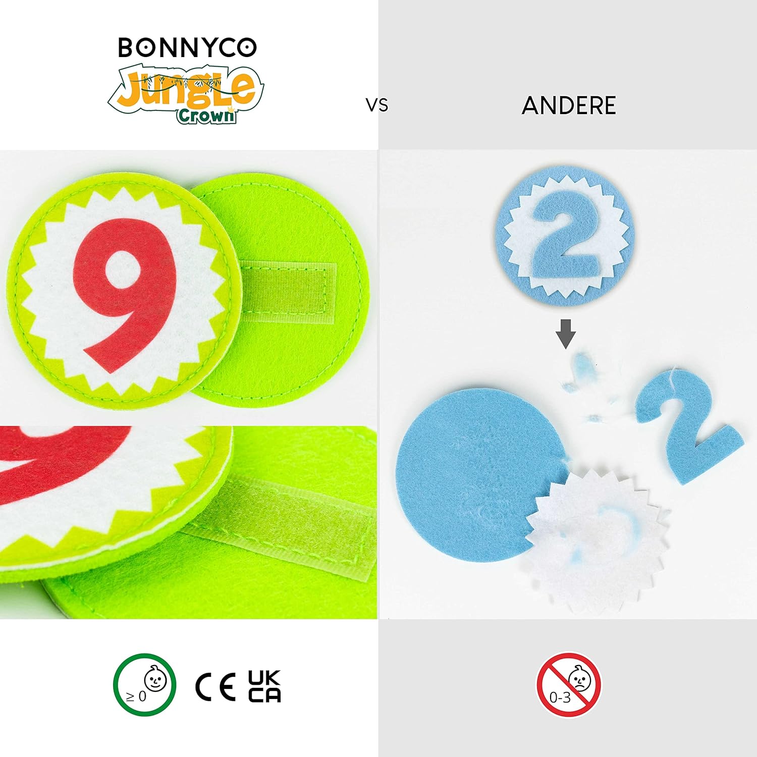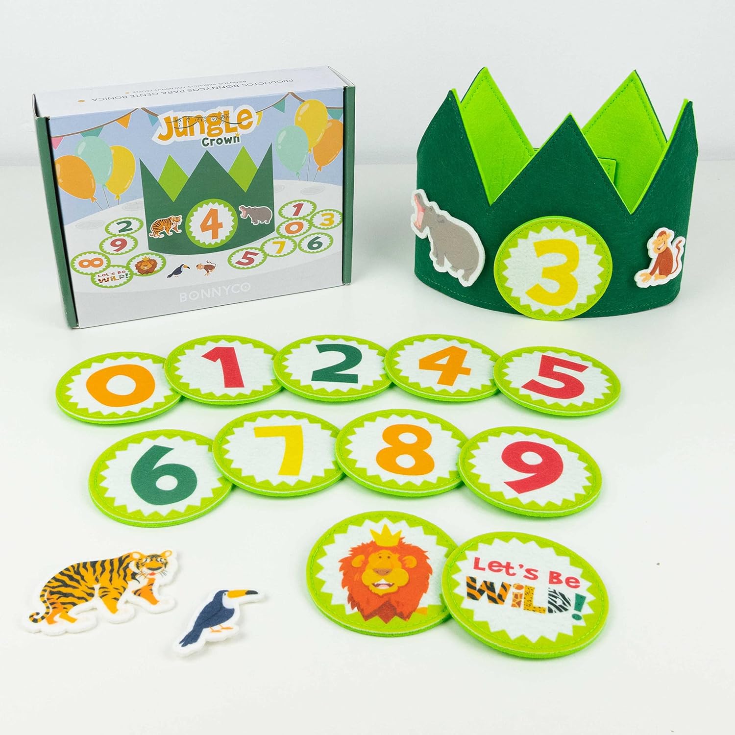 Très mignonne couronne, parfaite pour un thème animaux de la jungle. Les chiffres fournis permettent de la réutiliser chaque année, ce qui est un vrai plus. Les couleurs sont vives, le feutre est doux, et le design plaît beaucoup aux enfants comme aux parents. Petit bémol cependant : le scratch est un peu faible, surtout pour un bébé d’un an qui bouge beaucoup. Il a tendance à se détacher facilement si l’enfant tire un peu dessus ou bouge trop. Une fixation un peu plus solide serait bienvenue. Cela reste un bon produit pour les photos et les souvenirs !