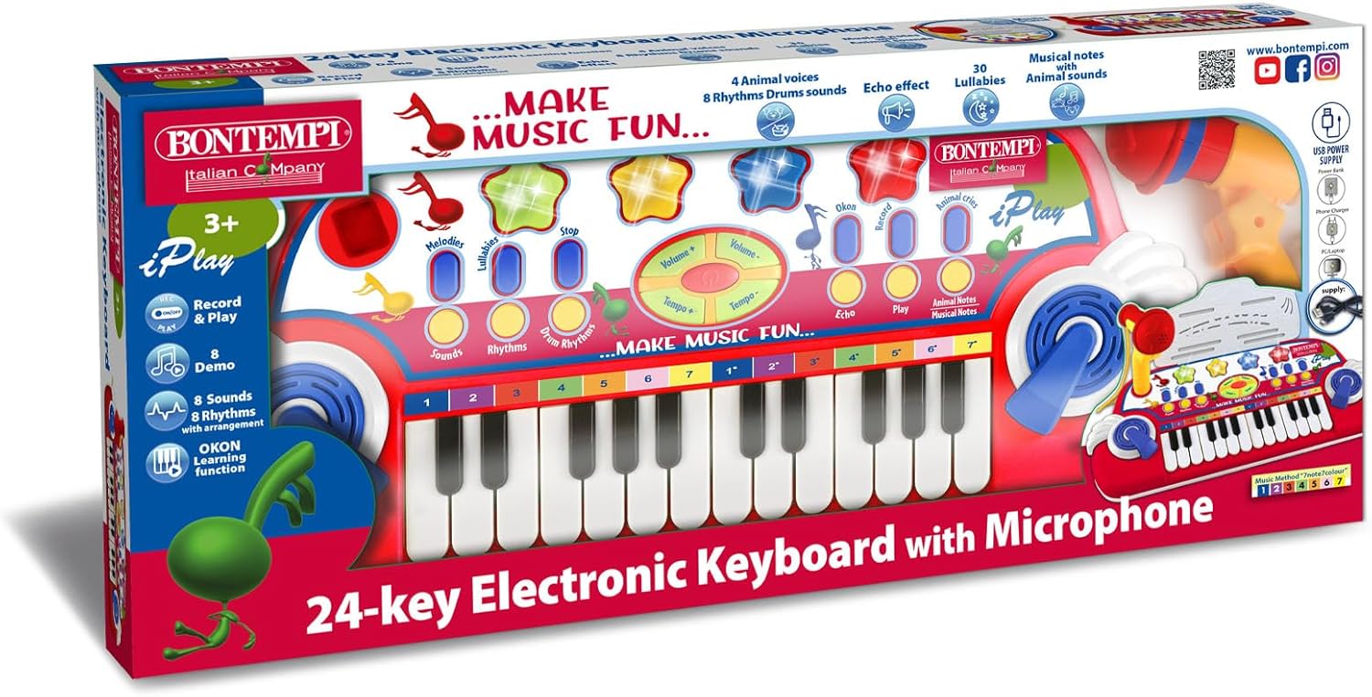Scopri il mondo della musica: tastiera a 24 tasti per iniziare il viaggio musicale. Microfono integrato: aggiungi la tua voce ai brani per prestazioni personalizzate. Leggio incluso: comodità durante le sessioni musicali dei piccoli artisti, permette di vedere comodamente le note. Design colorato e accattivante: promuove la creatività ed è un divertimento musicale. Facile da usare: perfetto per i bambini che vogliono imparare giocando.