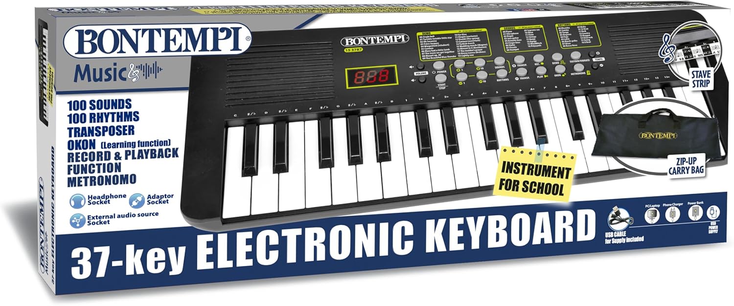 TASTIERA DIGITALE AVANZATA: la tastiera musicale a 37 tasti offre un'esperienza di gioco avanzata, ideale per musicisti di tutti i livelli. Dotato di presa USB-C per la ricarica della batteria integrata. SPESSORE OTTIMIZZATO DEI FRETI: con uno spazio di 2 cm tra i tasti, offre una sensazione di gioco comoda e precisa. PRESA PER CUFFIE: ti permette di suonare in privato senza disturbare gli altri, ideale per sessioni di pratica tranquille. STRISCIA PENTAGRAMMA INTEGRATA: facilita la lettura degli spartiti durante l'esecuzione e garantisce un'interpretazione accurata della musica. METRONOMO E TRASPOSITORE: Permettono all'utente di tenere il tempo mentre si esercita e di trasporre facilmente l'altezza della musica in base alle preferenze dell'utente.