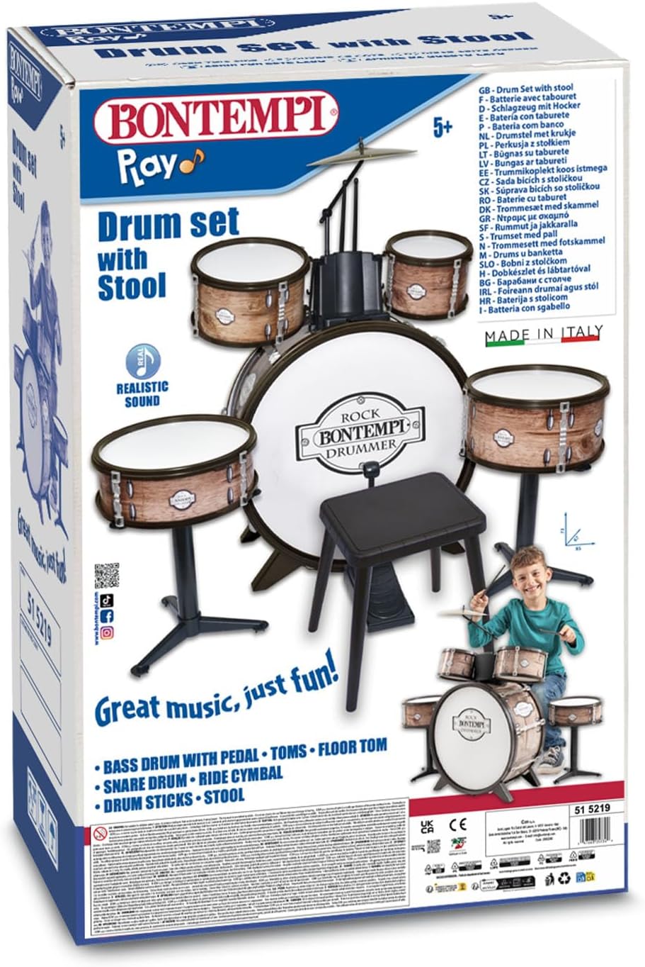 BATTERIA COMPLETA: Set di batteria con grancassa, tamburi e piatto per un'esperienza musicale completa. SUONO REALISTICO: Progettata per offrire un suono autentico, ideale per i giovani musicisti. DIMENSIONI COMPATTE: Misure di 700x400x800mm, perfette per spazi ridotti. ACCESSORI INCLUSI: Corredato di sgabello e 2 bacchette per iniziare a suonare subito. MADE IN ITALY: Realizzato con materiali di qualità per garantire durata e resistenza.