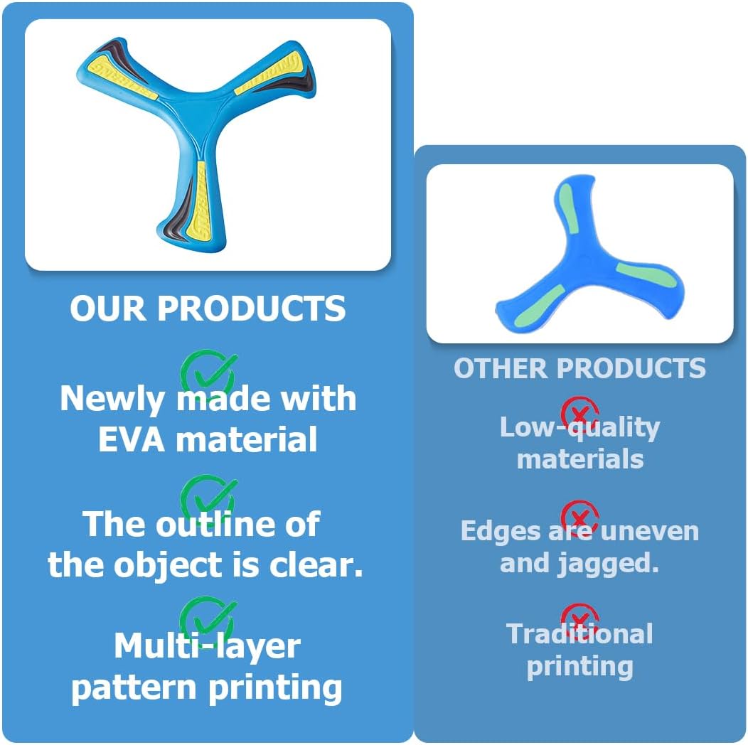 Materiale sicuro: realizzato in morbido materiale EVA ad alta densità, è sicuro, morbido e leggero. Anche se toccato accidentalmente durante il gioco, non c'è rischio di lesioni, offrendo tranquillità ai genitori. Resistente e durevole: caratterizzato da una stampa multistrato con contorni nitidi e una lavorazione raffinata, vanta una longevità eccezionale. Resiste a lanci ripetuti senza subire danni, offrendo un ottimo rapporto qualità-prezzo. Altamente coinvolgente: progettato specificamente per gli spazi aperti all'aperto, ruota in modo stabile quando viene lanciato, offrendo ai bambini un divertimento coinvolgente. Aiuta i bambini a staccarsi dai dispositivi elettronici e a godersi il tempo all'aria aperta. Materiali di alta qualità: realizzato con materiali di alta qualità e sottoposto a rigorosi controlli di qualità dalle materie prime alla produzione, garantisce una qualità eccezionale. Una scelta eccellente per i giochi all'aperto. Volo stabile: essendo un boomerang ad alte prestazioni, il suo design aerodinamico garantisce un volo fluido e un ritorno affidabile, offrendo ai bambini un divertimento prolungato.