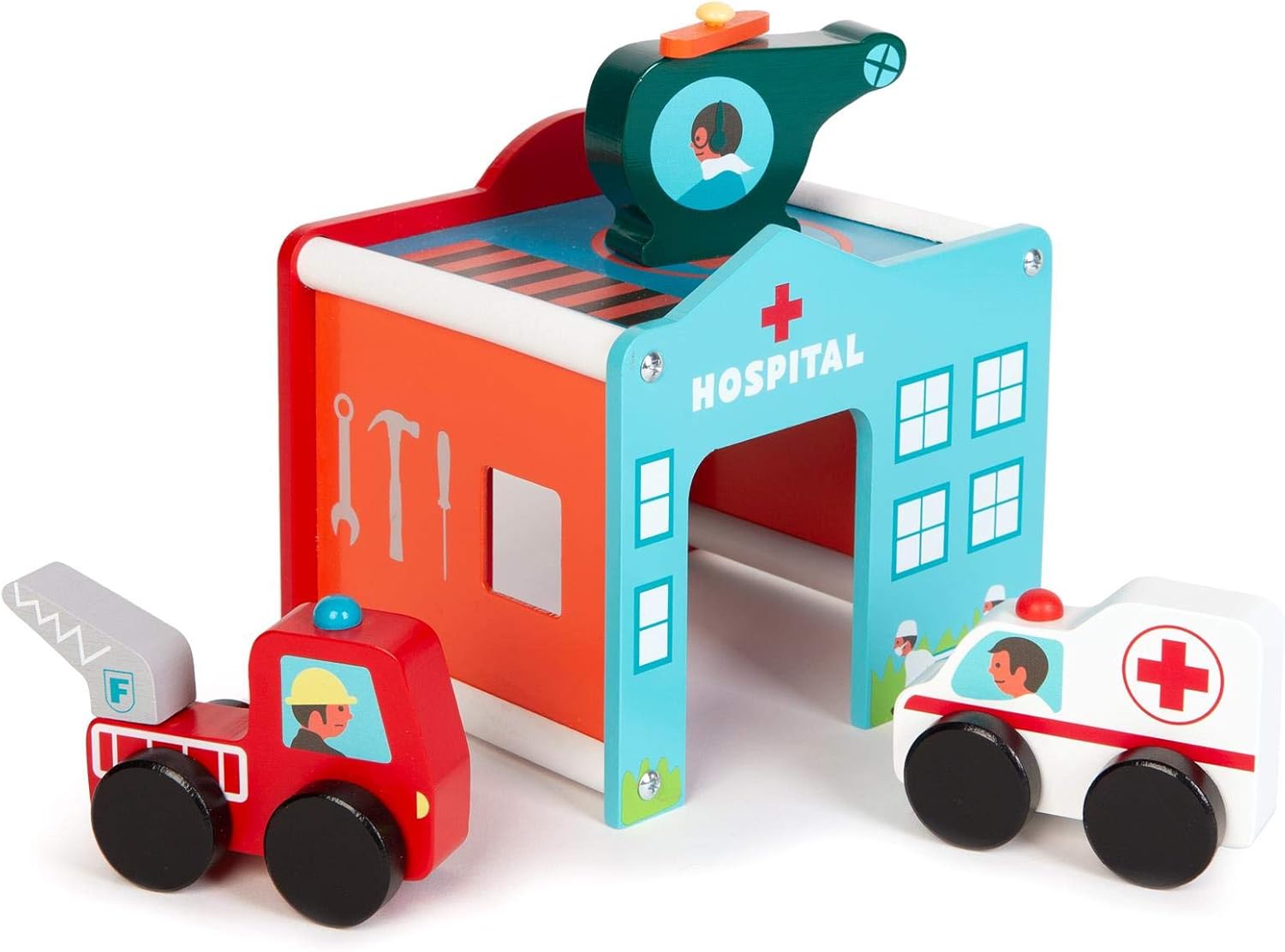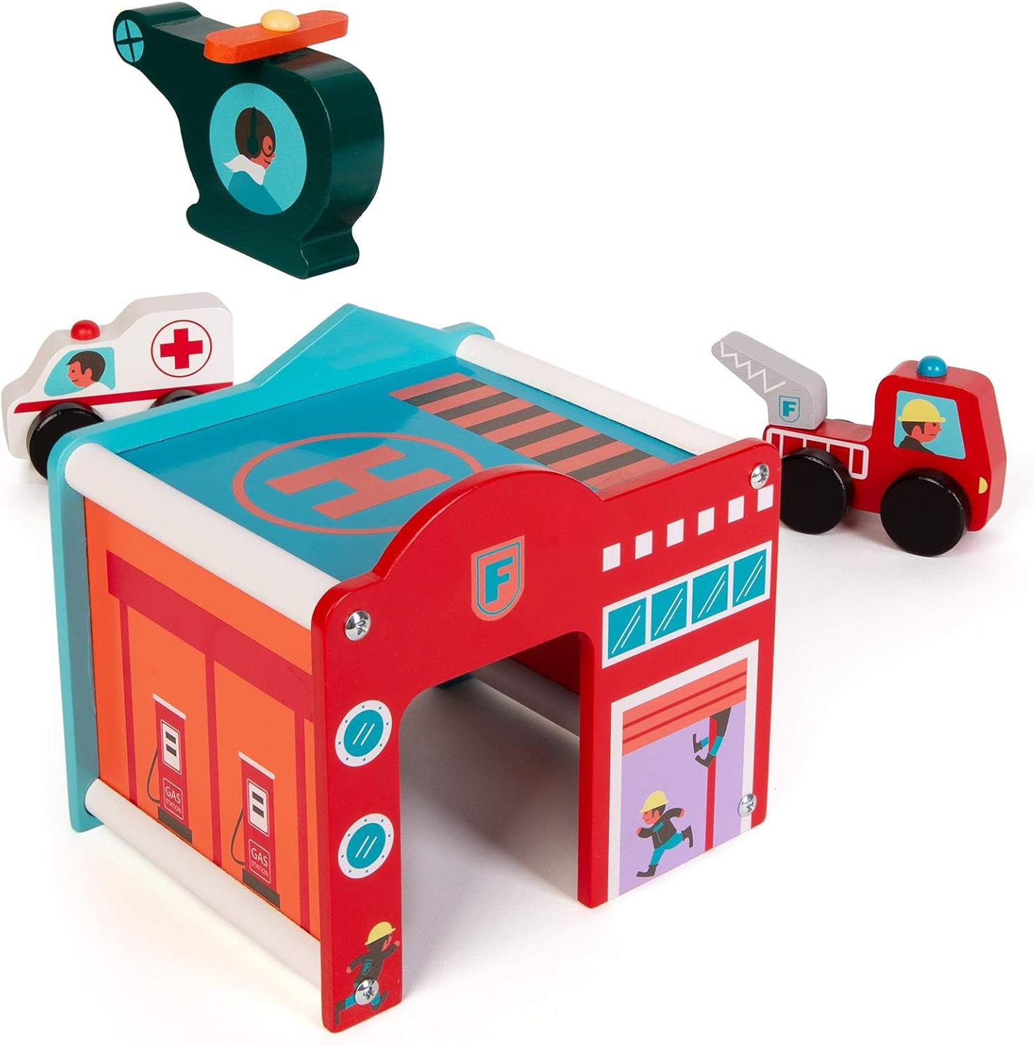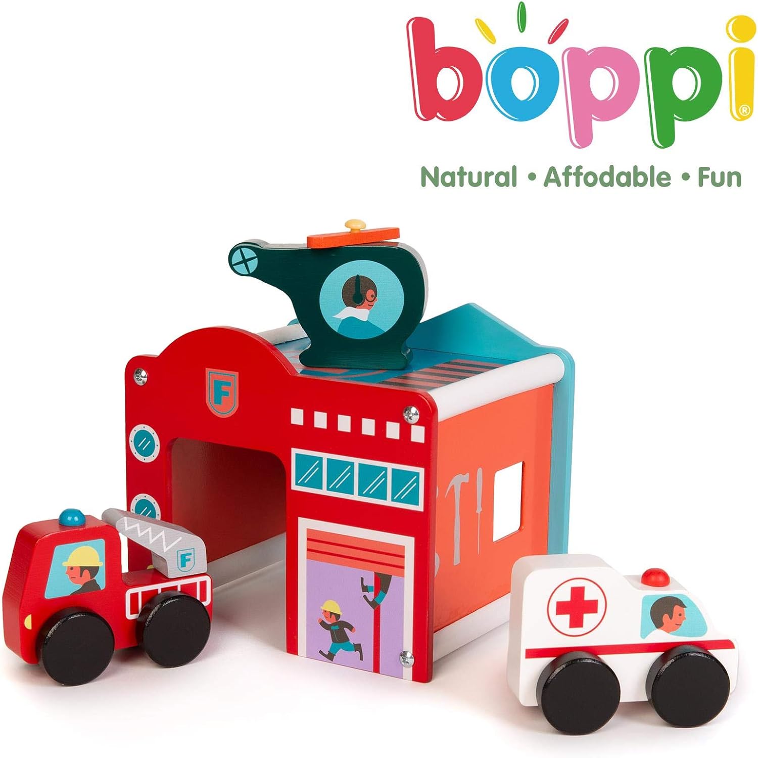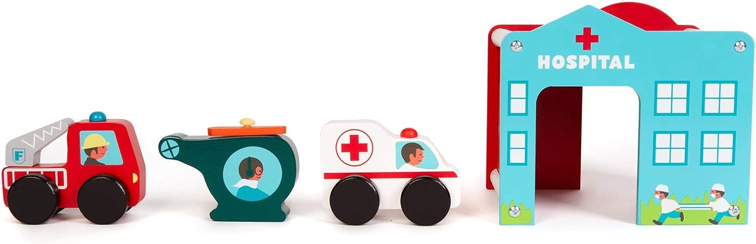 Set da gioco in legno con centro di soccorso di emergenza: questo set da gioco boppi in legno contiene tutto il necessario per rispondere a un'emergenza. Edificio del centro di salvataggio: il set viene fornito con un ospedale/stazione dei pompieri/garage giocattolo in legno/stazione di servizio con tetto a eliporto. 3 VEICOLI PER IL SALVATAGGIO D'EMERGENZA: sono inclusi 3 veicoli di risposta alle emergenze: un elicottero con pale rotanti in legno, un'ambulanza e un autopompa antincendio con scala rotante. Dimensioni: la costruzione di soccorso di emergenza in legno giocattoli dimensioni: 17 cm x 15 cm x 14 cm. Dimensioni del veicolo: 9,5 cm x 7 cm x 2 cm. boppi Giocattoli in legno: la gamma di giocattoli in legno boppi per bambini di 3 anni offre un divertimento naturale e conveniente per i più piccoli. La gamma boppi di giocattoli in legno: set di treni ferroviari, cucina giocattolo in legno, case delle bambole, scatole di attività, camminatori di attività, strumenti musicali e garage per auto da gioco.