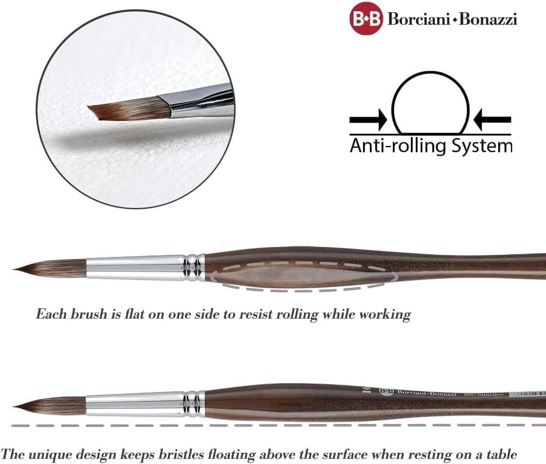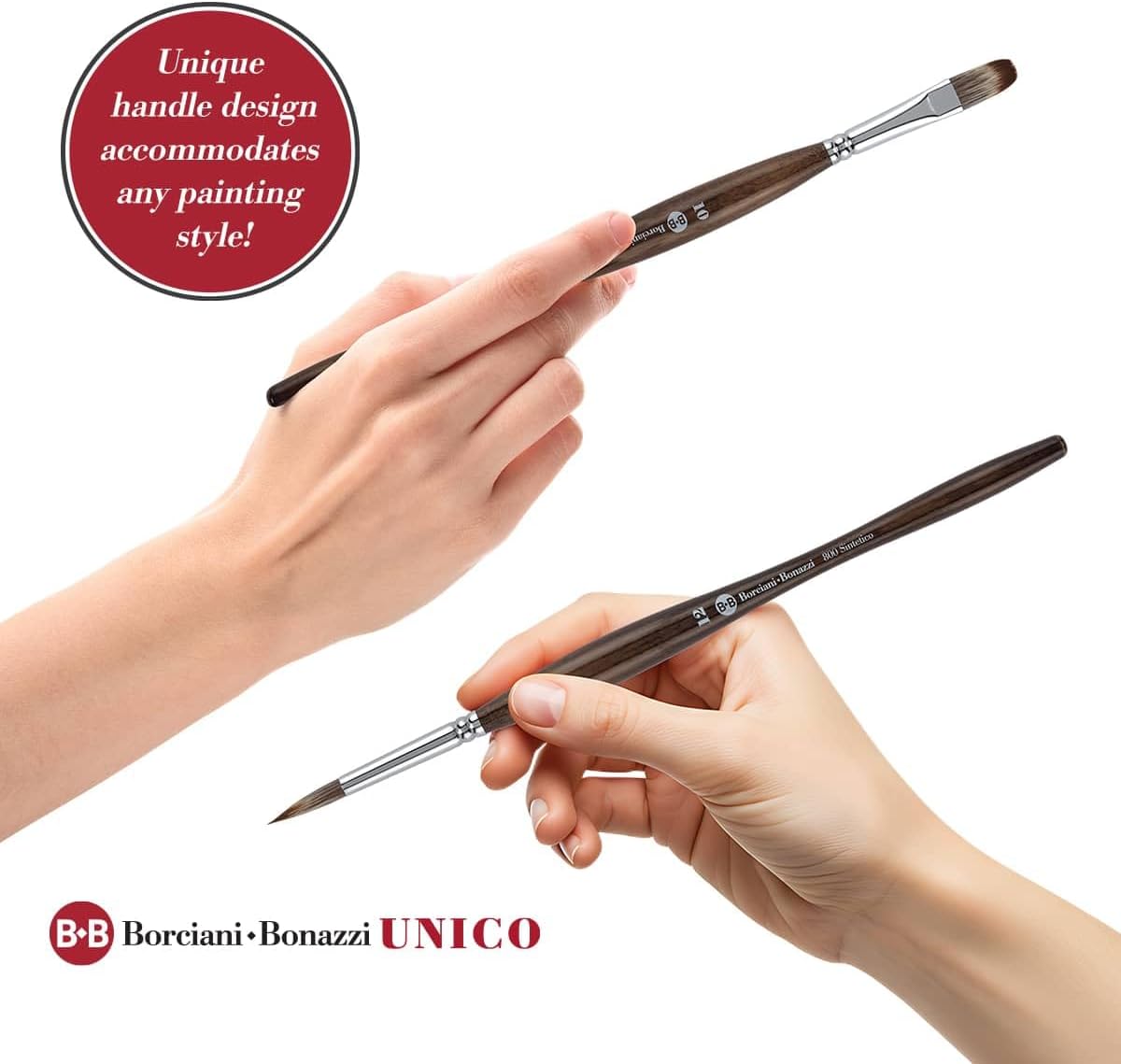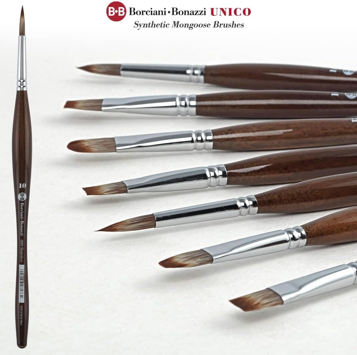 MODELLO: Pennello tondo in filo sintetico imitazione mangusta numero 10, con ghiera in ottone nichelato per acquerello. Prodotto cruelty-free realizzato con filato sintetico. CARATTERISTICHE: Il filato sintetico imitazione mangusta è caratterizzato da un'estrema capacità di assorbimento e ritenzione dell'acqua (capacità igroscopica). L'estrema morbidezza della fibra non lascia assolutamente traccia o segno nel materiale colorato. Caratterizzato da una fibra sintetica molto morbida, imitazione del naturale, utilizzata su tecniche sottili e molto diluite, come acquerello, acrilico diluito o olio in veli leggerissimi. UTILIZZO: Ideale sia per creare campiture piene, piatte e molto profonde, sia per enfatizzare tutti i dettagli di cui necessita il lavoro con i punti più fini. Precisione della punta anche nelle dimensioni più piccole. Gli artisti ne apprezzano la capacità di trattenere l'acqua e la precisione della punta, che rimane tale nel tempo. Ideale per acquerello su carta, per disegnare sfondi, per velature e altre tecniche molto diluite. SENZA CRUELTY: i nostri pennelli sono realizzati con filato sintetico di alta qualità per proteggere la vita degli animali. BORCIANI E BONAZZI: Dal 1951 curiamo la cura e la selezione delle materie prime di alta qualità per la produzione dei nostri pennelli.