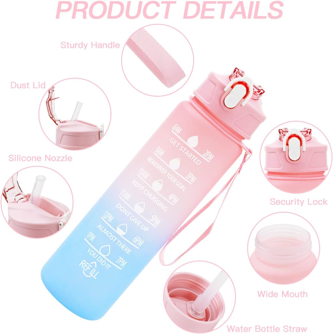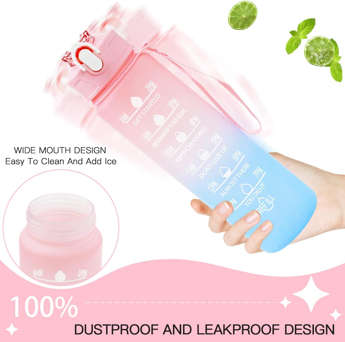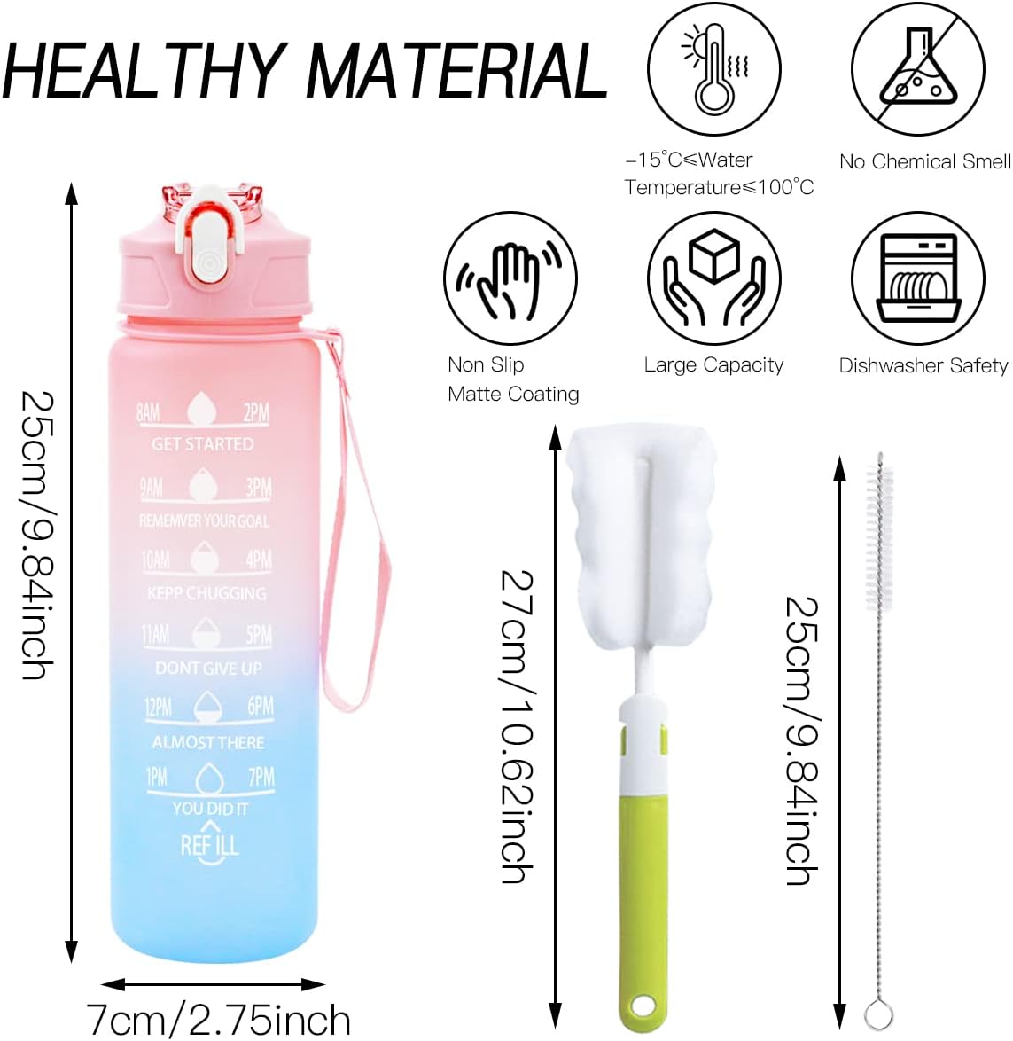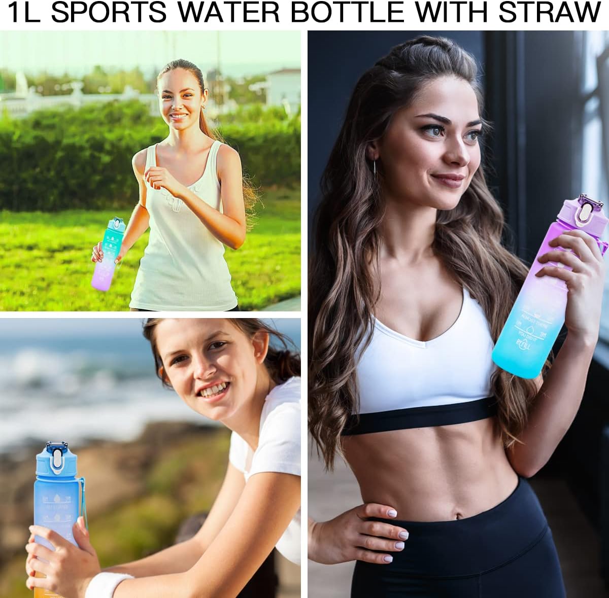 ALTA QUALITÀ E MATERIALE SICURO: La nostra bottiglia d'acqua da 750 ml è realizzata in materiale Tritan di alta qualità e priva di sostanze chimiche nocive come BPA e ftalati per garantire la tua salute e sicurezza. BOTTIGLIA D'ACQUA CON INDICATORI DEL TEMPO: L'idratazione è un semplice trucco che ti aiuterà a rimanere in salute. Questa bottiglia d'acqua con citazione ispiratrice e timestamp è sempre un promemoria per consumare la giusta quantità di acqua per rimanere idratati durante il giorno. DESIGN A PROVA DI PERDITE E ANTIURTO: Borraccia con cannuccia 100% antipolvere e a prova di perdite, robusta e antiurto. Apri con un clic, comodamente e rapidamente. Il blocco di sicurezza sul tappo della bottiglia può bloccare la bottiglia per evitare l'apertura accidentale. LEGGERO E PORTATILE: Questa borraccia sportiva è dotata di un cinturino da polso resistente, leggero e compatto, adatto per zaini, auto e la maggior parte dei portabicchieri, che è la prima scelta per lo sport e l'uso quotidiano. LAVABILE IN LAVASTOVIGLIE: La nostra bottiglia d'acqua è realizzata con materiali resistenti al calore, offre una spazzola per cannuccia e una spazzola per bottiglie extra per aiutarti a pulire rapidamente la bottiglia d'acqua o essere lavabile in lavastoviglie.