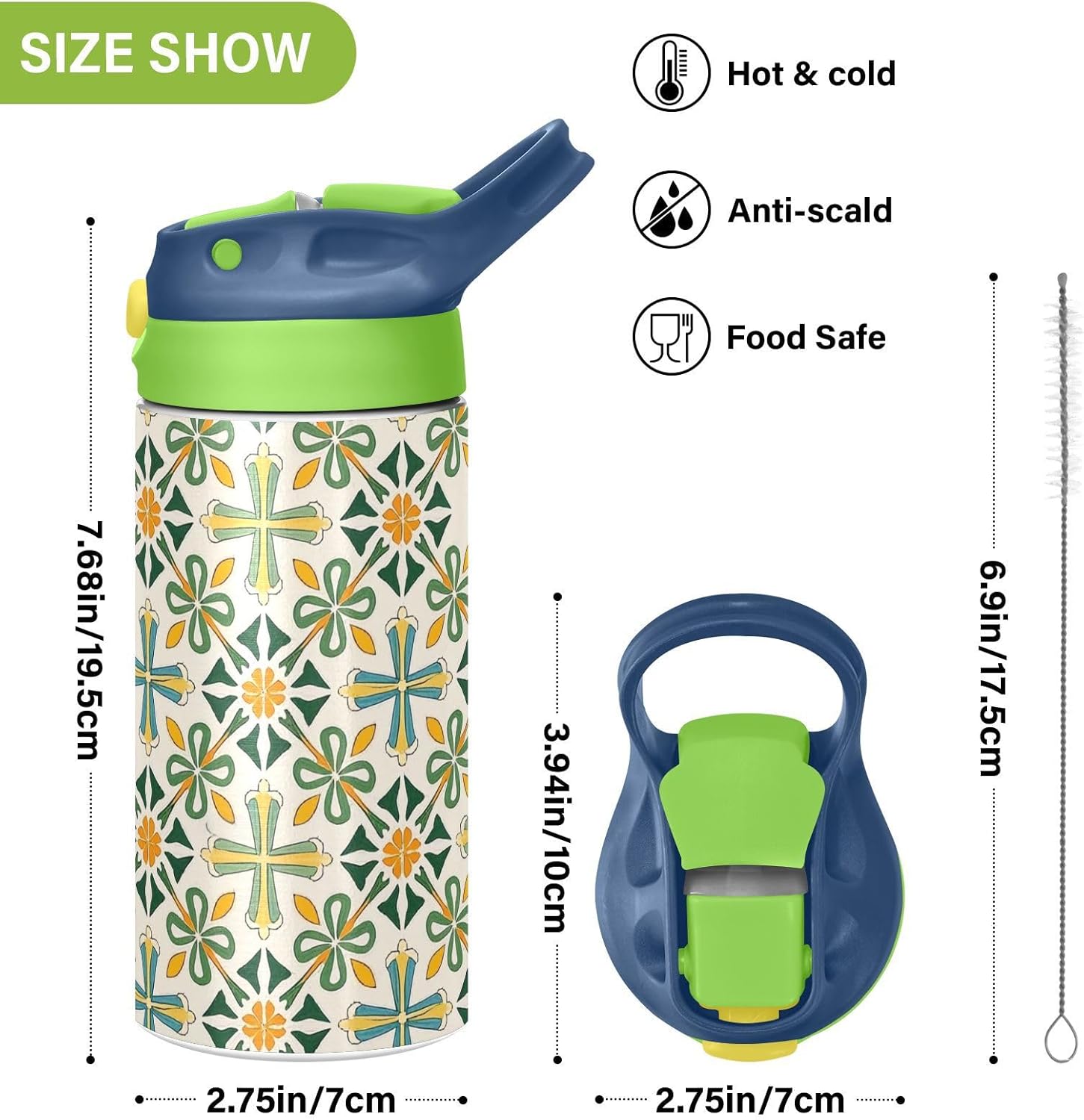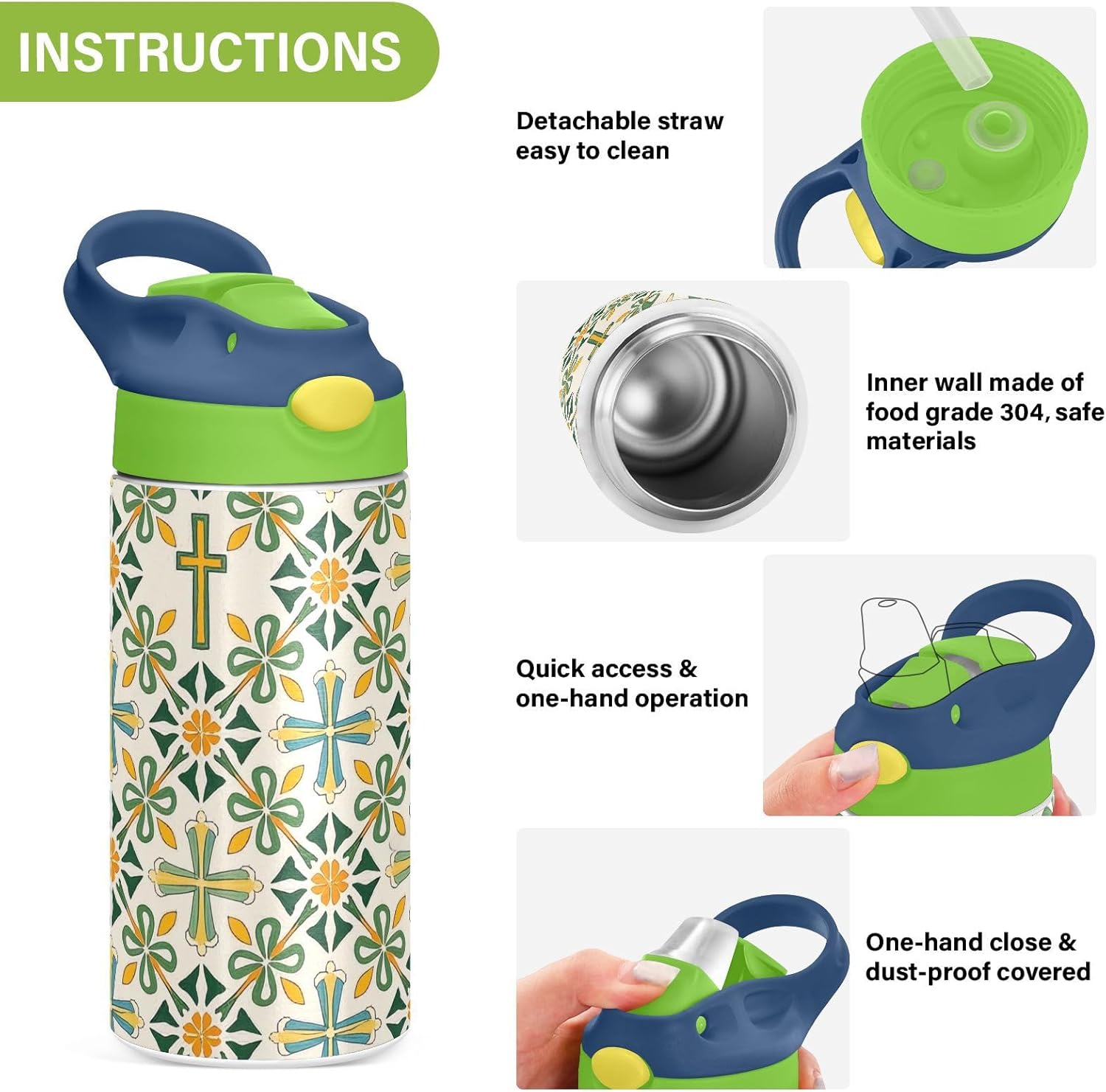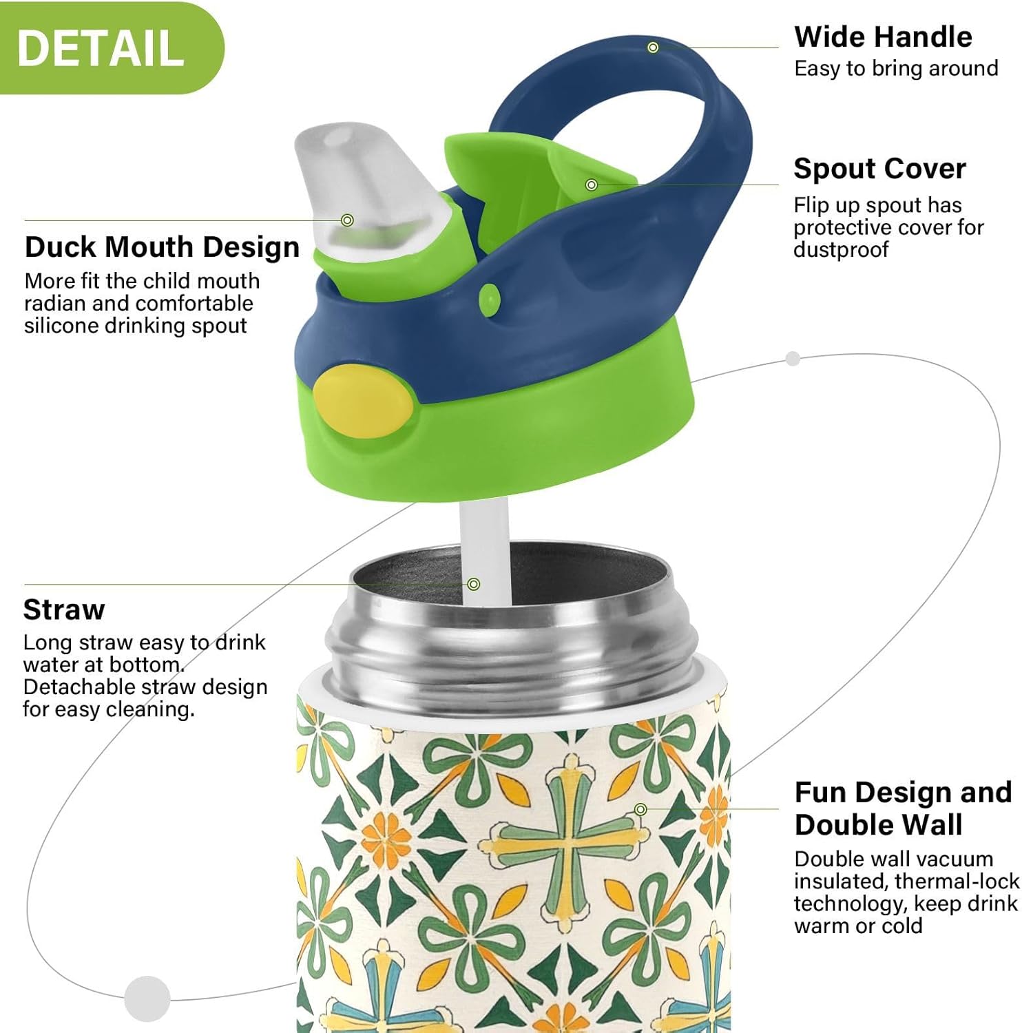 Materiali di qualità: borraccia sportiva (19,5 x 7 cm) utilizza tritan e silicone alimentare. Ideale per pratica sportiva o picnic. Non adatta a bambini di età inferiore ai 3 anni Design portatile: l'ampio manico è facile da impugnare per i bambini e il gancio del coperchio consente di attaccare le bottiglie d'acqua sportive agli zaini. Niente più bottiglie perse durante le gite sul campo o le attività dopo la scuola. Funzionamento con una sola mano: il becco d'anatra si adatta alla bocca dei bambini, con una copertura antipolvere. L'interruttore a pulsante della bottiglia d'acqua è semplice da usare con una sola mano, in modo che i bambini possano bere mentre tengono una palla o un notebook. Blocco di sicurezza: il blocco del pulsante impedisce lo scoppio accidentale del becco d'anatra. Previene le perdite quando viene gettato nello zaino, mantenendo asciutti snack e compiti. Facile da pulire: tutte le parti della borraccia possono essere smontate per evitare l'accumulo di sporco. Pulire con detergente neutro e acqua calda.