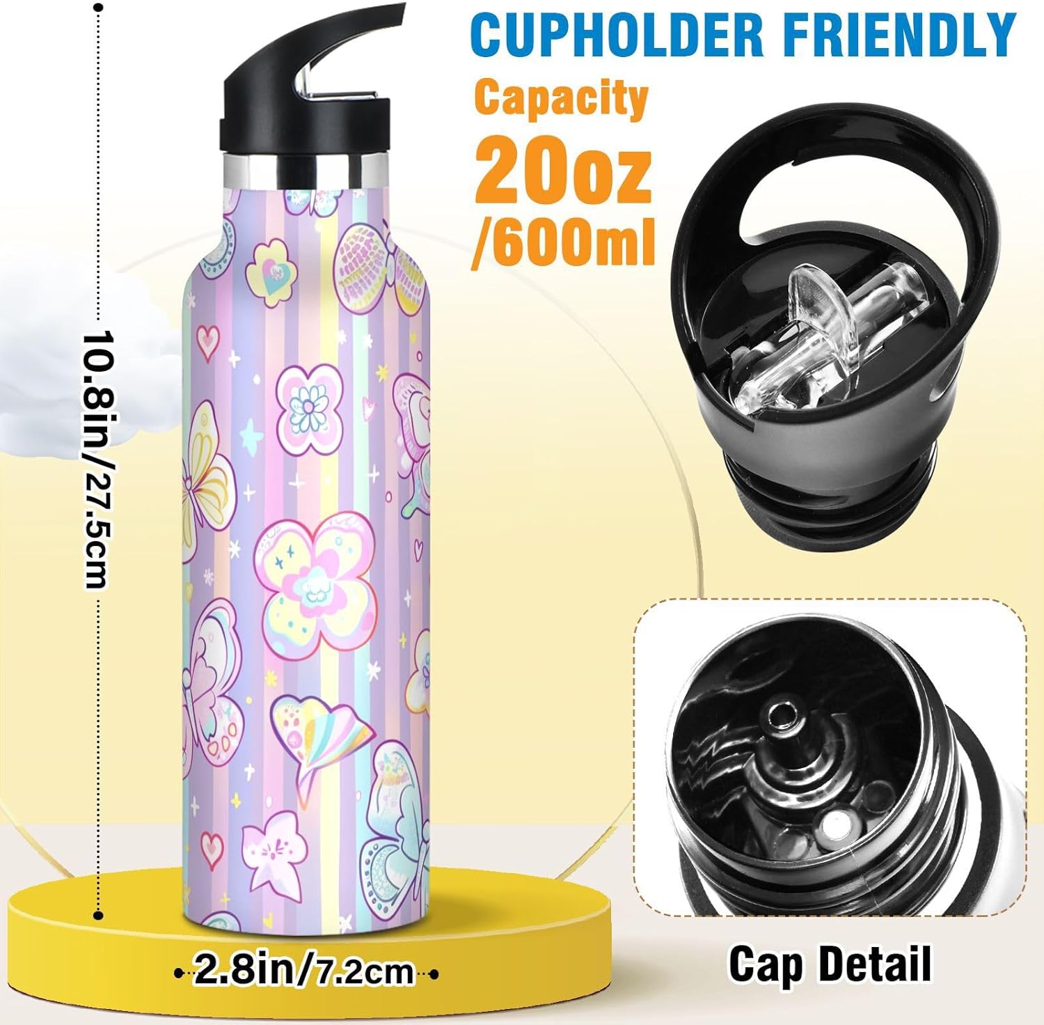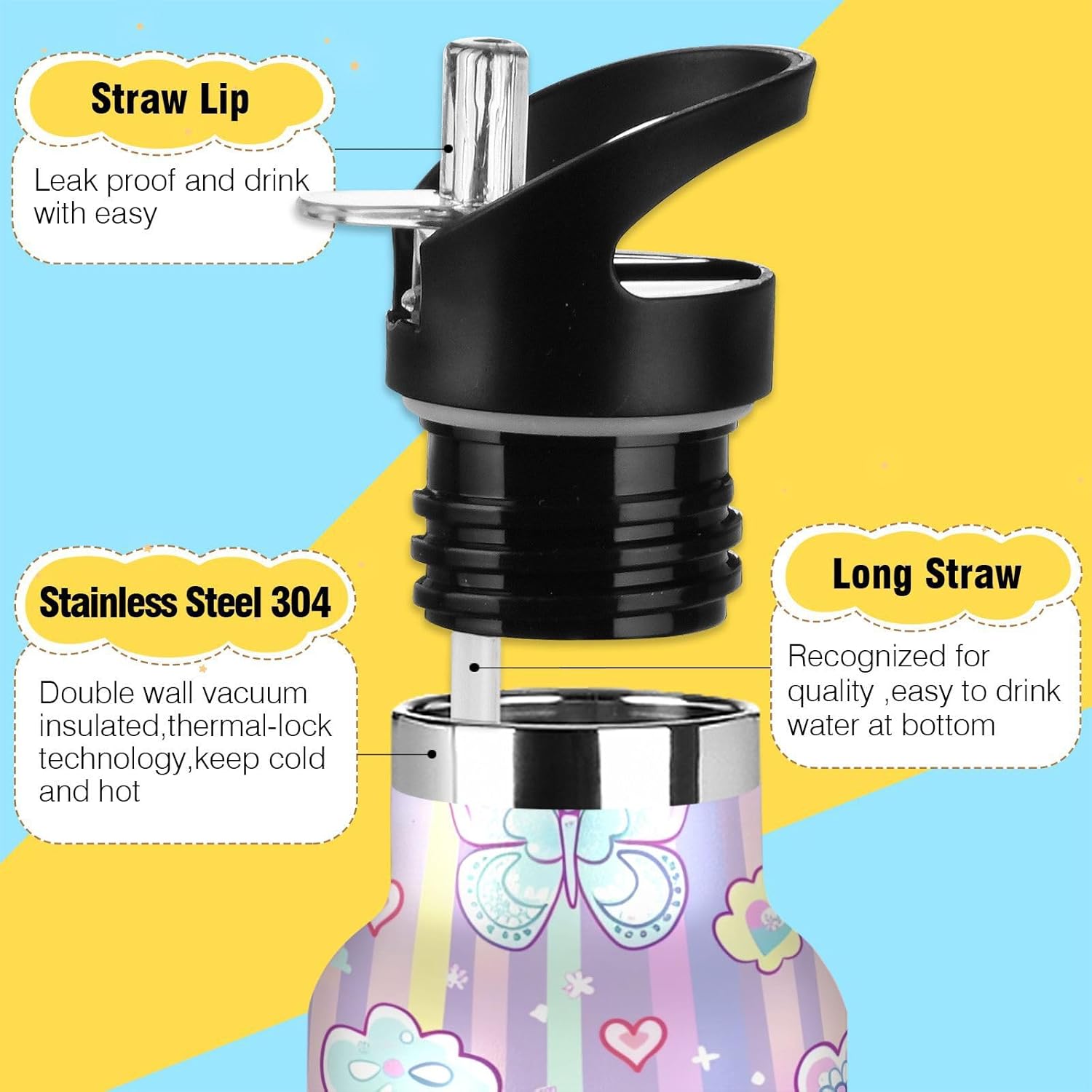 Resistenza isolata sottovuoto: realizzata con acciaio inossidabile a doppio strato e tecnologia sigillata sottovuoto, questa borraccia da palestra mantiene le bevande ghiacciate per 24 ore o calde al vapore per 12 ore, perfetta per maratone, escursioni o giornate impegnative in ufficio. Dite addio all'acqua tiepida durante gli allenamenti! Coperchio 2 in 1: con una cannuccia pieghevole, questa borraccia garantisce un facile sorseggio. È perfetto per gli allenamenti in palestra, dove puoi bere rapidamente. Design del coperchio: l'esclusiva valvola di rilascio dell'aria consente un flusso regolare durante le corse intense, senza scomode inclinazioni o rischi di soffocamento. Ideale per le pause di idratazione durante le lezioni Grande capacità: con una grande capacità di 590 ml, questa borraccia da palestra è perfetta per rimanere idratati durante lunghi allenamenti o attività all'aperto. Dimensione perfetta per viaggiare: questa borraccia in metallo per bambini si adatta alla maggior parte dei portabicchieri e alla tasca laterale di uno zaino. Comodo da portare in giro con un manico ergonomico a bordo largo. È ideale da portare a scuola, palestra, campeggio o viaggi su strada.