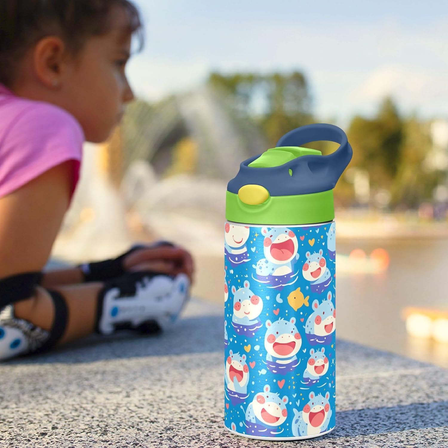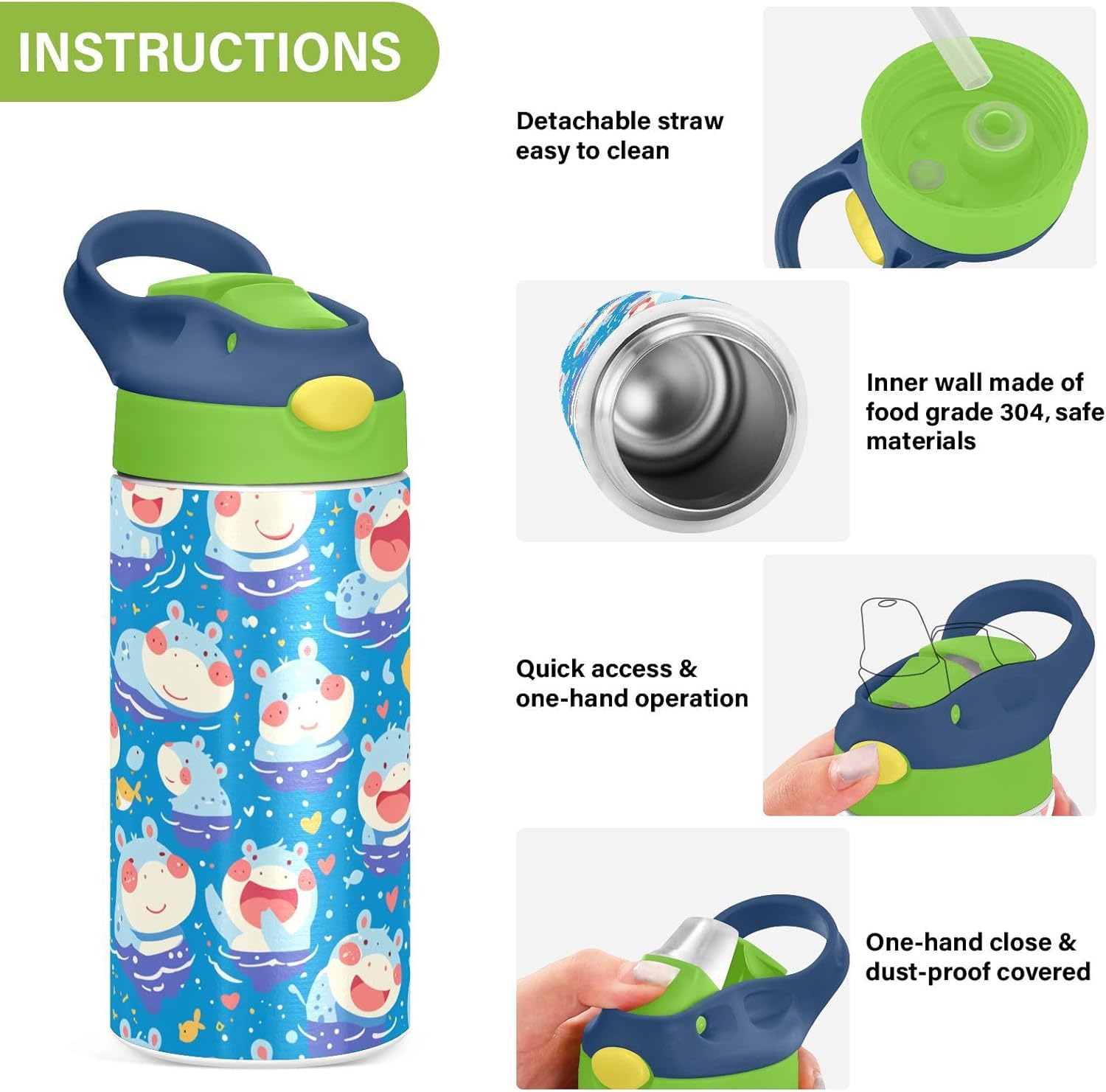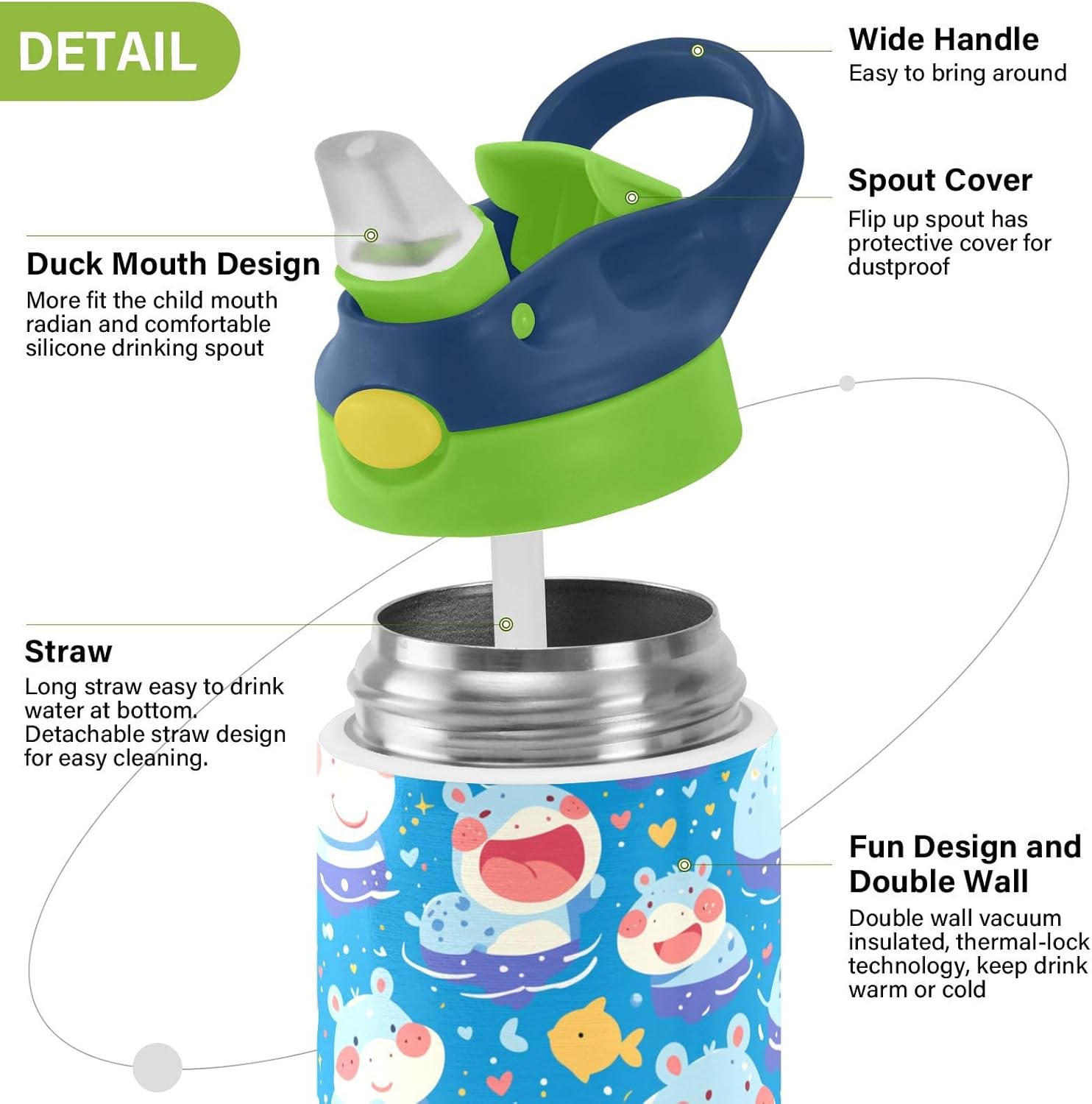 Materiale: questa borraccia per bambini da 19,5 x 7 cm con capacità di 350 ml è realizzata in tritan e silicone alimentare. Perfetto per le giornate scolastiche o per lo sport, è privo di elementi nocivi, affrontando le preoccupazioni dei genitori sui materiali non sicuri. Non adatto a bambini di età inferiore ai 3 anni! Design portatile: l'ampio manico è facile da impugnare per i bambini e il gancio del coperchio consente di attaccare le bottiglie d'acqua sportive agli zaini. Niente più bottiglie perse durante le gite sul campo o le attività dopo la scuola. Uso senza problemi con una sola mano: il design a becco d'anatra si adatta alle bocche dei bambini, con una copertura antipolvere. L'interruttore a pulsante delle borracce sportive è facile da usare con una sola mano, anche quando giocano o corrono. Blocco di sicurezza: il blocco del pulsante impedisce lo scoppio accidentale del becco d'anatra. Previene le perdite quando viene gettato nello zaino, mantenendo asciutti snack e compiti. Pulizia semplice: le parti completamente rimovibili evitano l'accumulo di sporco. Pulire con detergente neutro e acqua calda: facile per i genitori mantenere pulita la borraccia per bambini per l'uso quotidiano.