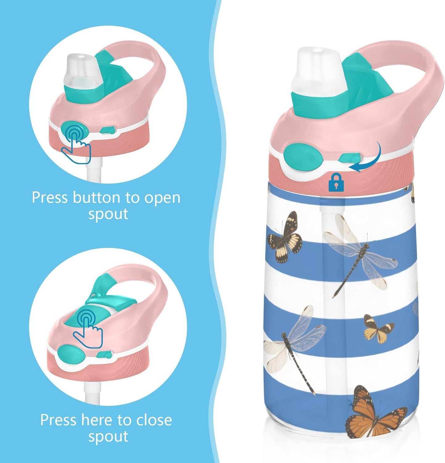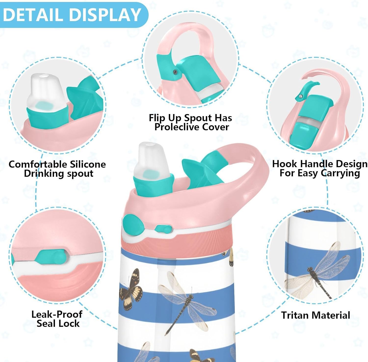 Materiali di qualità: la borraccia (16 x 7,5 cm) utilizza tritan e silicone alimentare. Ideale per pratica sportiva o picnic. Non adatta a bambini di età inferiore ai 3 anni Design portatile: l'ampio manico è facile da impugnare per i bambini e il gancio del coperchio consente di attaccare la bottiglia d'acqua ai bambini. Niente più bottiglie perse durante le gite sul campo o le attività dopo la scuola. Uso senza problemi con una sola mano: il design a becco d'anatra si adatta alle bocche dei bambini, con una copertura antipolvere. L'interruttore a pulsante della borraccia sportiva è facile da usare con una sola mano, anche quando giocano o corrono. Blocco per evitare fuoriuscite: il pulsante di blocco delle bottiglie d'acqua sportive impedisce al becco d'anatra di fuoriuscire per errore. Niente più fuoriuscite negli zaini, mantenendo il pranzo e i libri asciutti. Facile da pulire: tutte le parti della borraccia per bambini possono essere smontate per evitare l'accumulo di sporco. Pulire con detergente neutro e acqua calda.