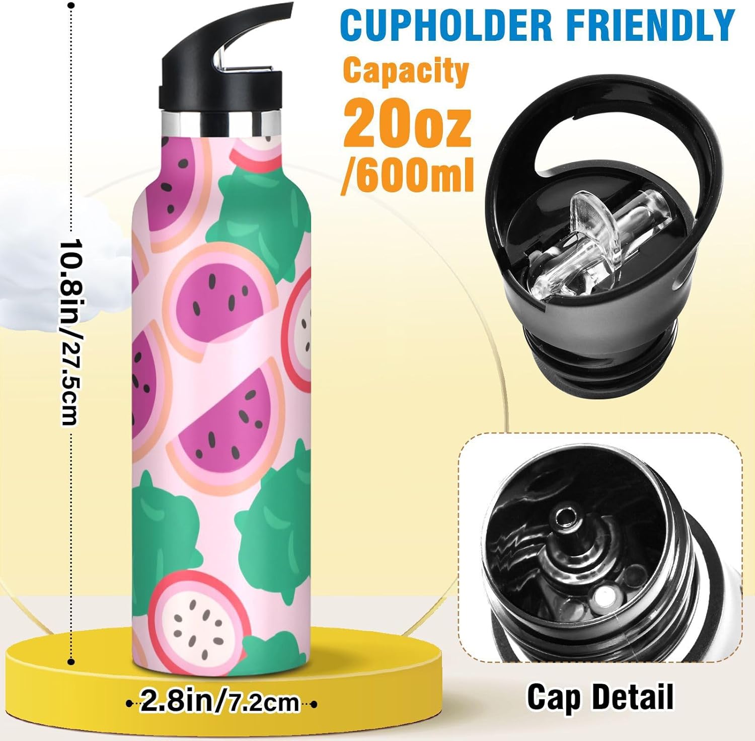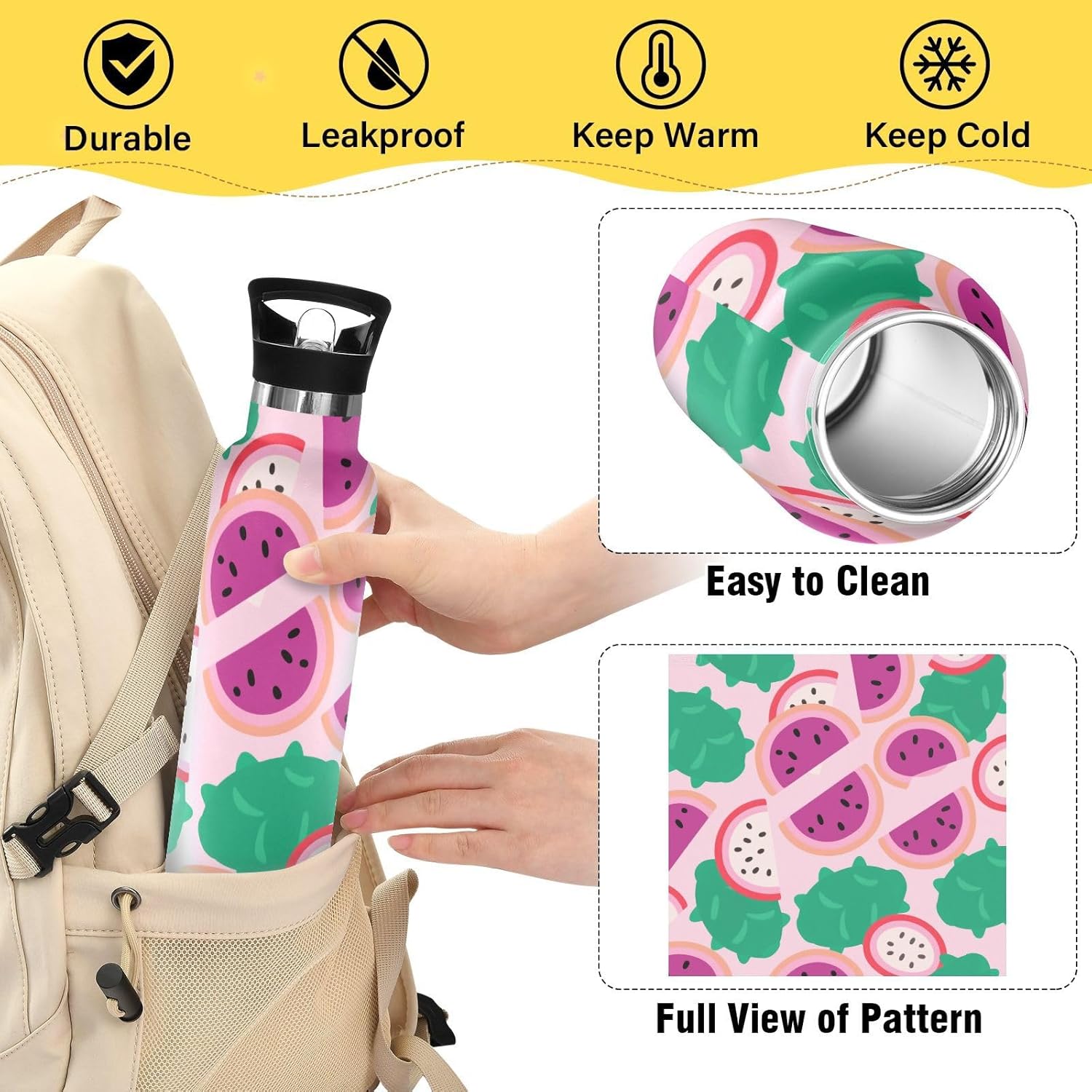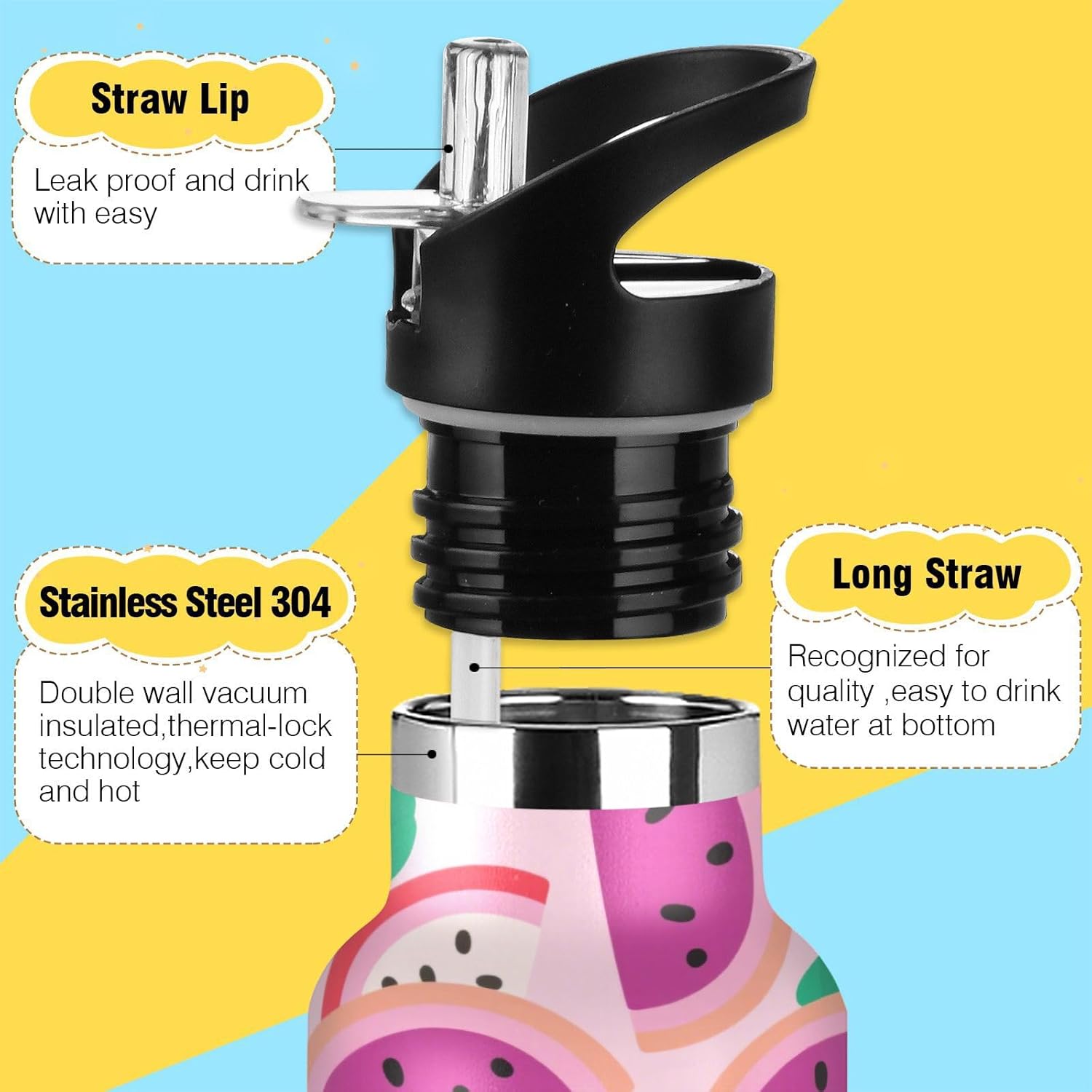 Isolamento premium: questa borraccia riutilizzabile presenta una struttura sottovuoto a doppia parete. Lo strato esterno in acciaio inox per uso alimentare e il rivestimento interno con uno strato termoisolante e blocco sottovuoto offrono una grande ritenzione di calore e freddo. Dite addio alle bevande tiepide! Coperchio 2 in 1: i due coperchi possono essere cambiati in qualsiasi momento: la cannuccia per sorseggiare facilmente o un coperchio girevole per una rapida idratazione. A tenuta stagna Avventura Ready: meccanismo Twist-lock e guarnizioni in silicone rinforzato impediscono fuoriuscite anche capovolte negli zaini. Affidati per gite in kayak o metropolitane affollate. Manico ergonomico per il trasporto: il passante extra largo si adatta a guanti o anelli ingombranti, rendendolo facile da afferrare durante le corse di alimentari o i sentieri di montagna. Si adatta perfettamente ai portabicchieri dell'auto. Dimensioni perfette per viaggiare: questa borraccia per bambini si adatta alla maggior parte dei portabicchieri e alla tasca laterale di uno zaino. Comodo da portare in giro con un manico ergonomico a bordo largo. È ideale da portare a scuola, palestra, campeggio o viaggi su strada.
