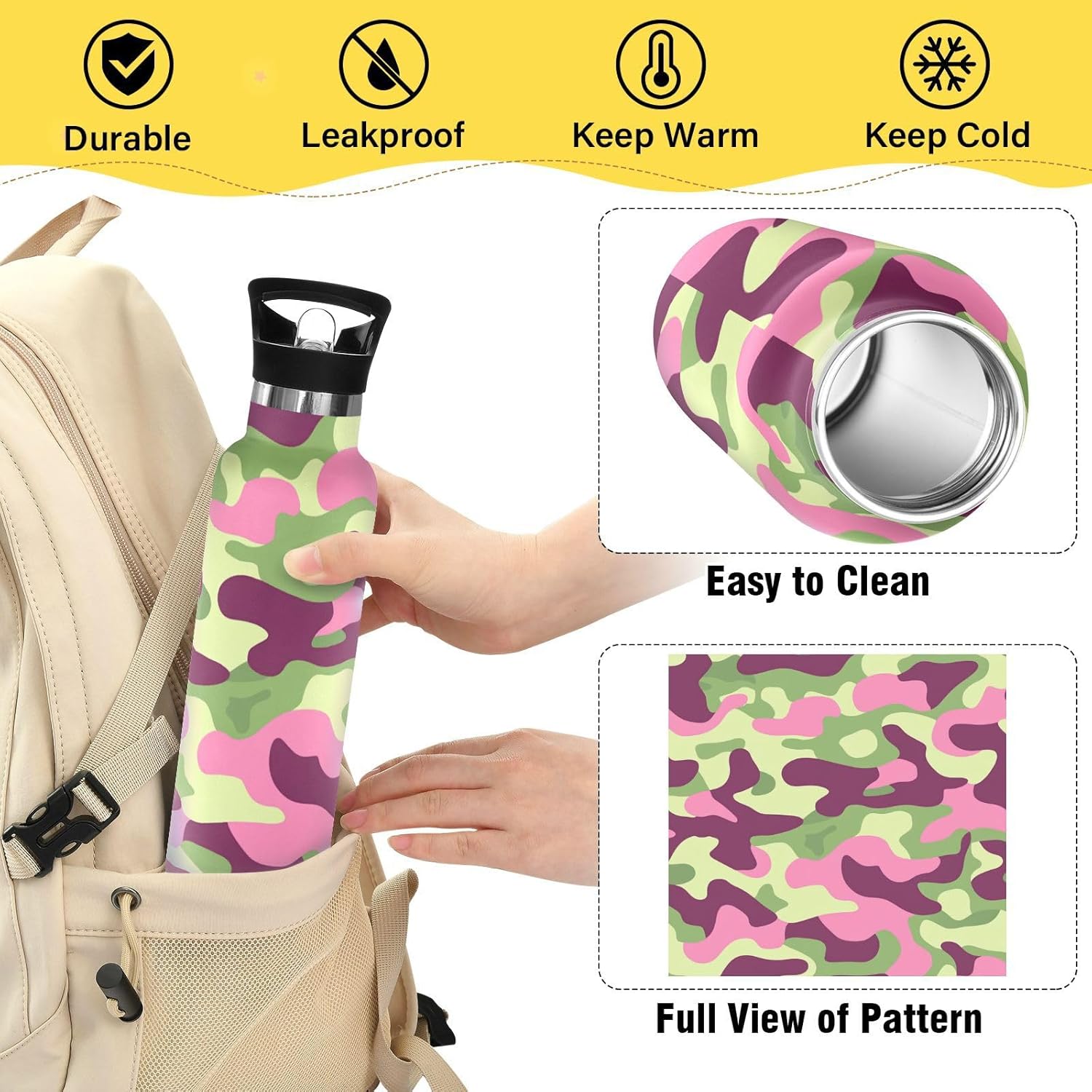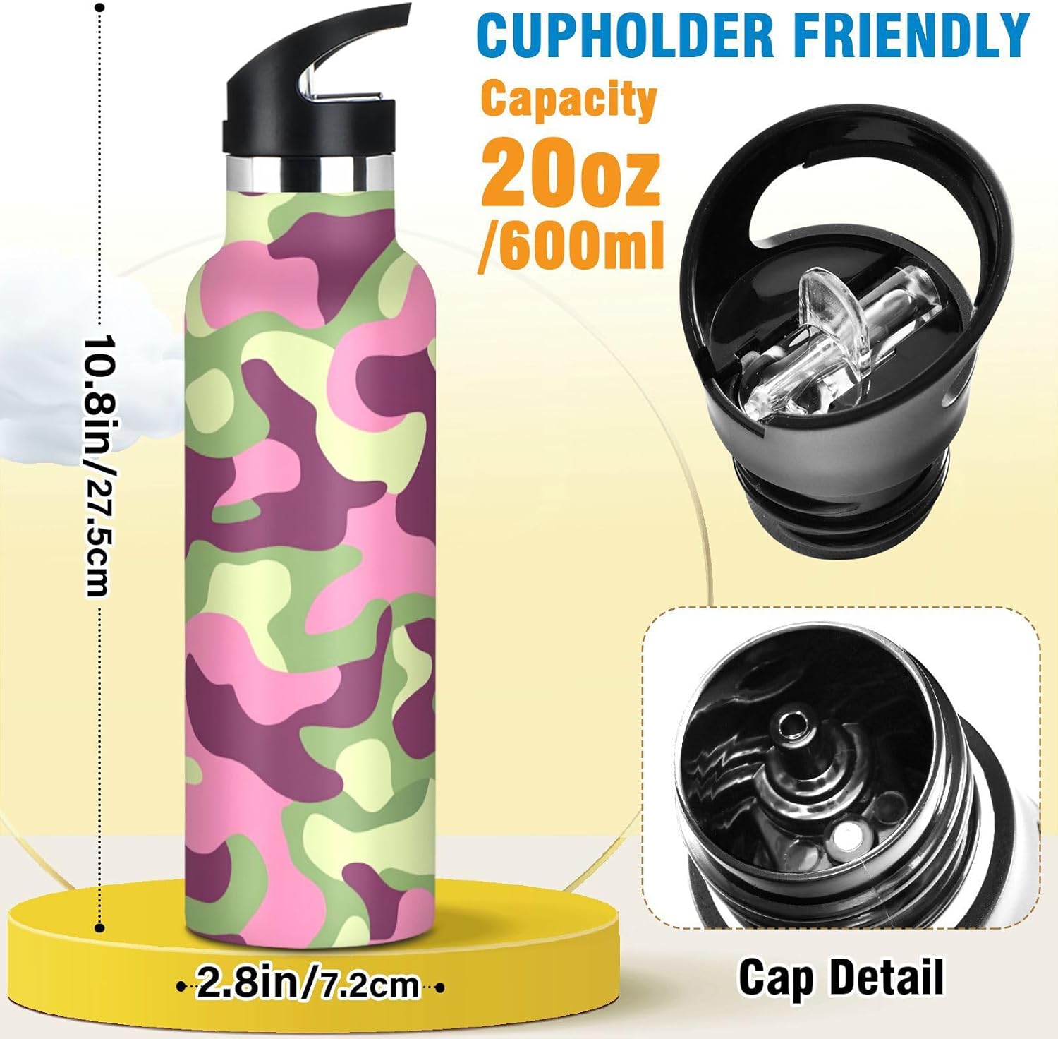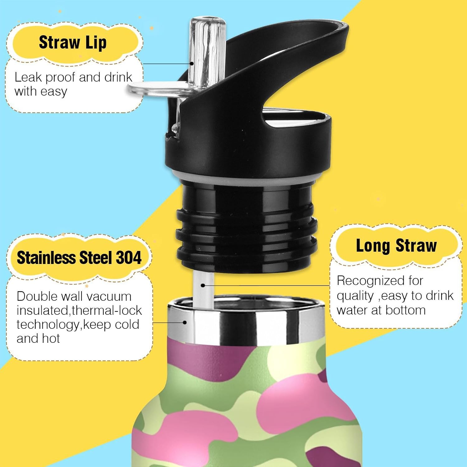 Controllo della temperatura per tutto il giorno: l'isolamento a doppio strato con rivestimento termoriflettente mantiene la temperatura delle bevande durante le pratiche di calcio o gli spostamenti invernali. Non scendere mai a compromessi sulla freschezz Coperchio 2 in 1: i due coperchi possono essere cambiati in qualsiasi momento: la cannuccia per sorseggiare facilmente o un coperchio girevole per una rapida idratazione. Design del coperchio: l'esclusiva valvola di rilascio dell'aria consente un flusso regolare durante le corse intense, senza scomode inclinazioni o rischi di soffocamento. Ideale per le pause di idratazione durante le lezioni Manico ergonomico per il trasporto: il passante extra largo si adatta a guanti o anelli ingombranti, rendendolo facile da afferrare durante le corse di alimentari o i sentieri di montagna. Si adatta perfettamente ai portabicchieri dell'auto. Dimensioni perfette per viaggiare: questa borraccia si adatta alla maggior parte dei portabicchieri e alla tasca laterale di uno zaino. Comodo da portare in giro con un manico ergonomico a bordo largo. È ideale da portare a scuola, palestra, campeggio o viaggi su strada.