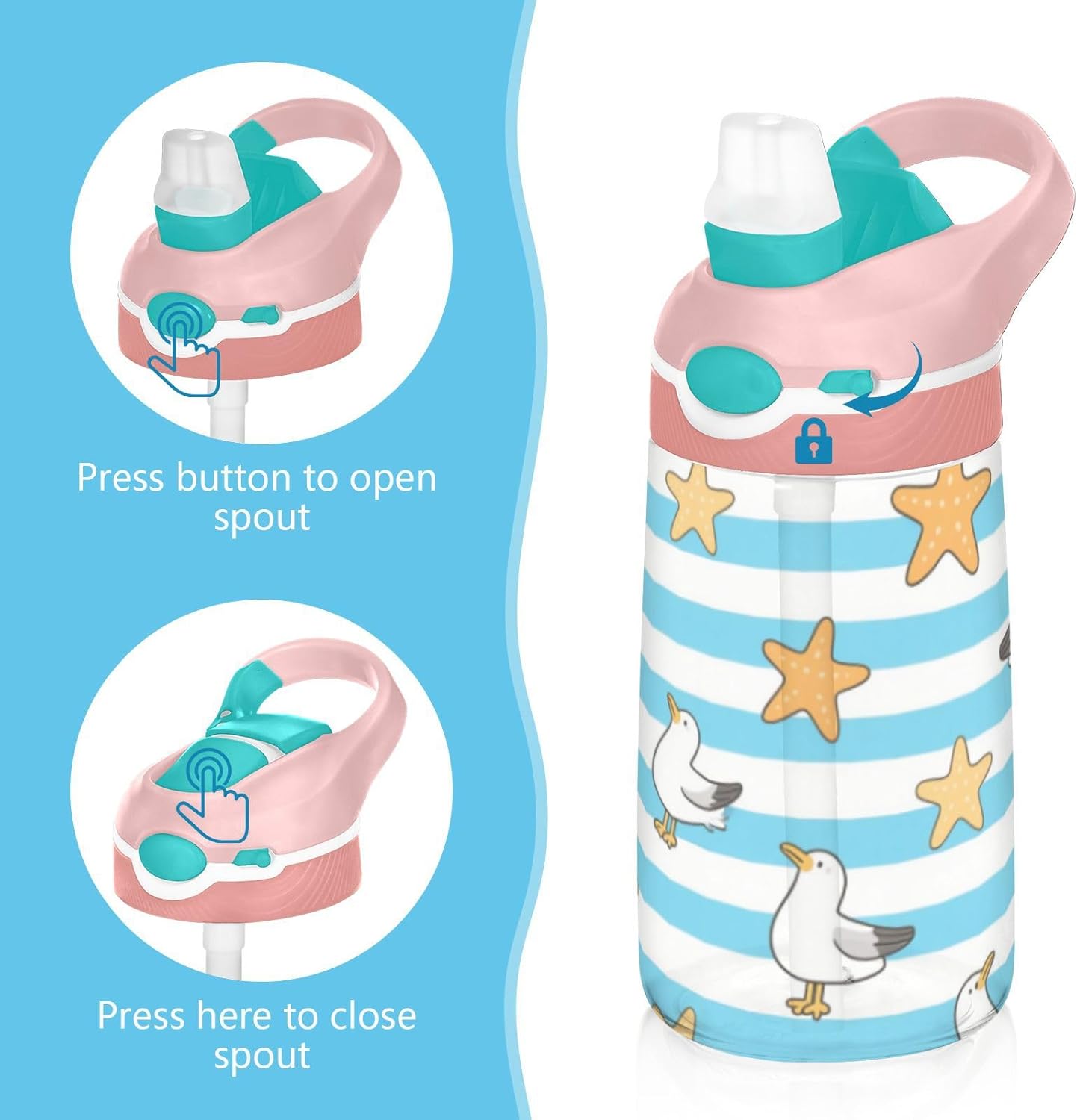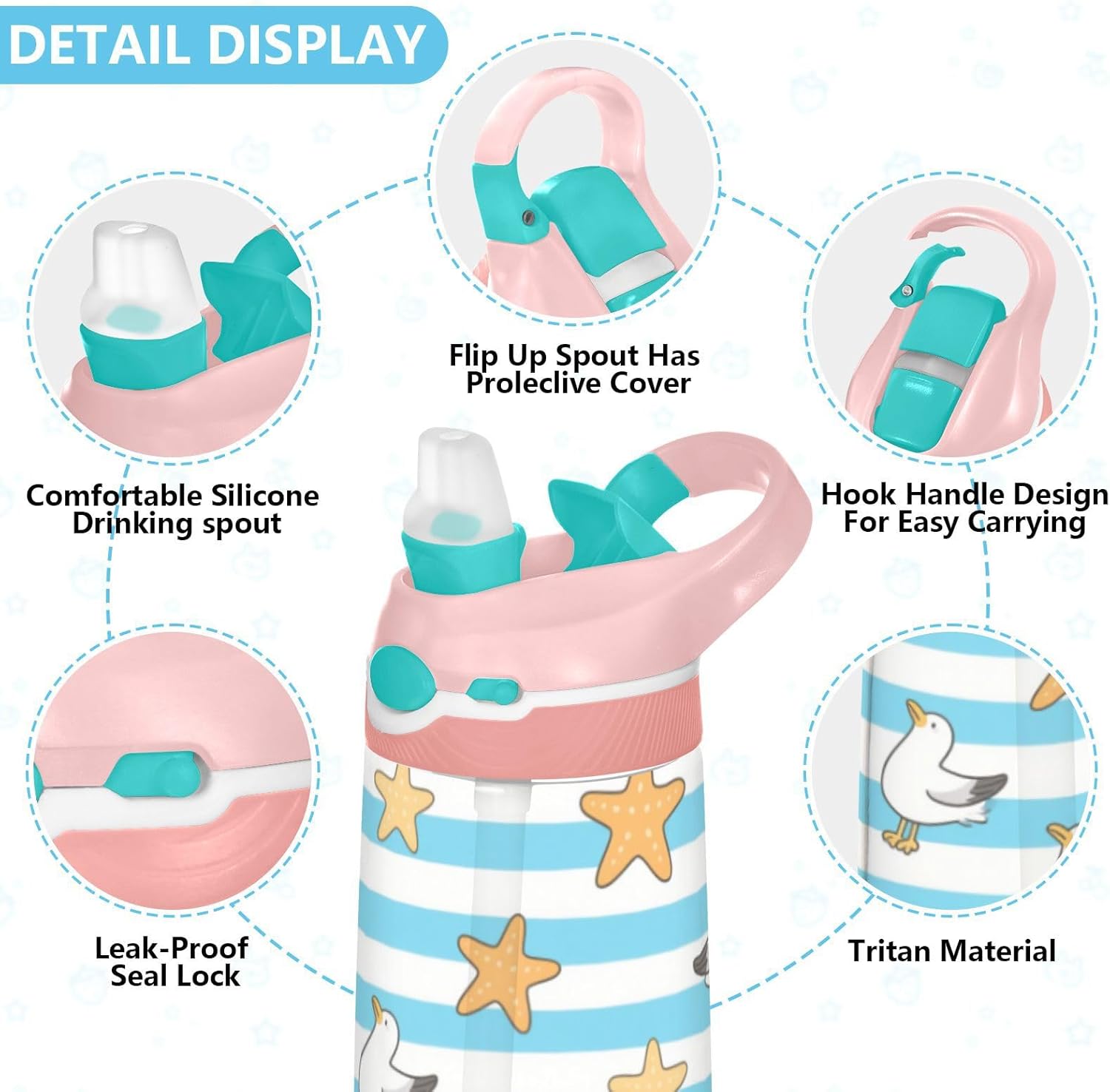 Materiale di sicurezza: il corpo in Tritan e il beccuccio in silicone alimentare garantiscono durata e sicurezza. Contiene 480 ml di acqua, perfetto per l'idratazione quotidiana. Non adatto a bambini di età inferiore ai 3 anni Comoda da trasportare: con un ampio manico per mani piccole e un gancio sul coperchio, la borraccia può essere appesa agli zaini. I bambini non faranno fatica a trasportarla durante le gite sul campo o le attività dopo la scuola. Funzionamento amichevole: il becco d'anatra si adatta bene, con una copertura antipolvere. L'interruttore a pulsante di Water Bottle Kids consente l'uso con una sola mano, in modo che i bambini possano idratarsi senza mettere giù i loro giocattoli o attrezzi sportivi. Previene le perdite: il blocco a pulsante blocca l'apertura accidentale del becco d'anatra. Mantiene le bevande all'interno, proteggendo zaini e vestiti durante i pendolari o il gioco. Pulizia semplice: le parti completamente rimovibili evitano l'accumulo di sporco. Pulire con detergente neutro e acqua calda: facile per i genitori mantenere pulita la borraccia per bambini per l'uso quotidiano.
