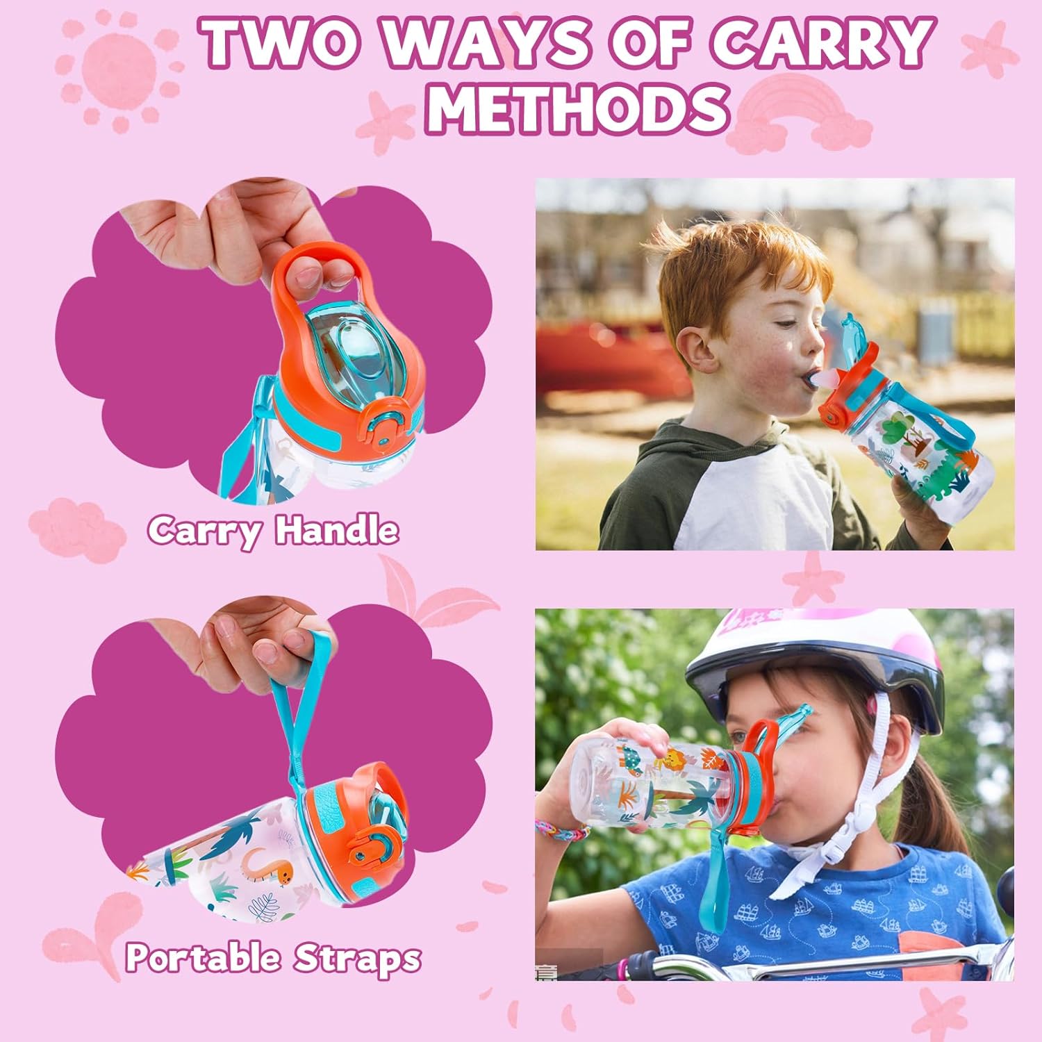 [Senza BPA e materiale premium] Realizzata con cura, questa bottiglia d'acqua sportiva da 600 ml è il compagno ideale per i bambini. Realizzato in materiale Tritan di alta qualità per uso alimentare, è completamente privo di BPA, garantendo sicurezza e tranquillità. Il design ispessito della bottiglia aumenta la durata e fornisce una protezione robusta contro le cadute accidentali. Dotato di un beccuccio in silicone più spesso e resistente alla masticazione, è progettato per resistere alle abitudini giocose dei bambini mantenendo la sua funzionalità a lungo termine. [100% a prova di perdite] Progettata con precisione, questa bottiglia d'acqua è dotata di un tappo a prova di perdite integrato nel coperchio, garantendo un'esperienza a prova di perdite al 100%. La sua struttura stabile e antiurto garantisce che possa affrontare le avventure quotidiane. La maniglia ergonomica e la pratica tracolla rendono il trasporto facile e comodo, perfetto per uno stile di vita attivo. Inoltre, il blocco di sicurezza integrato impedisce l'apertura accidentale del coperchio, garantendo ulteriore sicurezza. [Funzionamento con una sola mano] Per un utilizzo facile e comodo, il coperchio è stato progettato in modo tale da poter essere facilmente aperto con una sola mano premendo il pulsante, ideale per un rapido rinfresco in movimento. La tettarella in silicone morbida e resistente garantisce un'esperienza di consumo a prova di perdite. Con una generosa capacità di 600 ml, la bottiglia rimane leggera e facile da trasportare, rendendola una scelta pratica per le giornate frenetiche. [Design giocoso per ragazzi e ragazze] Decorata con design affascinanti e unici, questa bottiglia d'acqua è allo stesso tempo elegante e funzionale. Le stampe vivaci sono progettate per resistere allo sbiadimento anche dopo un uso prolungato, mantenendo la bottiglia attraente come il primo giorno. Il suo design giocoso e accattivante ispirerà l'immaginazione del tuo bambino e lo incoraggerà a rimanere idratato apprezzando la bottiglia come un amato compagno. [Regalo ideale] Con la sua capacità di 600 ml, questa bottiglia d'acqua per bambini è perfetta per mantenere i tuoi piccoli idratati durante le loro avventure quotidiane. Disponibile in sei design vivaci e colorati, è un regalo premuroso e pratico per i bambini, i propri cari o chiunque apprezzi un mix di funzionalità e divertimento. Un regalo che la manterrà idratata, felice ed elegante!