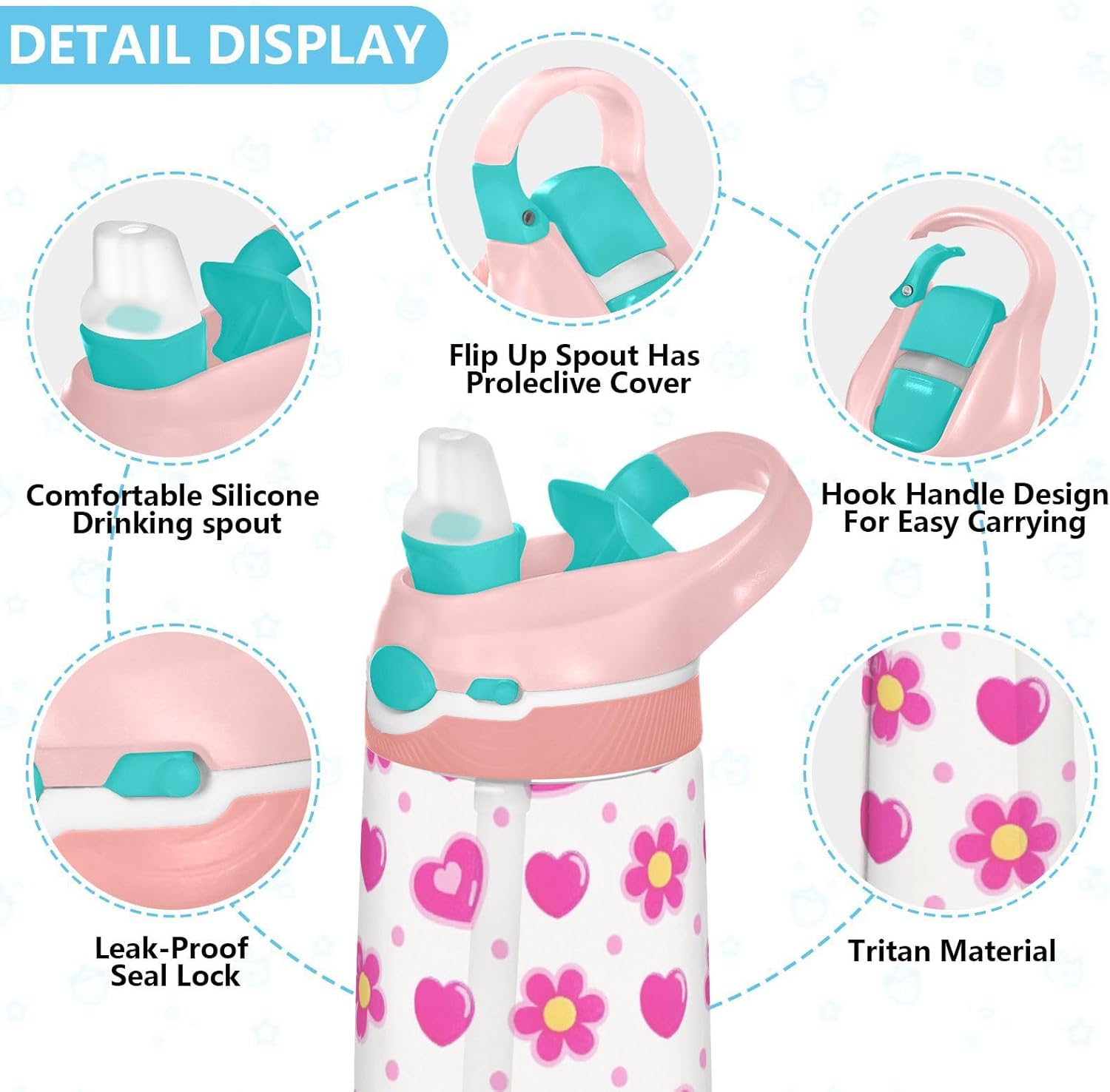 Materiale: questa borraccia sportiva da 16 x 7,5 cm con capacità di 480 ml è realizzata in tritan e silicone alimentare. Perfetto per le giornate scolastiche o per lo sport, è privo di elementi nocivi, affrontando le preoccupazioni dei genitori sui materiali non sicuri. Non adatto a bambini di età inferiore ai 3 anni! Design portatile: l'ampio manico è facile da impugnare per i bambini e il gancio del coperchio consente di attaccare la bottiglia d'acqua agli zaini. Niente più bottiglie perse durante le gite sul campo o le attività dopo la scuola. Funzionamento amichevole: il becco d'anatra si adatta bene, con una copertura antipolvere. L'interruttore a pulsante della borraccia consente l'uso con una sola mano, in modo che i bambini possano idratarsi senza mettere giù i loro giocattoli o attrezzi sportivi. Previene le perdite: il blocco a pulsante blocca l'apertura accidentale del becco d'anatra. Mantiene le bevande all'interno, proteggendo zaini e vestiti durante i pendolari o il gioco. Facile da pulire: tutte le parti della borraccia sportiva sono rimovibili per una pulizia accurata senza sporcare. Usa un detergente neutro e acqua calda: semplice per i genitori mantenere la pulizia per l'uso quotidiano.