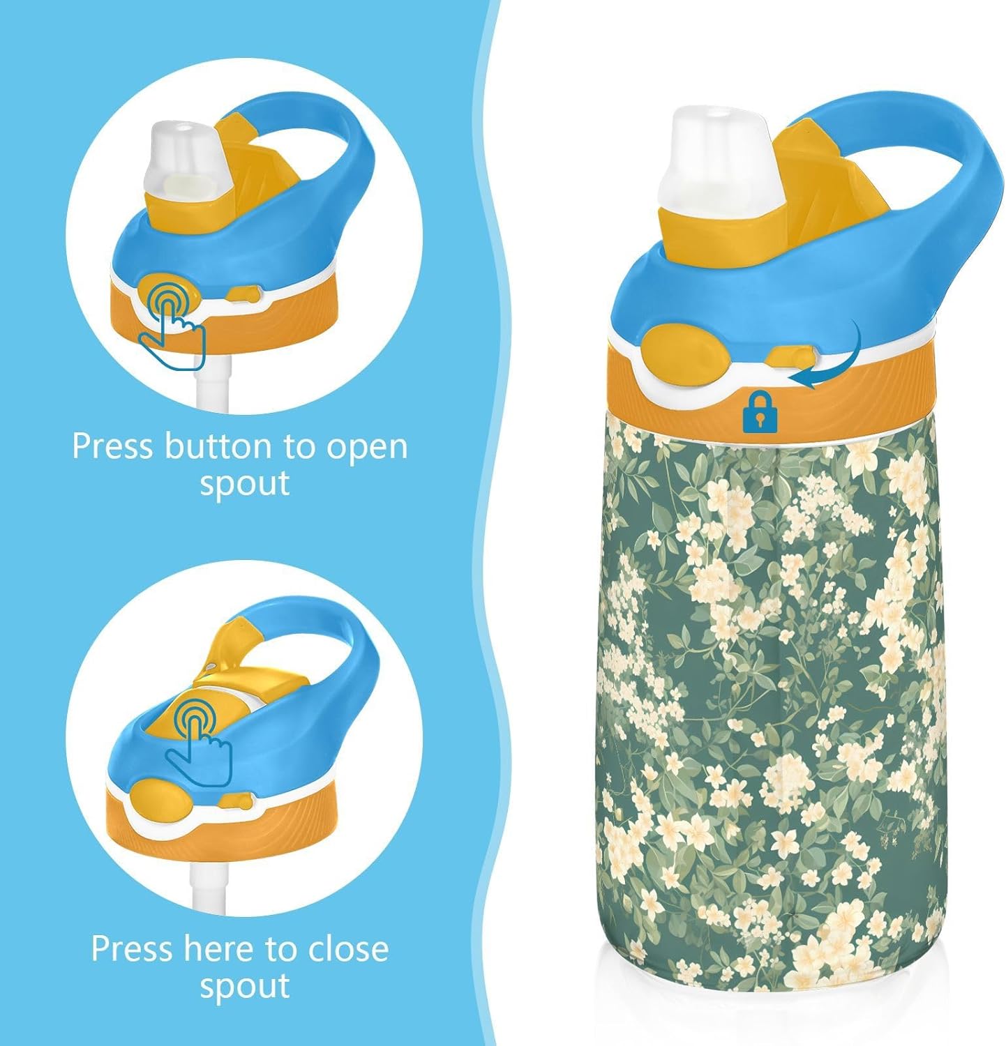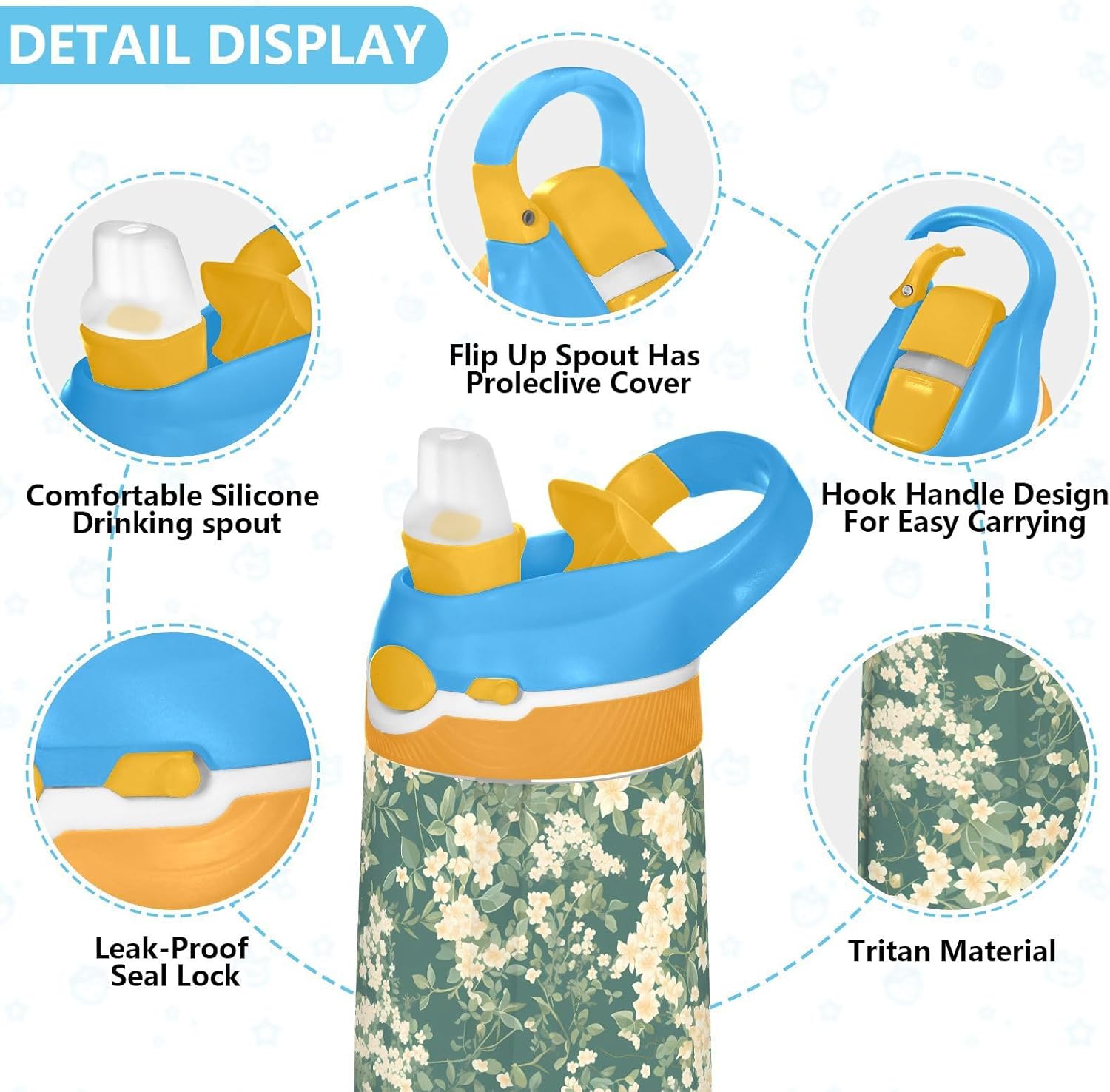 Materiale: questa borraccia sportiva da 16 x 7,5 cm con capacità di 480 ml è realizzata in Tritan e silicone alimentare. Perfetto per le giornate scolastiche o lo sport, è privo di elementi nocivi, affrontando le preoccupazioni dei genitori sui materiali non sicuri. Non adatto a bambini di età inferiore ai 3 anni Design portatile: l'ampio manico è facile da impugnare per i bambini, e il gancio del coperchio consente di attaccare la bottiglia d'acqua agli zaini: niente più bottiglie perse durante le gite sul campo o le attività dopo la scuola. Funzionamento a una mano: il becco d'anatra si adatta alle bocche dei bambini con una copertura antipolvere. L'interruttore a pulsante delle bottiglie d'acqua sportive è semplice da usare con una sola mano, in modo che i bambini possano bere mentre tengono una palla o un notebook. Previene le perdite: il blocco del pulsante blocca l'apertura accidentale del becco d'anatra. Mantiene le bevande all'interno, proteggendo zaini e vestiti durante gli spostamenti o il gioco. Facile da pulire: tutte le parti della borraccia per bambini possono essere smontate per evitare l'accumulo di sporco. Pulire con detergente neutro e acqua calda.