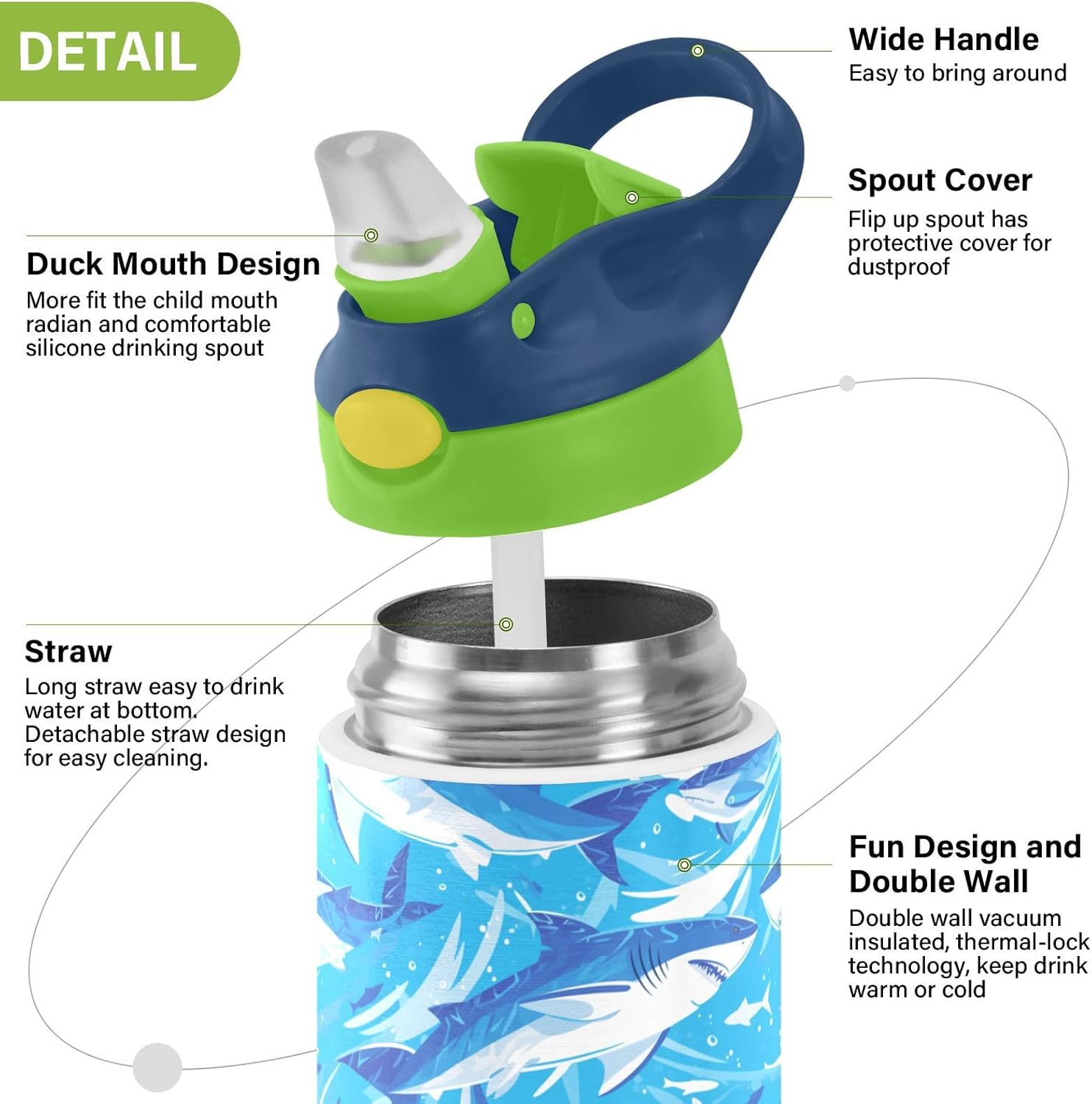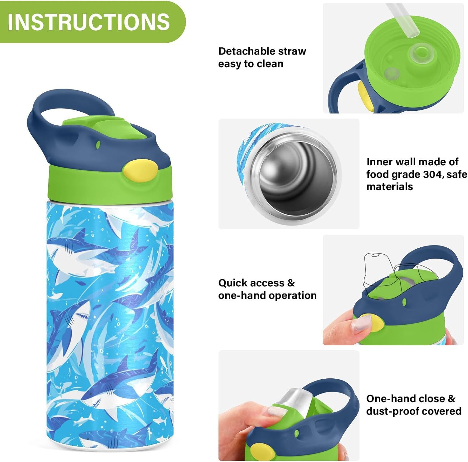 Materiali di qualità: la borraccia (19,5 x 7 cm) utilizza tritan e silicone alimentare. Ideale per pratica sportiva o picnic. Non adatta a bambini di età inferiore ai 3 anni Design portatile: l'ampio manico è facile da impugnare per i bambini e il gancio del coperchio consente di attaccare la bottiglia d'acqua agli zaini. Niente più bottiglie perse durante le gite sul campo o le attività dopo la scuola. Funzionamento con una sola mano: il becco d'anatra si adatta alla bocca dei bambini, con una copertura antipolvere. L'interruttore a pulsante della borraccia sportiva è semplice da usare con una sola mano, in modo che i bambini possano bere mentre tengono una palla o un notebook. Blocco per evitare fuoriuscite: il blocco del pulsante della bottiglia d'acqua per bambini impedisce al becco d'anatra di fuoriuscire per errore. Niente più fuoriuscite negli zaini, mantenendo il pranzo e i libri asciutti. Facile da pulire: tutte le parti della borraccia per bambini possono essere smontate per evitare l'accumulo di sporco. Pulire con detergente neutro e acqua calda.