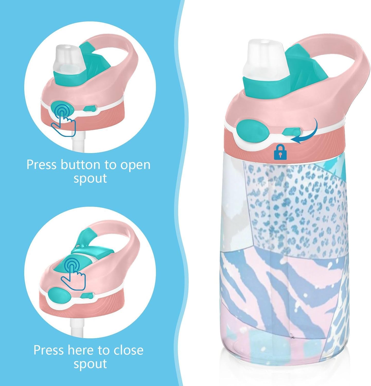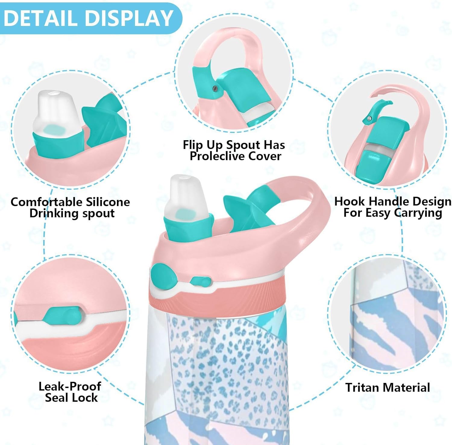 Materiale di sicurezza: il corpo in Tritan e il beccuccio in silicone alimentare garantiscono durata e sicurezza. Contiene 480 ml di acqua, perfetto per l'idratazione quotidiana. Non adatto a bambini di età inferiore ai 3 anni Design portatile: l'ampio manico è facile da impugnare per i bambini e il gancio del coperchio consente di attaccare la bottiglia d'acqua ai bambini. Niente più bottiglie perse durante le gite sul campo o le attività dopo la scuola. Uso senza problemi con una sola mano: il design a becco d'anatra si adatta alle bocche dei bambini, con una copertura antipolvere. L'interruttore a pulsante delle borracce sportive è facile da usare con una sola mano, anche quando giocano o corrono. Blocco di sicurezza: il blocco del pulsante impedisce lo scoppio accidentale del becco d'anatra. Previene le perdite quando viene gettato nello zaino, mantenendo asciutti snack e compiti. Facile pulizia: tutte le parti della borraccia per bambini sono rimovibili per una pulizia accurata senza sporcare. Usa un detergente neutro e acqua calda: semplice per i genitori mantenere la pulizia per l'uso quotidiano.